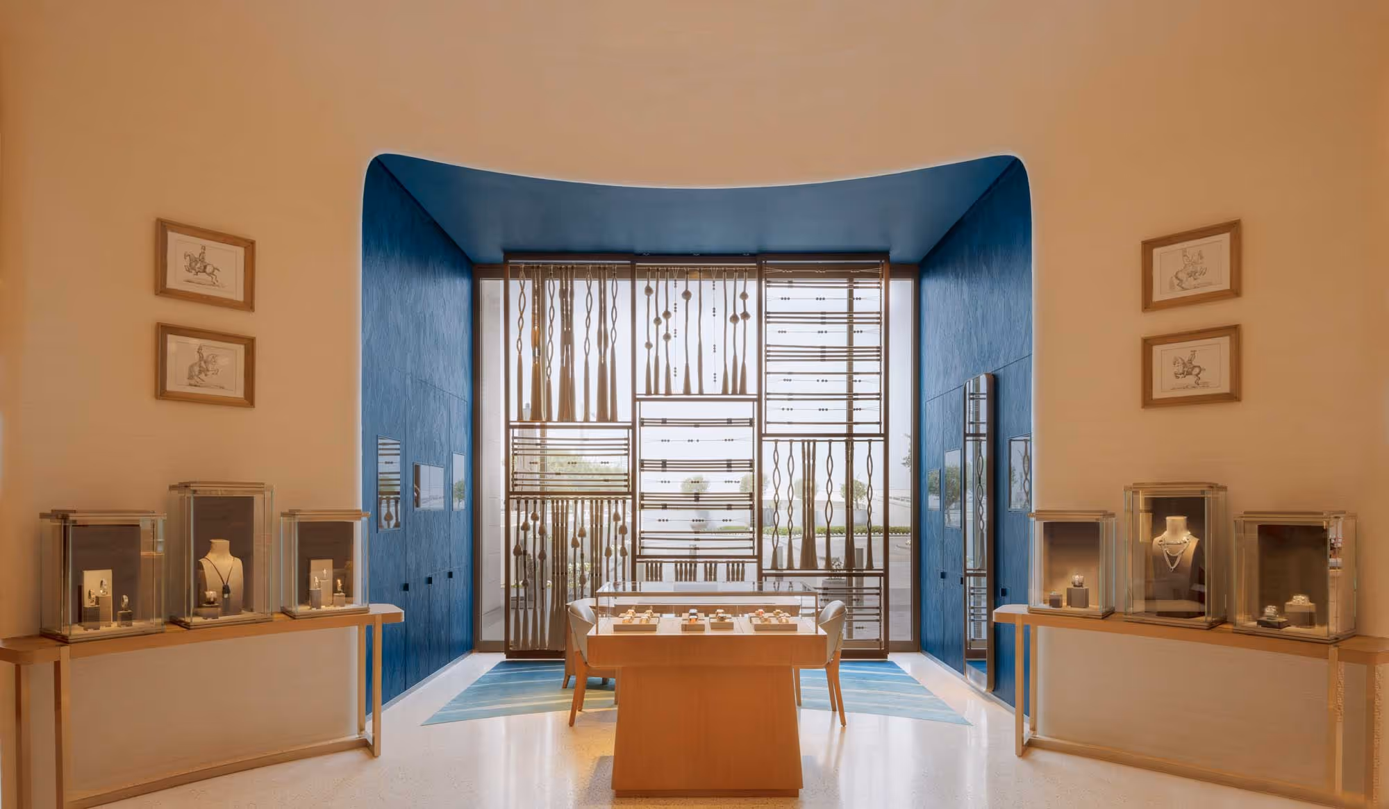تحاكي الواجھة الكتل الصخریّة، فتعید بانحناءاتھا وأسطحھا المصقولة إلى الأذھان صخوراً تشھد على مرور الزمن وعوامل الطبیعة. ویؤدّي المدخل الوحید إلى قاعة واسعة تُعرض فیھا مجموعة السیّدات الحریریّة، كما تظھر مساحة عرض للمصاغ والإبداعات الحریریّة الخاصة بالرجال من جھة، وعالم العطور والجمال من جھة أخرى. وفي وسط المتجر، ترتفع قبّةٌ شاھقة تظلّل مساحة دائریة ُمزیّنة بالكّوات ومكسّوة بورق جدران بلون داكن یجمع الأزرق والأخضر ویشكل خلفیةً لمجموعة المجوھرات والساعات وعالم الأدوات المنزلیّة. وتنقسم المساحة بین عالمي النساء والرجال، وتبرز في عمقھا الأغراض الجلدیّة، كما تظھر ألواح شبه شفّافة ابتدعھا حرفیّون محلیّون من أشكال الحبال المربوطة لتضفي جواً من الحمیمیّة ینسحب على كل حرفة، محافظاً في الآن عینه على رحابة التصمیم المفتوح. عملت وكالة RDAI الباریسیّة المتخصصة في الھندسة على تصمیم المتجر الذي یعكس بتصمیمه البیئة الطبیعیّة المحیطة.
