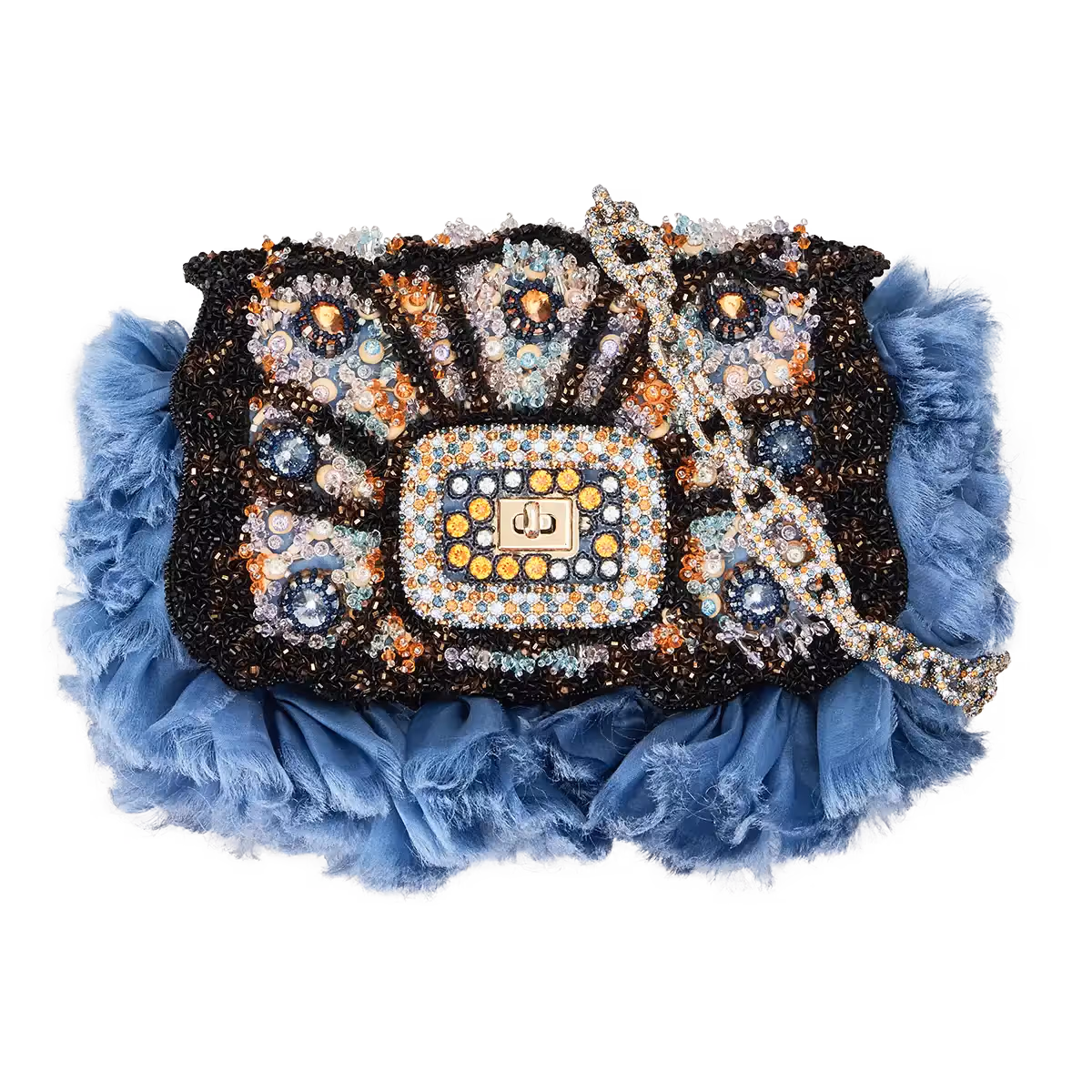 This multi-hued interpretation of the Nocturnal Butterfly (Urania) focuses on its darker qualities. Instead of capturing the light, this Pièce Unique shines in obscurity: discreet, yet deeply infatuating once noticed. To convey this subtlety, special attention has been directed to the multi-layered embroidery work. On an organza base, the abysmal dark eye pattern of the wings is stitched with black stones. Over it, an adorning net of smaller rhinestones and strass has been added. This net is complemented by blue organza, reminiscent of 19th century dresses, fringing the edges of the bag, giving it sensuous movement. The central buckle is ornamented of dark blue, sapphire light blue, and amber coloured crystals inspired by Art Nouveau jewellery. The creation of this Pièce Unique took approximately 40 hours.