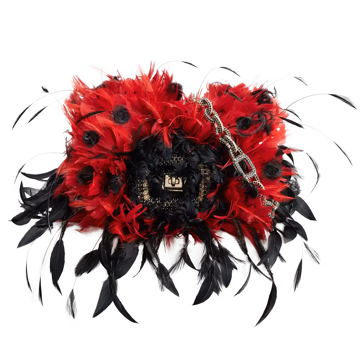 Roger Vivier, the designer, took inspiration wherever he found it: sculpture, cabarets, millinery and more. He even went as far as creating shoes designed as masks. To pay tribute to these surprising archival creations, this Pièce Unique uses feathers in a playful and unexpected way reminiscent of 12th century Italian papier-mâché masks and French burlesque shows from La Belle Epoque. To make this unique creation, different types of feathers were attached one by one on a red satin base. Each feather has been hand-worked using heat to give it a particular shape and volume. They’ve subsequently each been hand dyed and painted with every shade and dot typical of the creature of good luck. The creation of this Pièce Unique took approximately 40 hours.