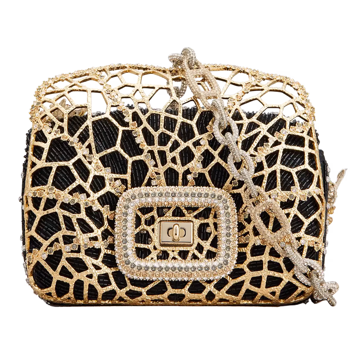 This unique piece gives reverence to the spider’s ingenious threaded ambient. Indeed, the creature’s web stands as a universal symbol of creativity, interconnectedness and meticulousness. To create this structure that is at once an enticing home and a deadly trap, the designers worked with the same diligence as the creature. The web is embodied by a metal net, made-to-measure like a dress pinned and fitted directly onto the bag. The bespoke crystal details resemble the weave’s fine silky strings adorned of droplets, as it would appear when emerging from the dusk’s haze. There are two nets, one attached to the front, another onto its flap, under them the bag’s embroidered black satin base is visible. Look closely... Will you spot the weaver onto this piece of refined jewellery work? The creation of this Pièce Unique took approximately 36 hours.