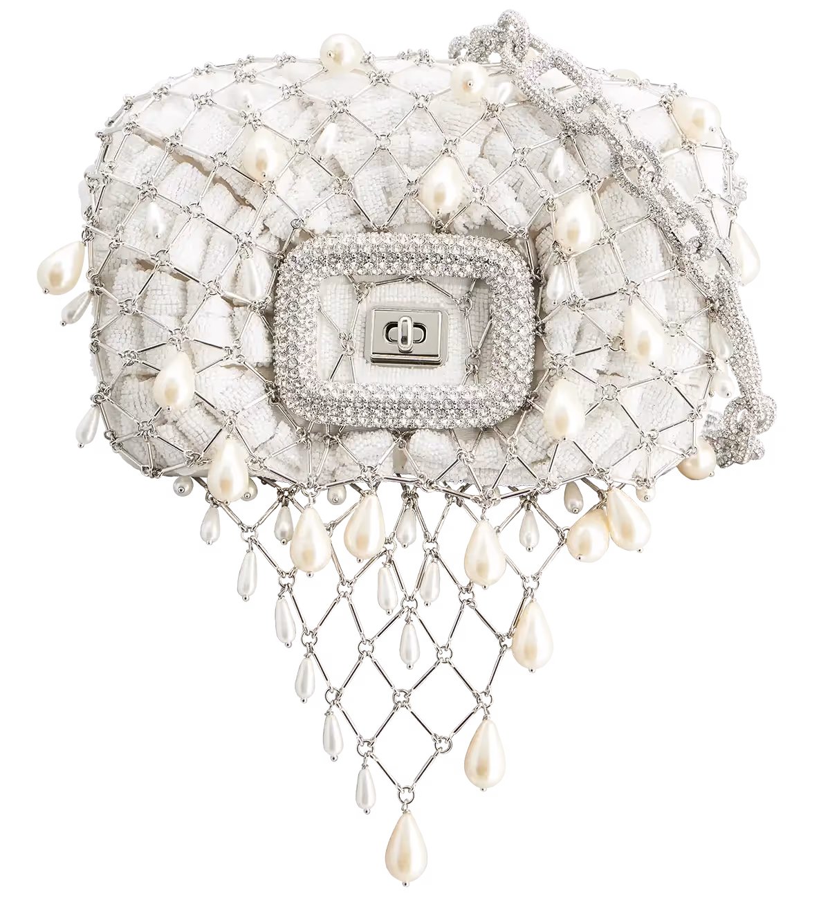 This spider-inspired Pièce Unique draws from the revered creature’s engineered ambient, its web. To create the spider’s home, the designers worked with the same diligence and meticulousness as the creature. Affixed on immaculate white satin, the web materializes as a metal net, made-to-measure like a dress pinned and fitted directly onto the bag. The structure’s adorning crystal and pearl details resemble water droplets dressing the fine silky threads, as one would naturally find them amidst the brumes of dawn. There are two nets, one on the front, another on the flap, under which the embroidered pristine satin is visible. The ingenious weaver inhabits the piece. Can you find it? The creation of this Pièce Unique took approximately 36 hours.