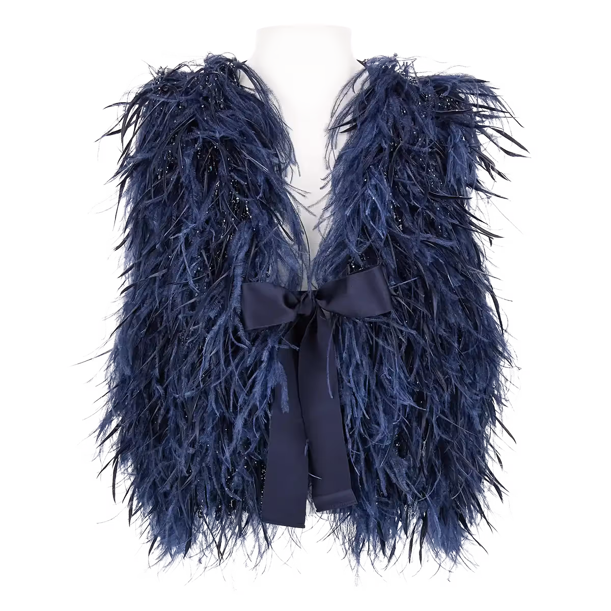A warm summer night sparked the impetus to realise this pièce unique, which arguably, is made of dreams. To create the night that ignites the firefly’s lantern, sky-blue satin with deep blue beaded fringes were chosen to compose the gilet. It is also adorned with dark blue Galeotti feathers. To imbue a feeling of grandeur to the firefly’s nocturnal exploration, the designers experimented with composition and chose to embroider all adorning elements with acute symmetry to enhance the impression of volume.