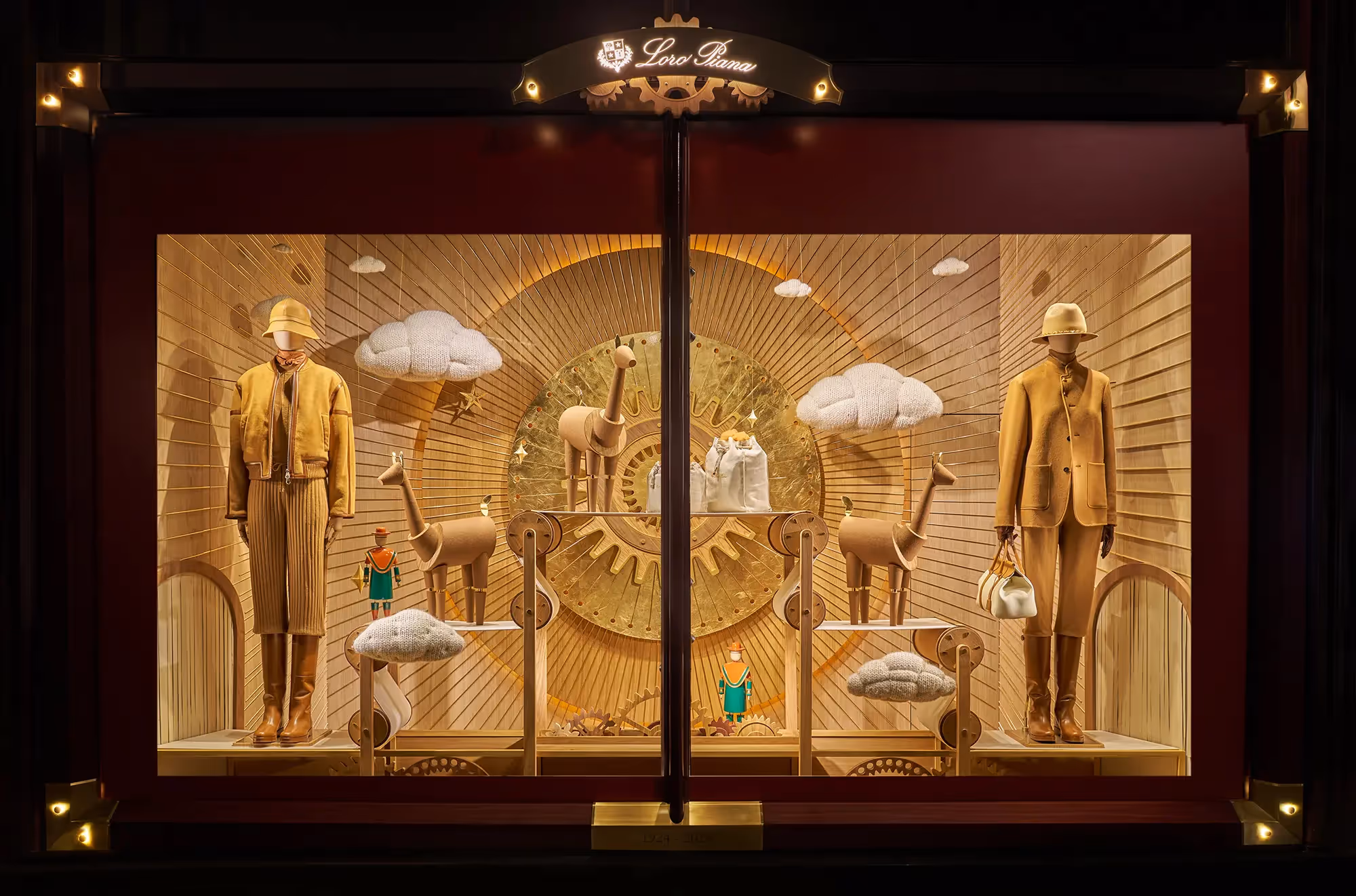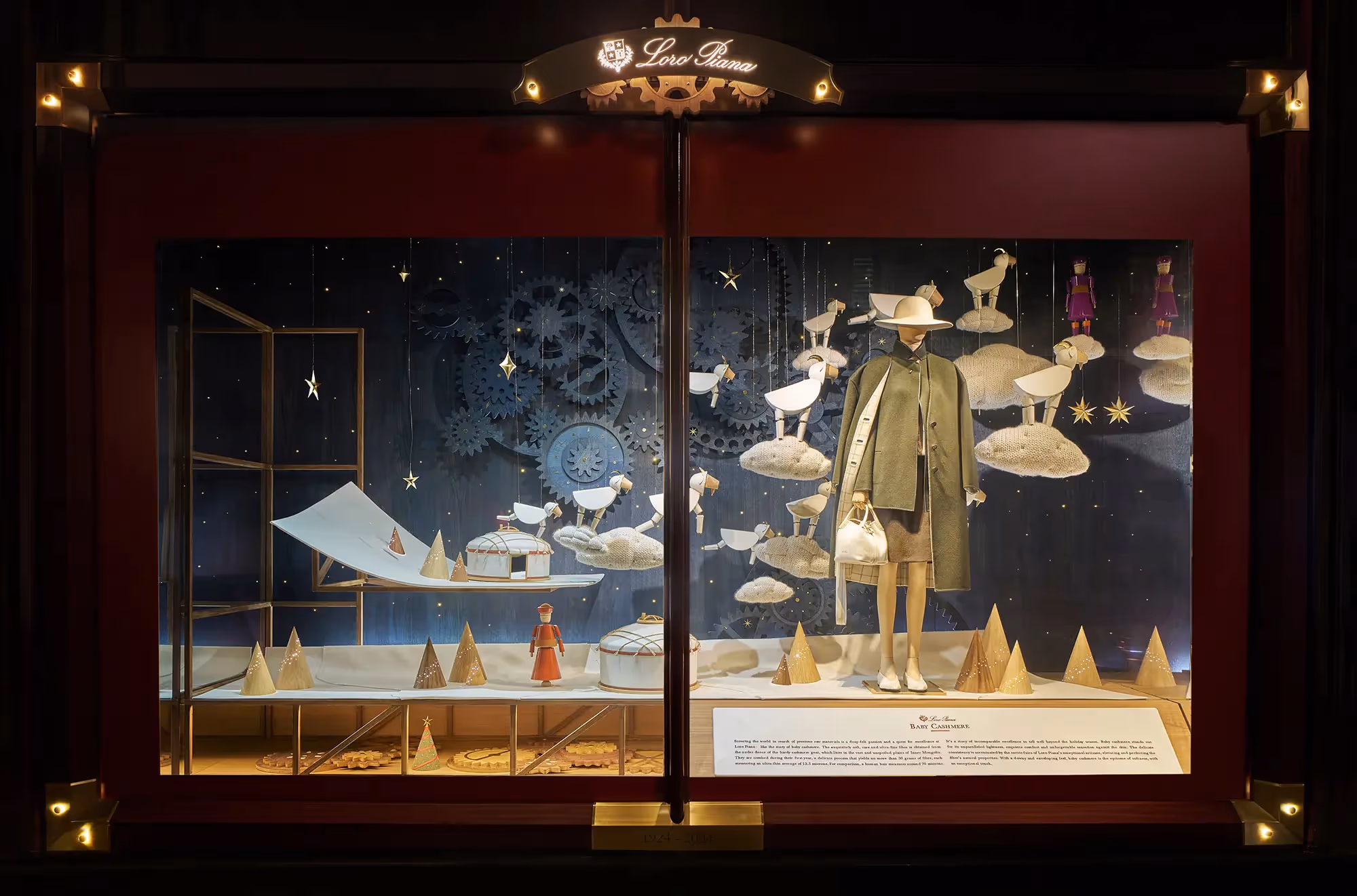 تُعدّ الواجهة المذهلة تحفة فنية آسرة، تروي خبايا إبداع Loro Piana من وحي حكايات الخيال، وتُضيء في الظلام لتعزّز من أجواء بهجة العيد. تعرض هذه النوافذ قصة ألياف الأنسجة الخفيفة مثل السحابة، التي يتم نقلها في رزم على حزام ناقل، لتتحوّل إلى قماش من خلال آلية مذهلة، وفي النهاية تتّخذ شكل شجرة عيد ميلاد بطول 17 مترًا مزينة بالأقمشة وحلة العيد الفريدة.