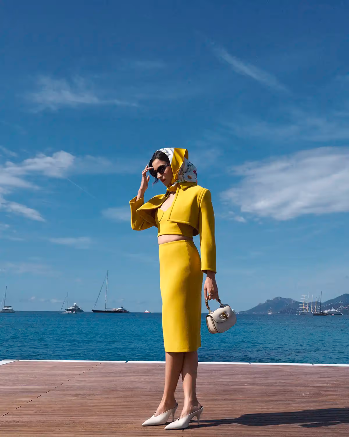 في 24 مايو 2025 بمدينة كان الفرنسية، ارتدت عليا بهات بدلة تنورة مكونة من ثلاث قطع من كريب الصوف بتصميم مخصص من غوتشي، وأكملت الإطلالة بنظارات شمسية بإطار أسود، وشال حريري مطبوع من التويل، وحملت حقيبة Gucci Bamboo 1947 من الجلد الأبيض.