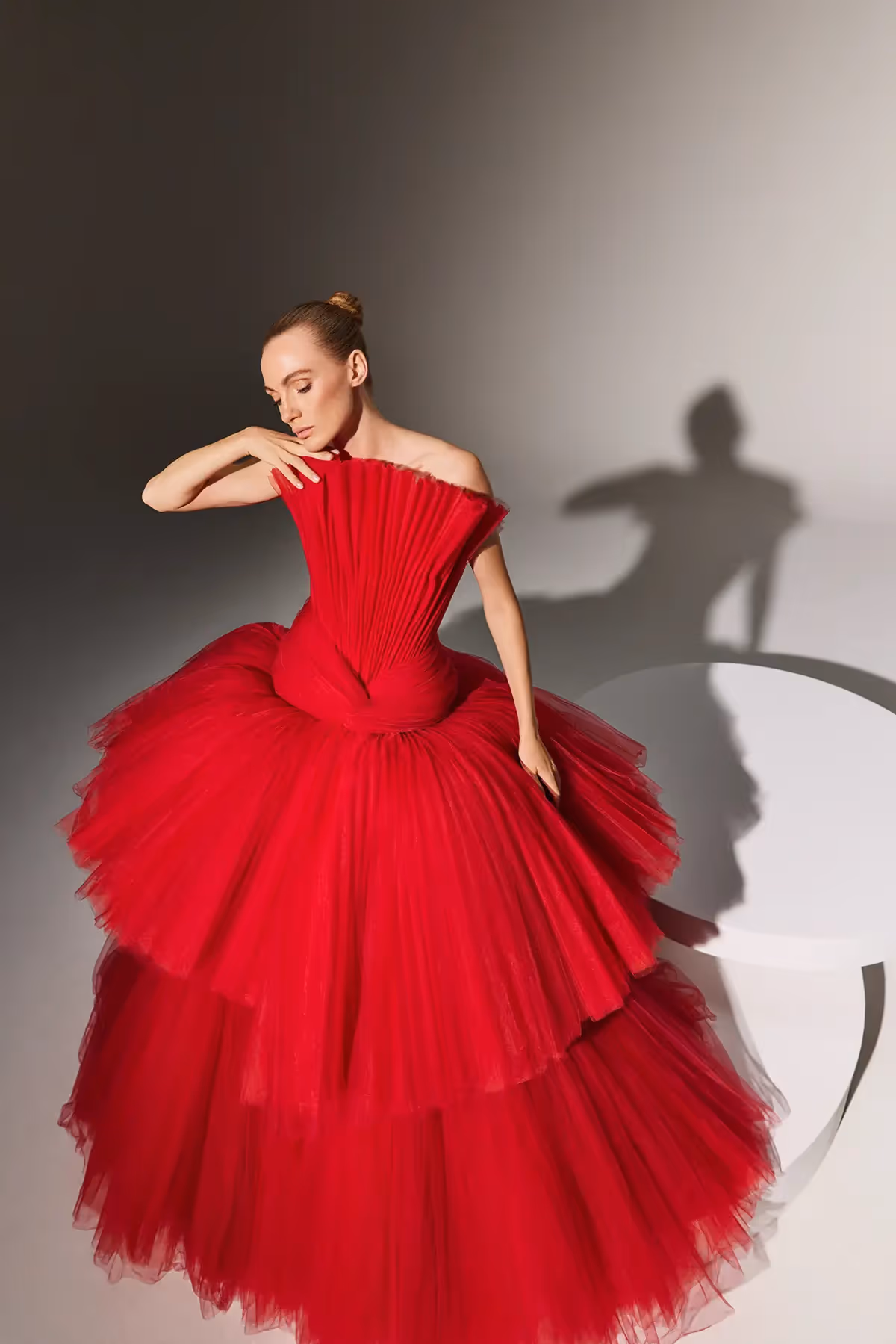 وتحتفي التشكيلة بمفهوم الأناقةالعصرية، إذ تكشف عن إطلالة Red Coral التي تضم مجموعة من القطع المصممة من الساتان الحريري المزدوج باللون الأحمر وغيرهمن المواد الفاخرة، وتتألق بقصة مستوحاة من فن الأوريجامي، إلى جانب البطانةالداخلية المزينة بالكريستال والترتر الناعم المطرز يدوياً. أما تفاصيل الكورسيهالمصنوعة من قماش التول الشفاف، تمنح لمسة رقيقة عند الخصر، كما تضيف التنانيرالواسعة من الساتان المجدول طابعاً حيوياً إلى الإطلالة. وتسلط هذه القطع الضوءعلى شغف قزي واسطا بالتجريب والإبداع في الأقمشة لتقدم دوماً منظوراً جديداًللأزياء الراقية.