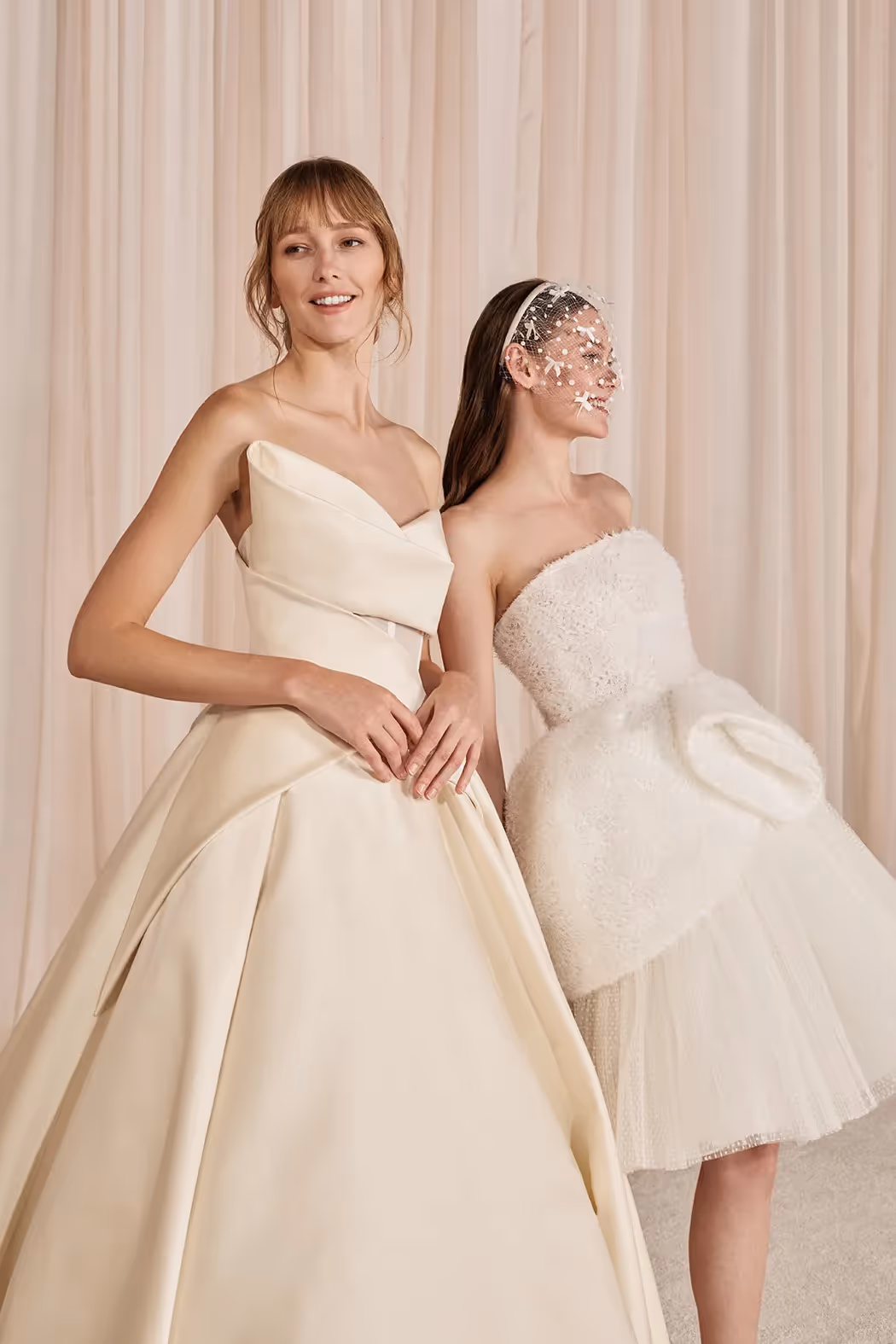 وترتقي التصاميم بفساتين الزفاف إلى آفاق إبداعية خارجة عن حدود التقاليد، فهي تمزج بكل تناغم بين الأقمشة والأشكال والتقنيات، بدءاً من قماش الساتان الفاخر والدانتيل المزين بالثنيات المرقّطة إلى الكريب والمخمل الراقي وتفاصيل الأربطة الملونة والمنسقة بشكل فريد، إضافة إلى القصات المنحوتة عند منطقة الصدر والكشكش المتدلية من الخصر والأبعاد الجمالية، التي تضيفها عناصر مثل الأورجانزا الشفافة بلمسة موشحة أو بنقشة الأزهار، إلى جانب البروكاد والترتر المطفي والدانتيل والطبقات القماشية المتراكبة بدرجات العاجي.