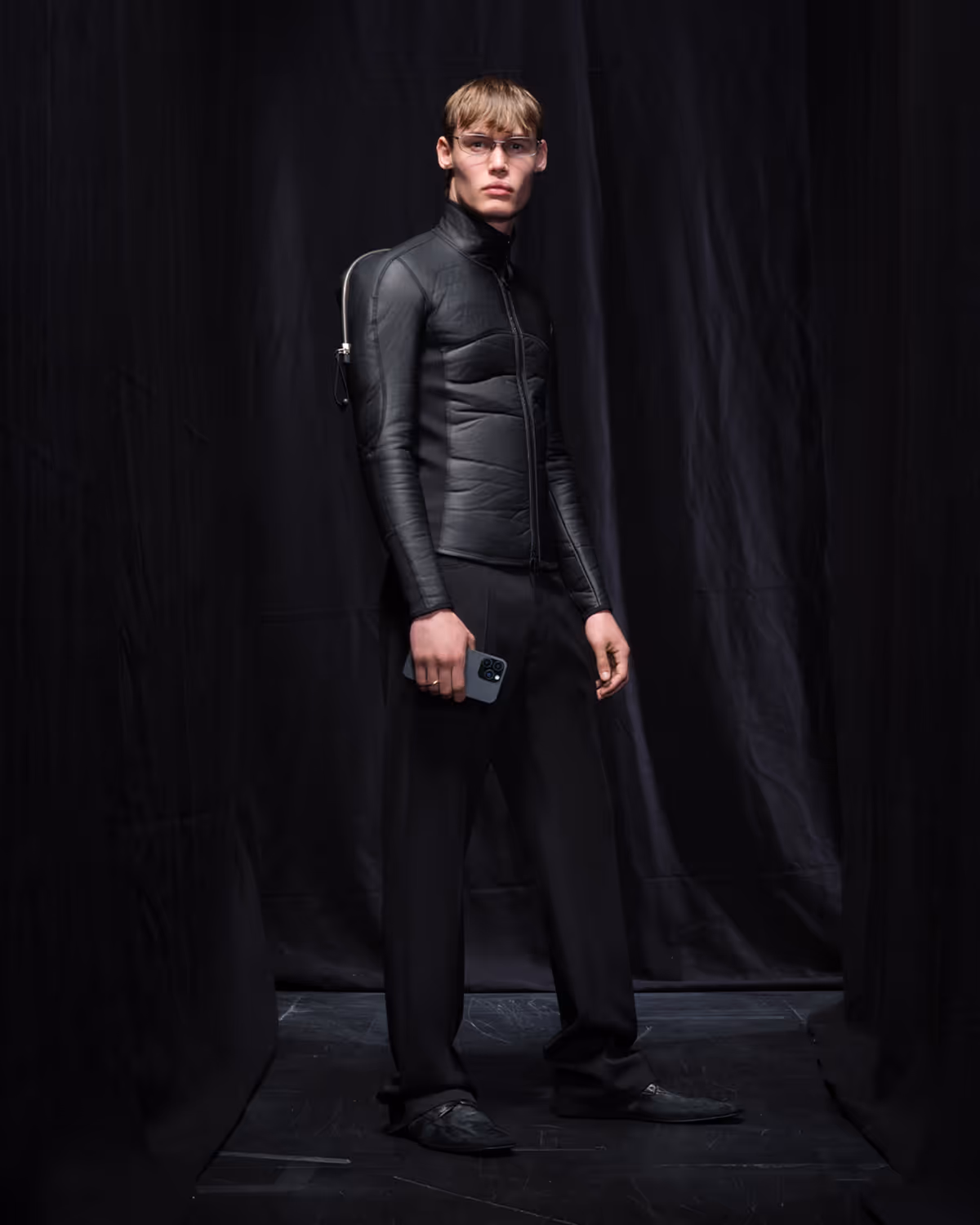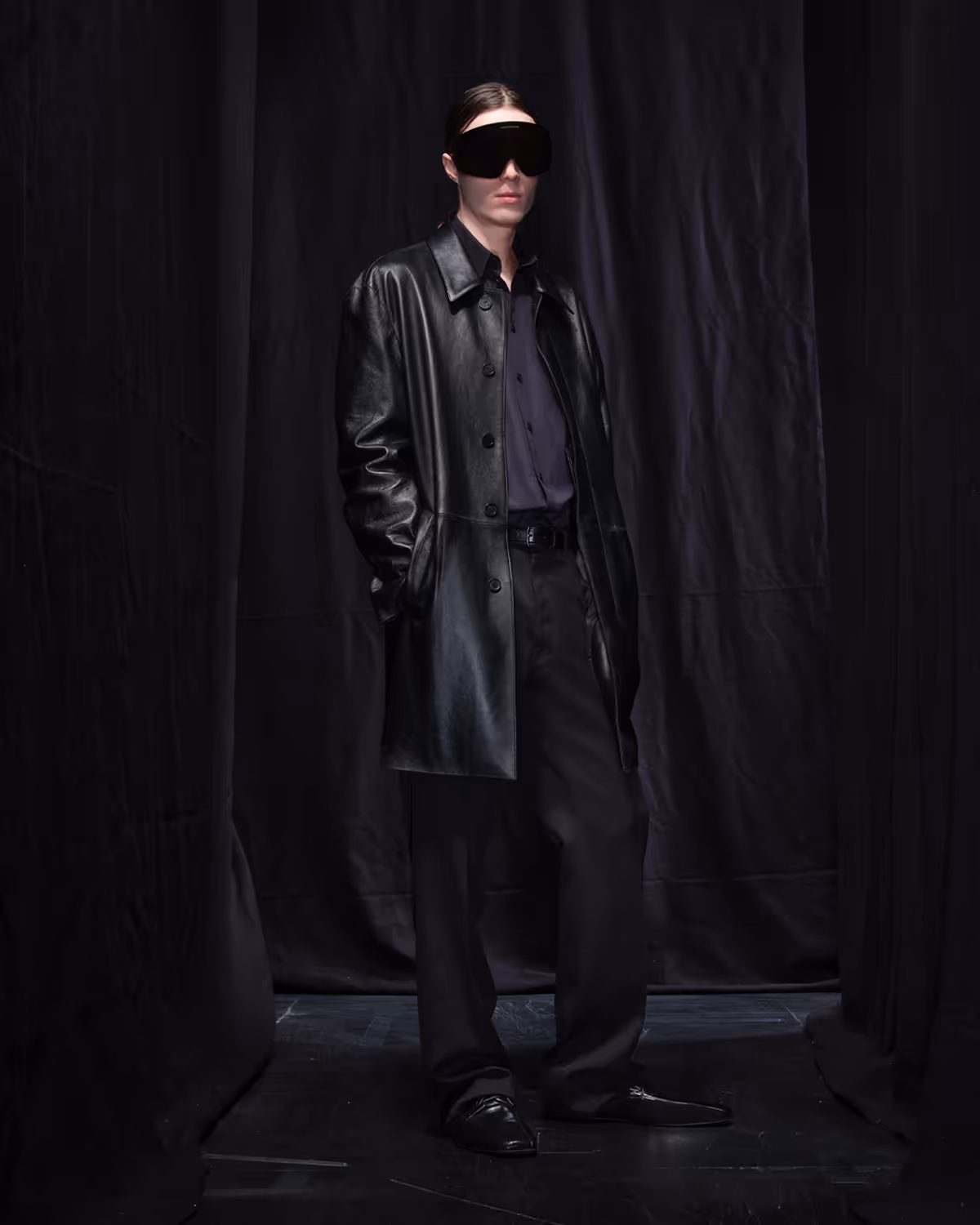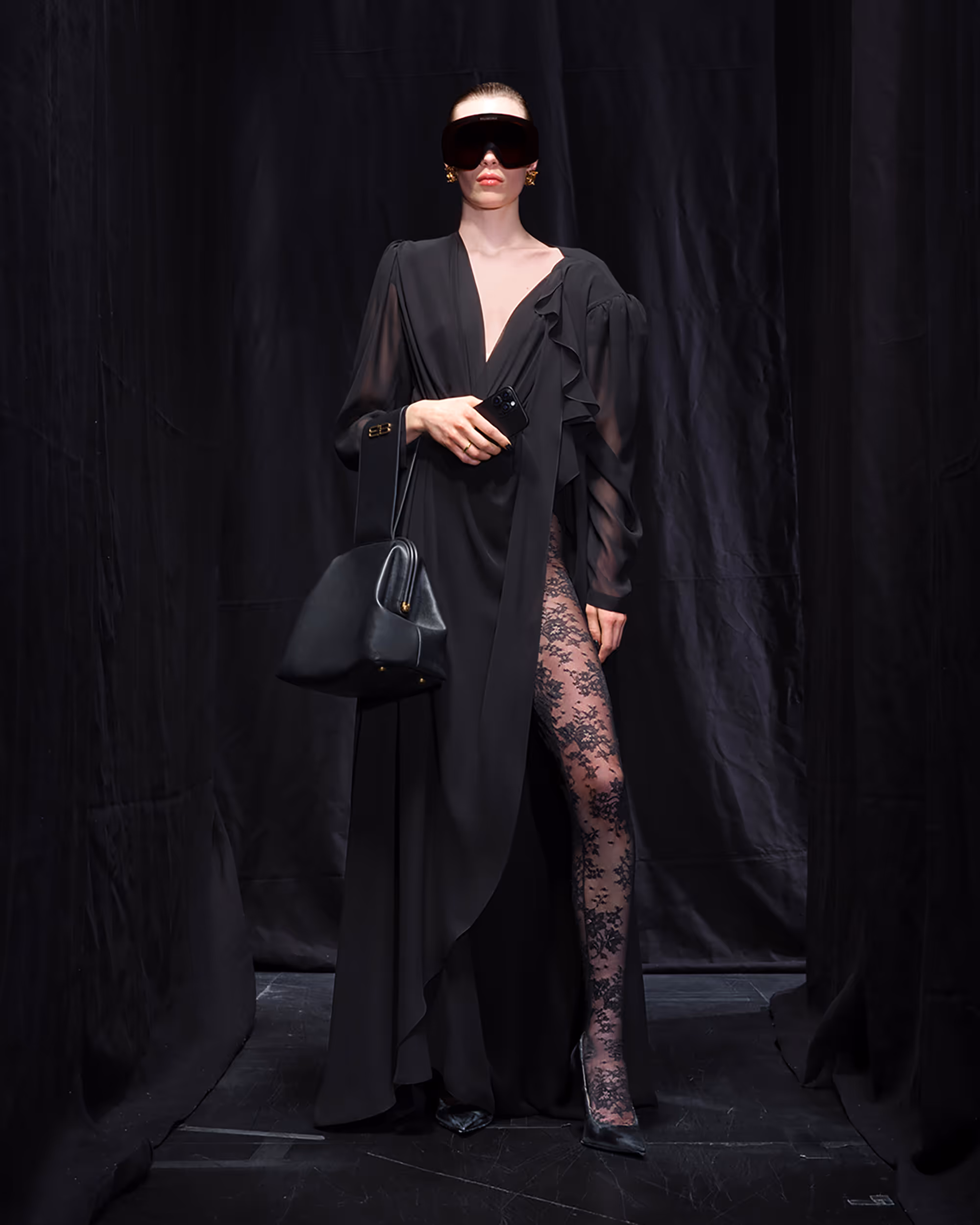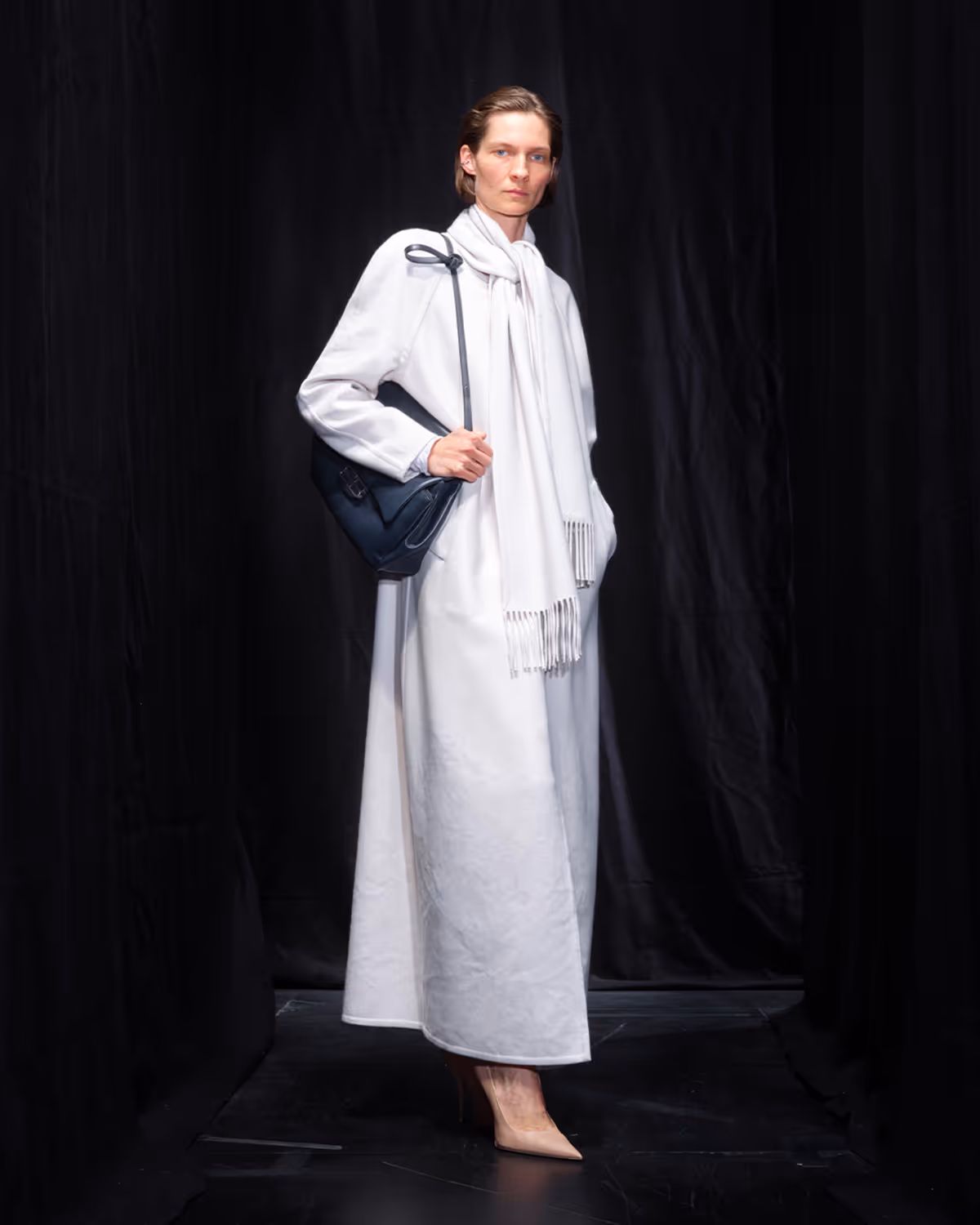 معطف بيج من الكشمير مزدوج الصدر بأزرار مكسورة، ومعطف من الكشمير الكريمي مزدوج الواجهة يحتوي على ياقة مدمجة على شكل سكارف. يظهر زي ذو سحاب ربعمن الخلف للأمام، يكشف عن فتحة صدر مزودة بسحاب، تذكرنا بتصاميم بالنسياغا ل"Bunny Mellon”. تدمج التركيبات المرفوعة والداعمة في الملابس القياسية: معاطف بافر من النايلون بغطاء للرأس يتماشى تماماً مع الأحزمة المنحنية، قميص من البوبلين، وسترة جلدية بأكمام راكب الدراجة مستوحاة من العصر الفكتوري وكنزة موليتون بغطاء للرأس.