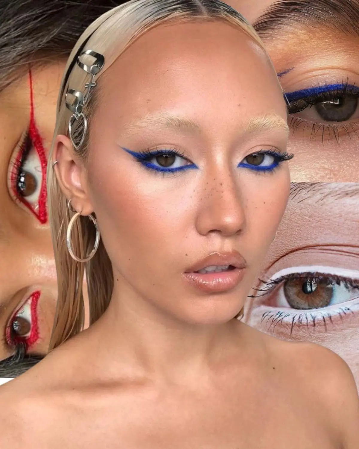 صيحة جريئة قلبت معايير الآيلاينر التقليدي. بدلاً من رسم الامتداد على الجفن العلوي، يتم التركيز على الجفن السفلي مع سحب الخط للخارج لمنح العين شكلاً ممدودًا بطريقة لافتة.