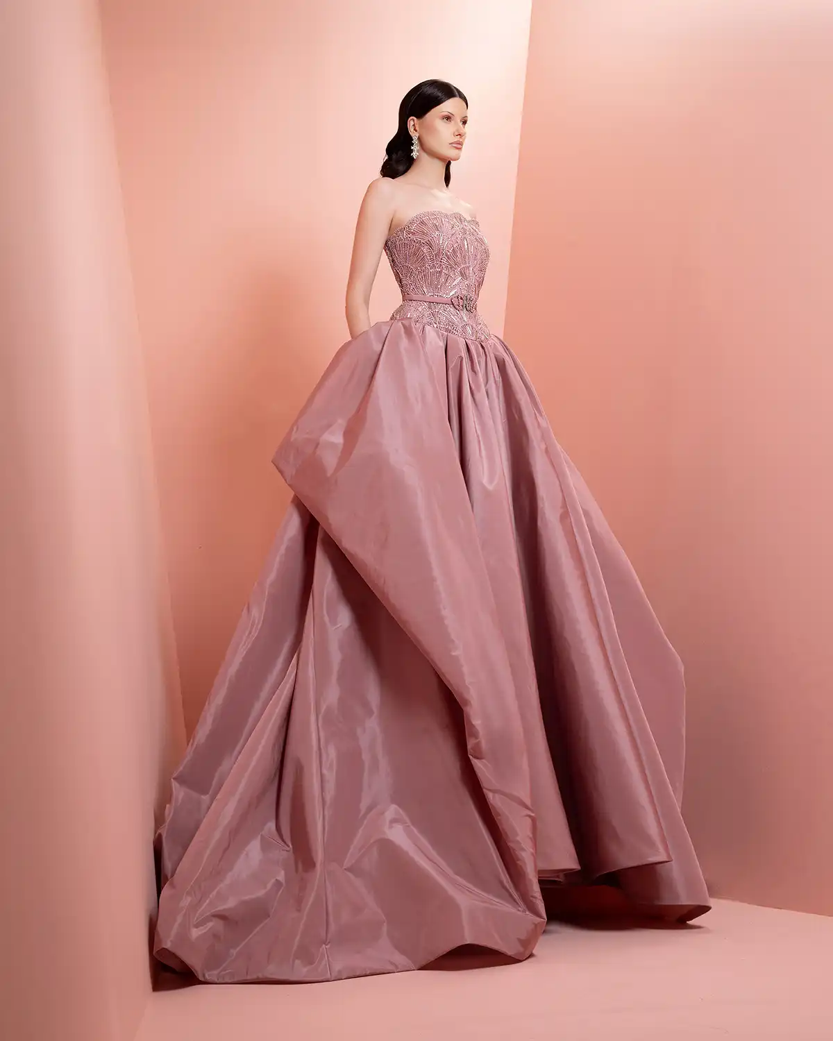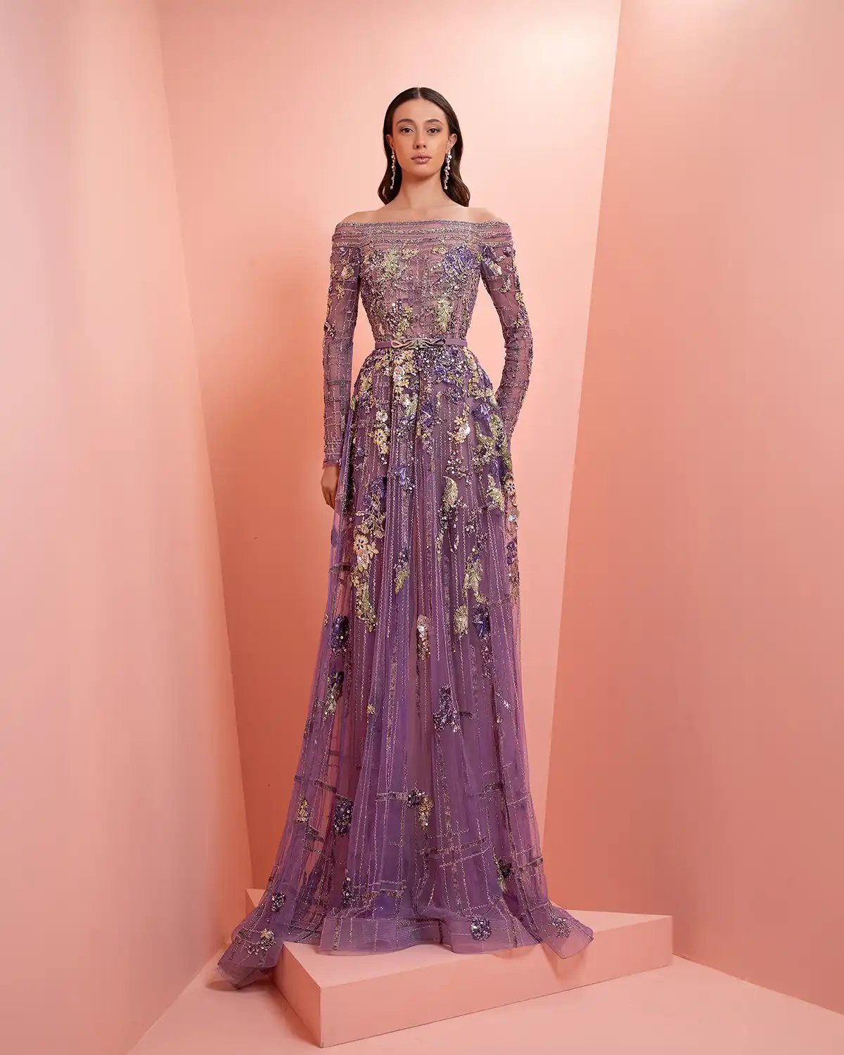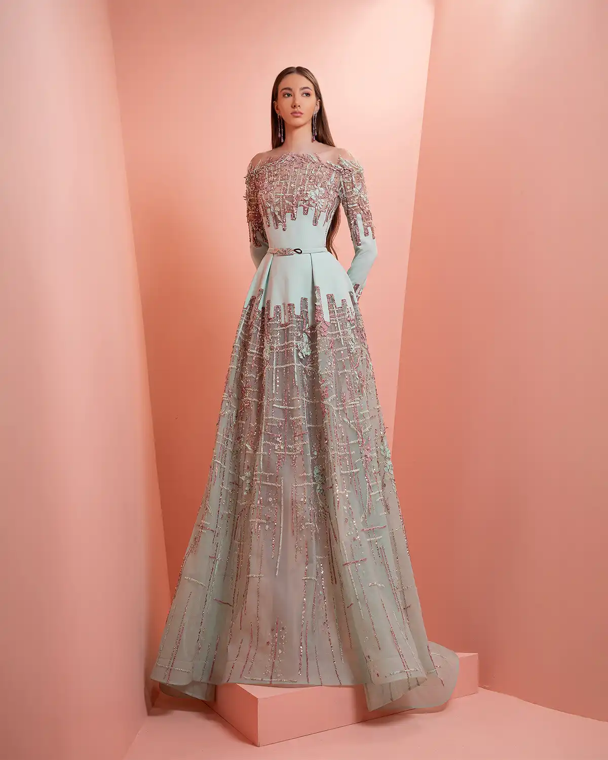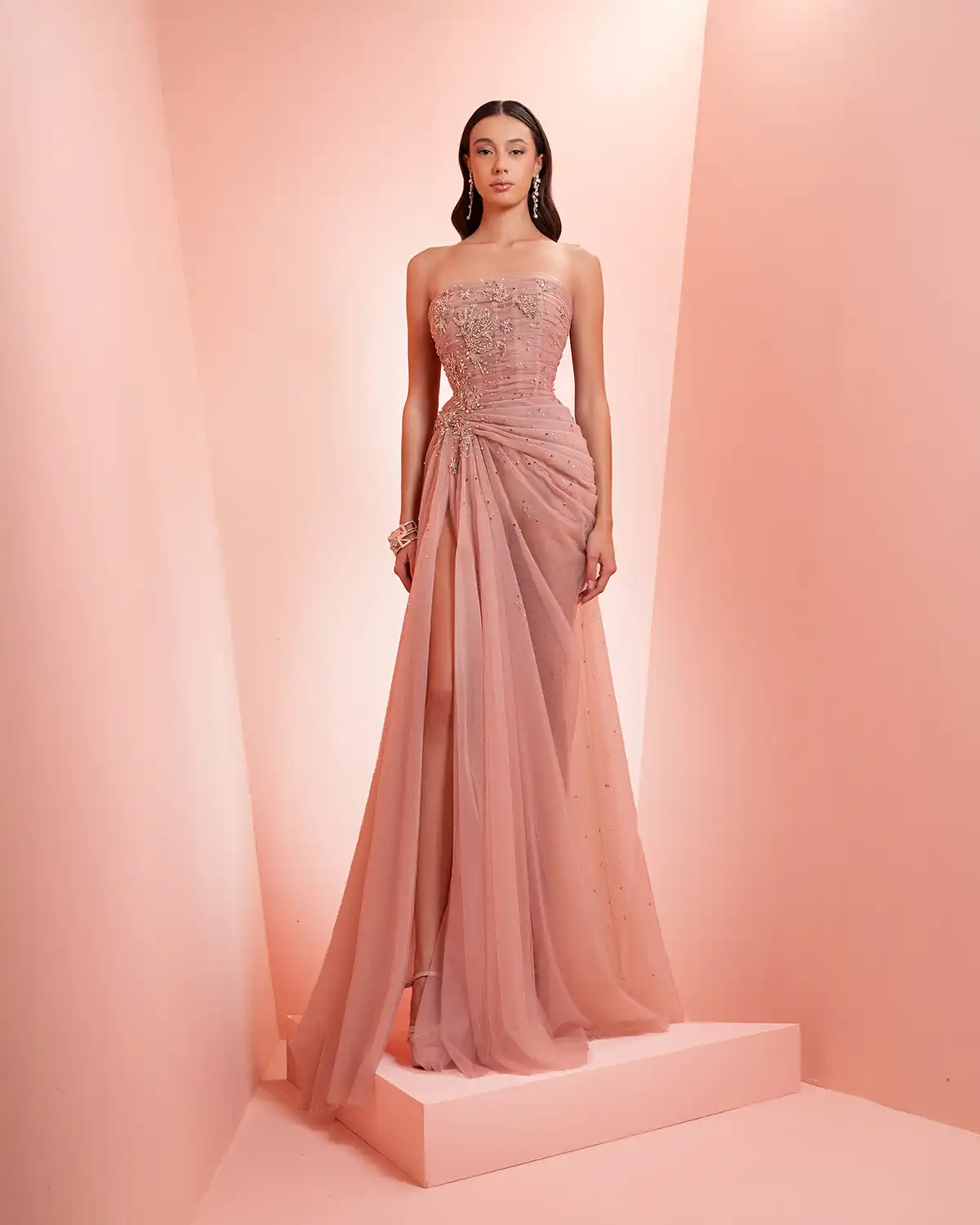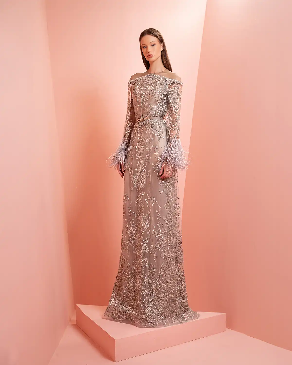 يحمل اسم المجموعة "NUANCE" أكثر من معنى، إذ يعكس مفهوم التدرّج على مستويات عدة. يظهر ذلك أولاً في الألوان التي تتنقل بين الدرجات الفاتحة والقوية أو تمتزج بانسيابية داخل القطعة الواحدة. كما يتجلى التدرّج في الأقمشة المستخدمة، من الكريب والشيفون إلى التول والدانتيل، مرورًا بالريش الذي يضيف لمسة حالمة ودرامية، وصولًا إلى التصاميم المزدانة بالشك والتطريز اللامع التي تضفي بريقًا ناعمًا.