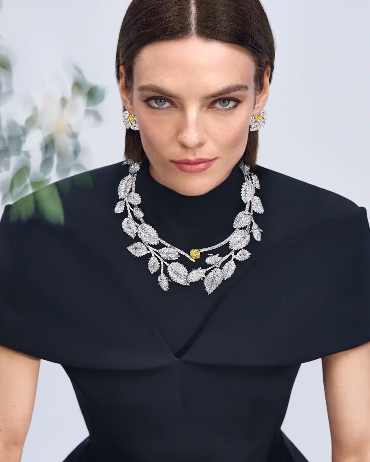 في تجسيد لتُراث الدار، يأتي طقم Wild Rose "وايلد روز" مُستوحى من إحدى روائعها التي تعود إلى عشرينيّات القرن الماضي: تاج أوراق الورد البري، الذي صمّمه جوزيف شوميه في عام 1922. وهو يتميّز بدقّة نباتيّة تُجسّد فيها اللآلىء الطبيعيّة براعم مُغلقة. أما طقم المجوهرات العصري فيأتي مُرصّعاً بماسات صفراء رائعة، مثل الحجر الأصفر الزاهي ذو درجة نقاء VS2 ووزن 8,23 قيراط، الذي يُزيّن قلادة يمكن ارتداؤها بثلاث طرق مُختلفة، جميعها بمشبك واحد، تطلّب تنفيذها حوالي 1500 ساعة في المُحترف. وقد تمّت مُطابقة الاقتراح الأكثر تطوراً للأوراق المُفصّلة مع بعضها البعض من خلال بديل أكثر بساطة في شكل حلية مُرصّعة بالماس. يُساهم القطع المُربّع الذي يُبرز جمال الحجر في تزيين خاتم قابل للتحويل تتفتّح عليه بتلات مُسنّنة بدقّة. وفي قلبه ألماسة صفراء زاهية فاخرة ذو نقاء VS1، ووزن 5,02 قيراط، يمكن ارتداؤه كخاتم مُنفرد. وتتألّق الأقراط المُطابقة بماستين باللون الأصفر القوي وزن كل منهما 2,60 و2,68 قيراط، في تعبير إضافي عن هذه الطبيعة الفخمة والملوّنة.