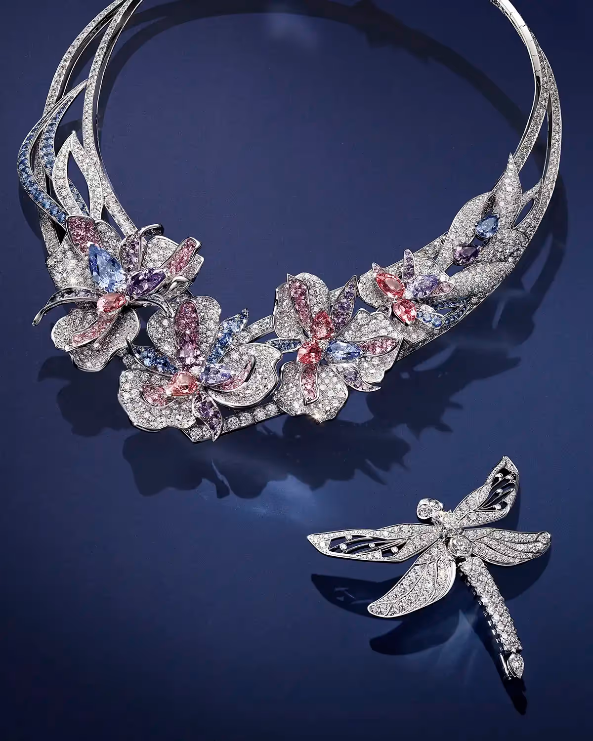 إذا كانت مجموعة Le Jardin de Chaumet "لو جاردان دو شوميه" للمجوهرات الفاخرة، قد قدّمت تفسيراً للزهرة التي تبدو شهيّة، مُبرزةً ملمسها الرائع. فإن مجموعة Jewels by Nature "جواهر من الطبيعة" تُضفي شاعريتها. ينسجم التأثير السحري للأحجار الكريمة المرصوفة مع اسم هذا النوع. خمس زهور منحوتة بدقّة من الذهب، بتلة تلو الأخرى، تستقر على أنهار من الماس المُتشابك، مُبرزةً درجات الباستيل من أحجار السبينيل الفيتناميّة الزرقاء والأرجوانيّة والورديّة بوزن إجمالي يبلغ 24,36 قيراط، تتفتّح زهرة السوسن أيضاً على خاتم غير مُتماثل مُرصّع بحجر سبينيل أرجواني جميل عيار 6,10 قيراط، يتناغم مع أقراط مُتدلّية ساحرة. وبتناغم رقصتهما الهوائية الخاصة مع الزهرة التي تُحرّكها الرياح، تتحوّل اثنين من اليعسوب إلى بروشين، إحداهما مُتألّقة بالياقوت الملوّن، والثانية مُتلألئة بالألماس بمخالب على شكل قطرات مطر.