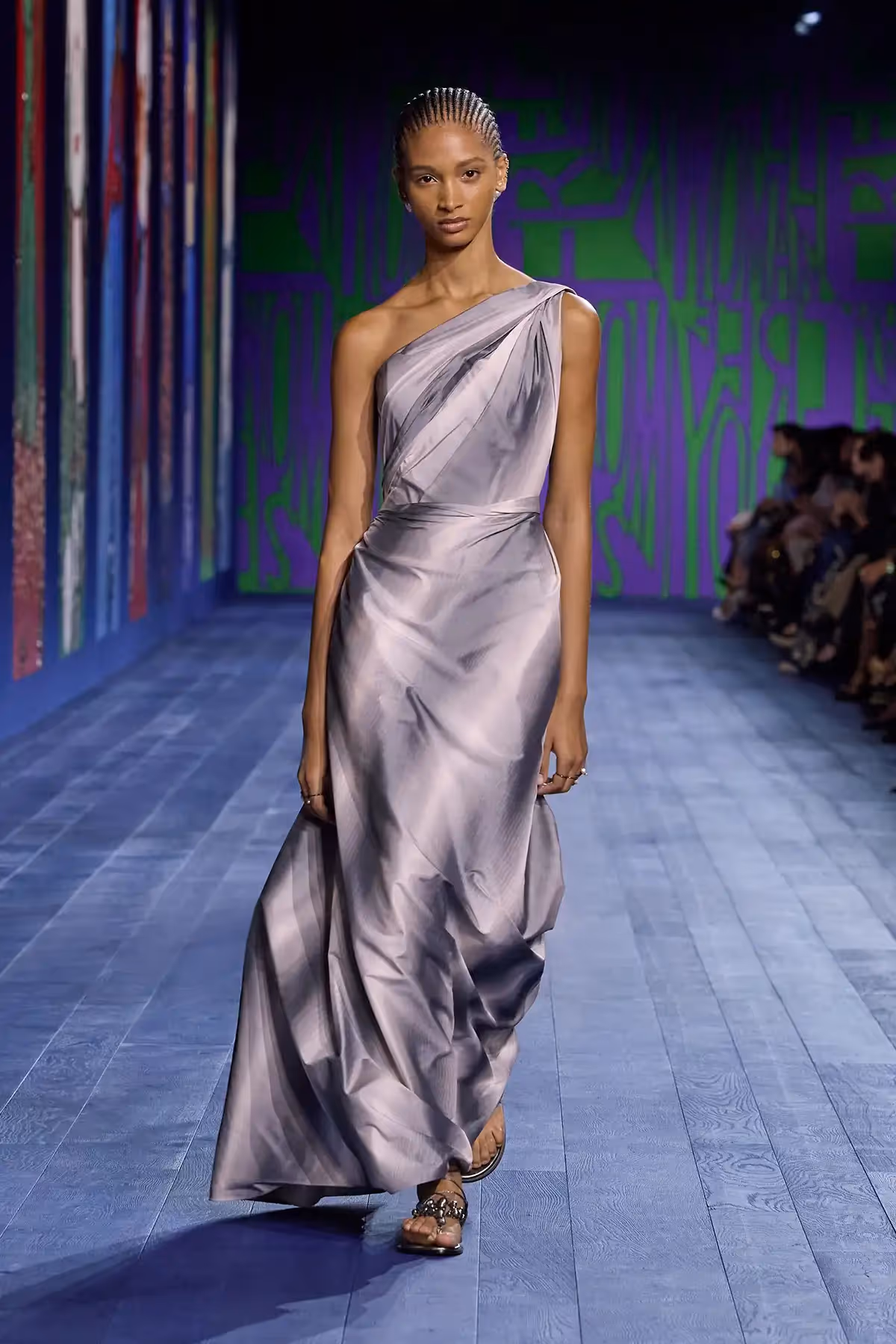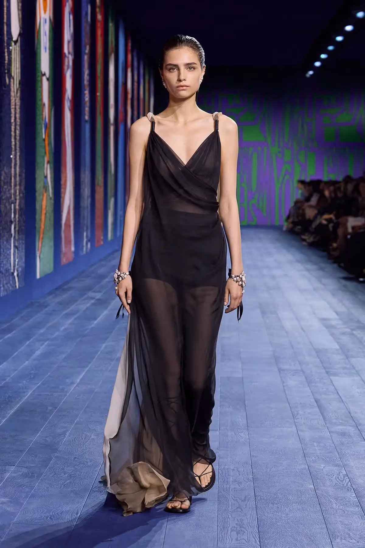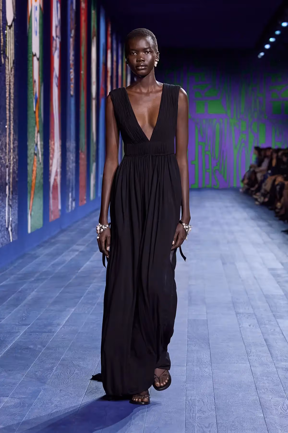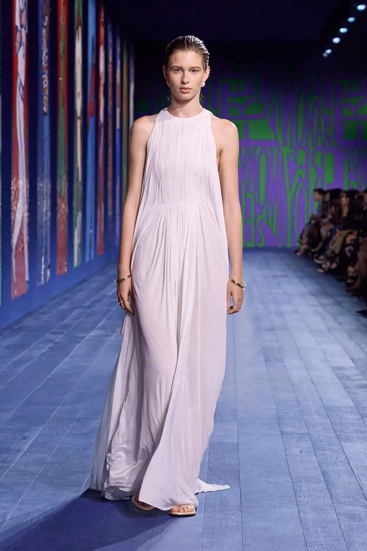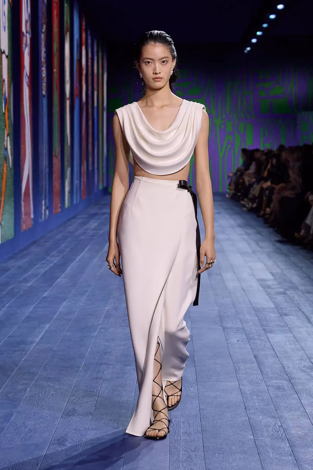 في هذه المجموعة، تعود صيحة الثنيات إلى الواجهة في العديد من القطع، بحيث تمّت خياطتها أو تُركت مفتوحة لمرافقة الحركة. ويهيمن أسلوب الـ"درابيه" على منصّة العرض، باعتباره إشارة بصريّة إلى التماثيل الكلاسيكية، فيظهر على الفساتين الحريرية المُعزّزة بالتطريز، والتنانير ذات الطابع القديم بحبك الجاكار وتأثير "مواريه" moiré، فضلاً عن الأطقم المؤلّفة من تنورة ملفوفة بأسلوب الـ"درابيه" وسروال يتكشّف تحتها أثناء المشي، والفساتين المستوحاة من الآلهة، التي تتدلى من كتف واحد وتظهر تحتها قمصان بدون أكمام مصنوعة من قماش معدني شفاف ومزخرفة بالساتان. ويتمّ الارتقاء بقميص رياضي من قماش الجيرسي إلى مستوى التصاميم الراقية "كوتور" من خلال دمج الأوراق الذهبيّة أو الزينة البرّاقة الصغيرة. أمّا اللون الأحمر، "لون الحياة" بحسب "كريستيان ديور"، فيزيد من روعة العرض؛ يبتعد رداء الحمام عن وظيفته التقليديّة لنراه هنا يزدان بالفسيفساء بتأثير المرآة.