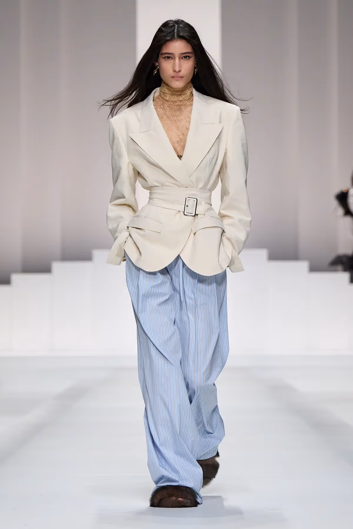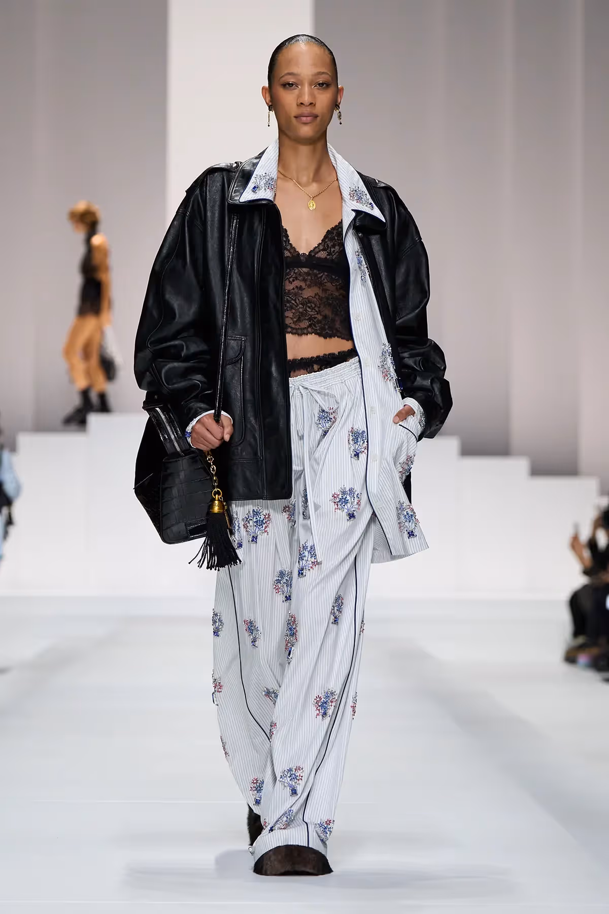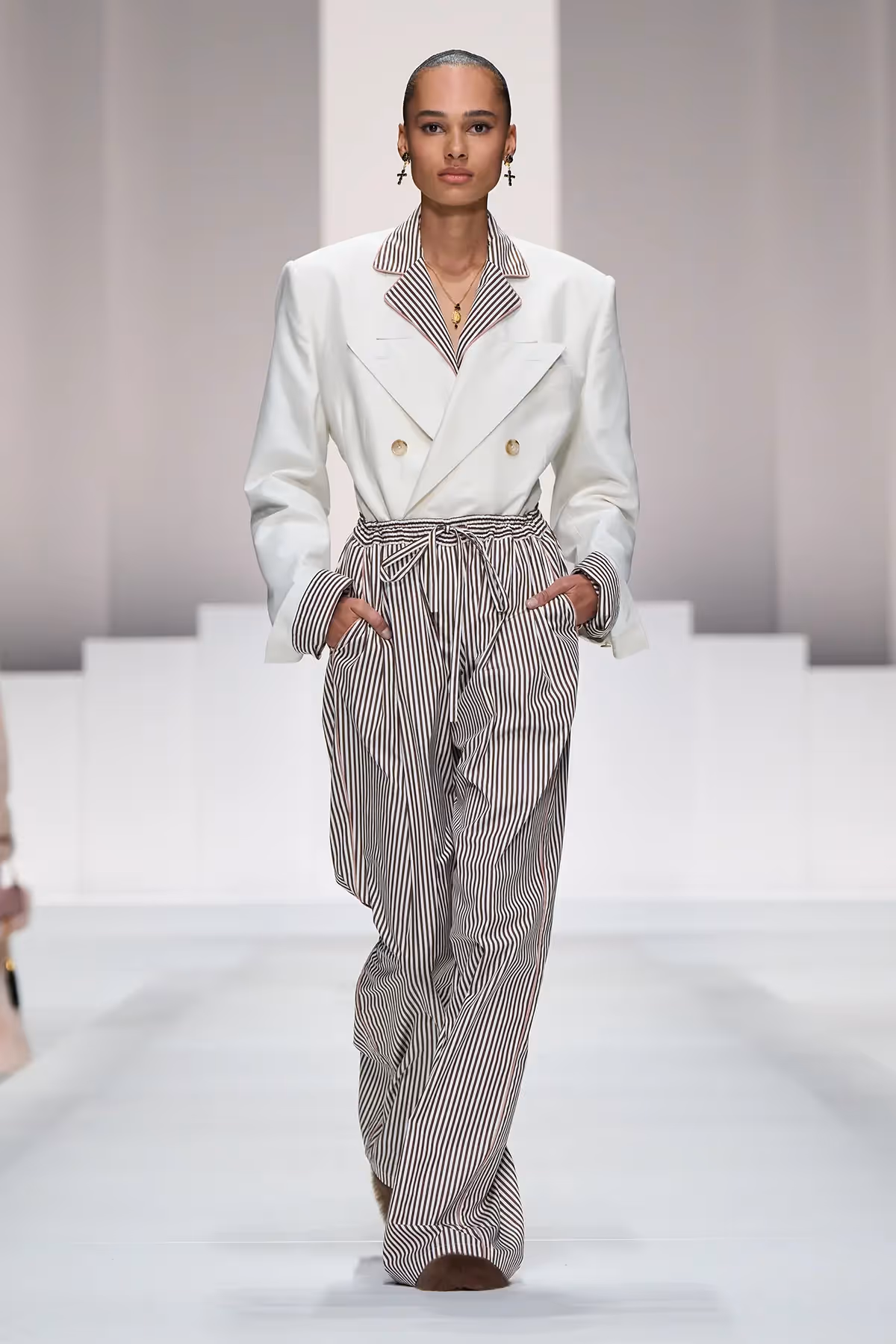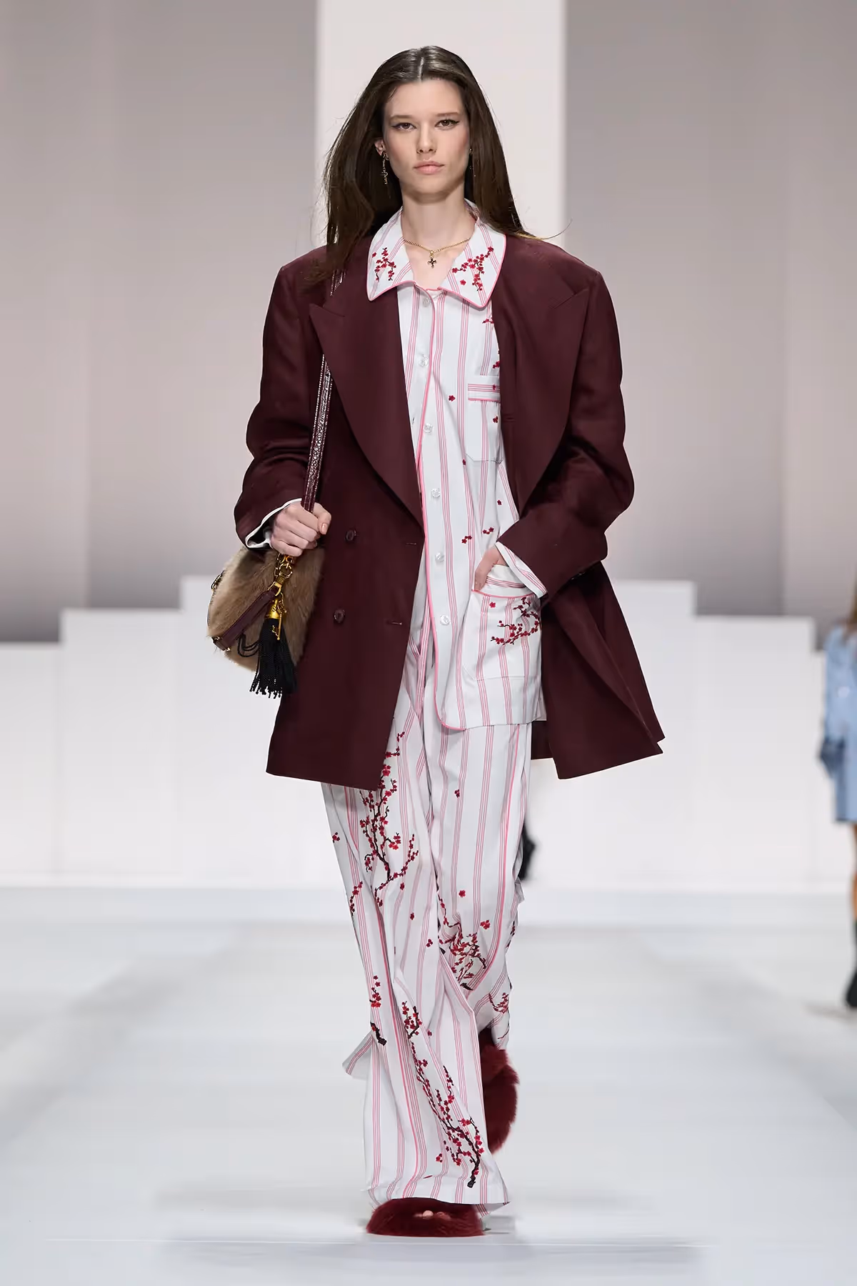 التفاصيل الصغيرة تصنع الفارق، جاكيتات مصممة بدقة مع أكتاف بارزة، بدلات توكسيدو تجمع بين السلطة والإغراء، وطبعات الحيوانات التي تضيف روحًا متمردة مليئة بالطاقة. كل لون، من الأبيض النقي إلى الأسود العميق مرورًا بالألوان الترابية الغنية والبوردو، يساهم في رسم لوحة متكاملة من الأناقة المعاصرة.