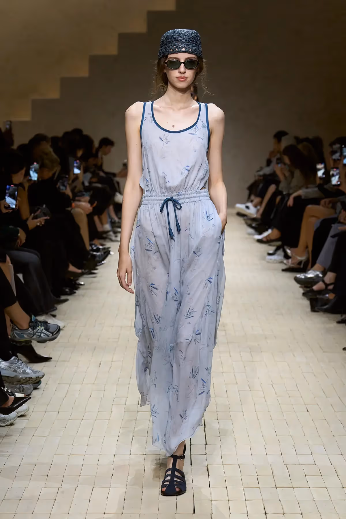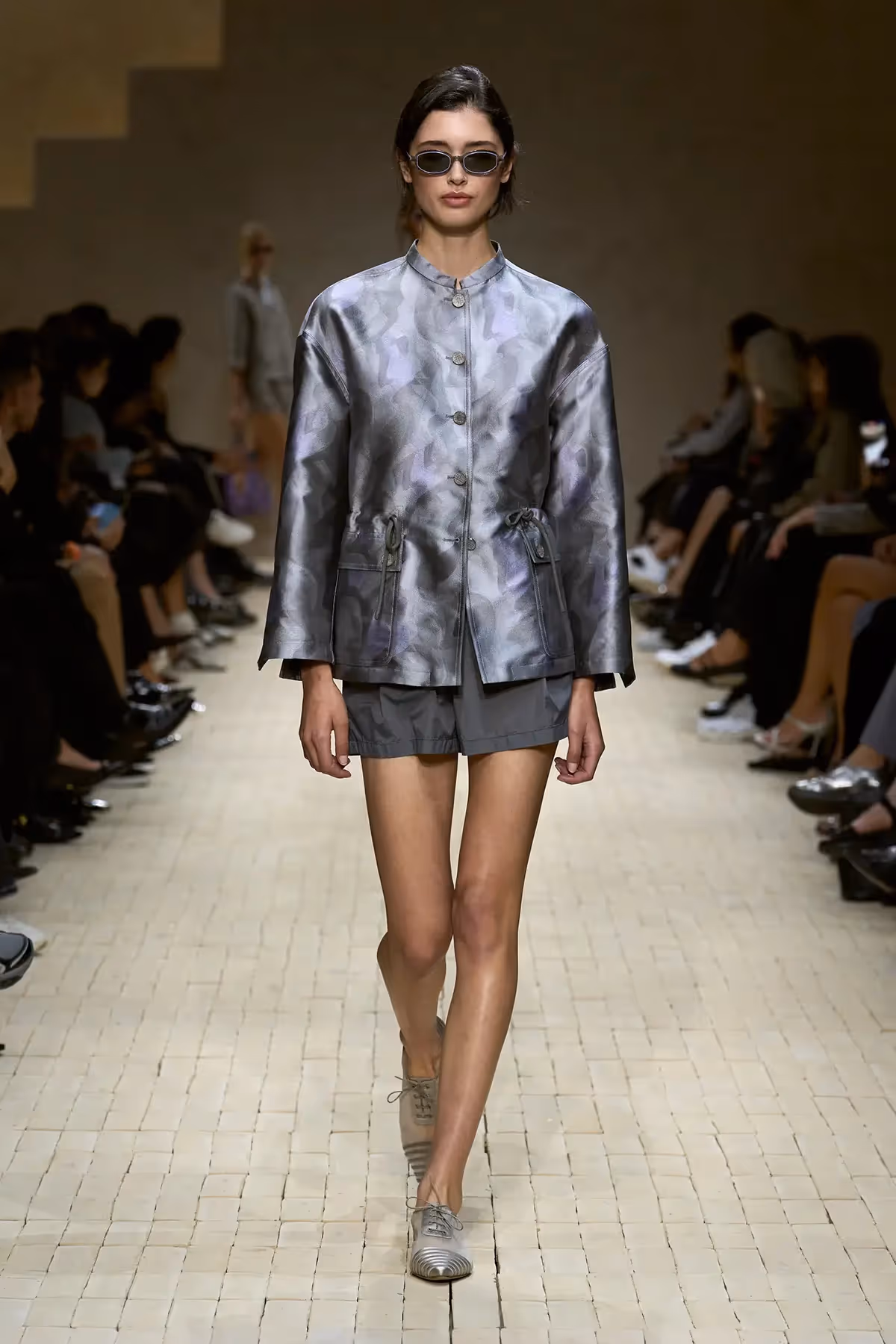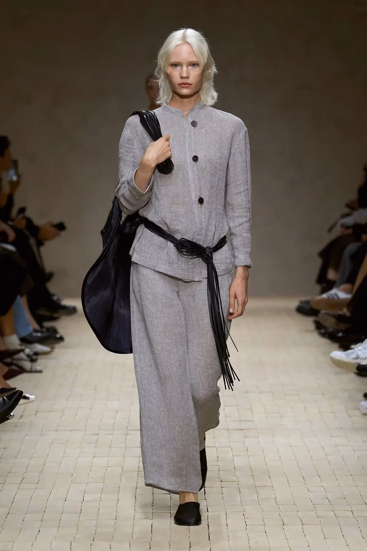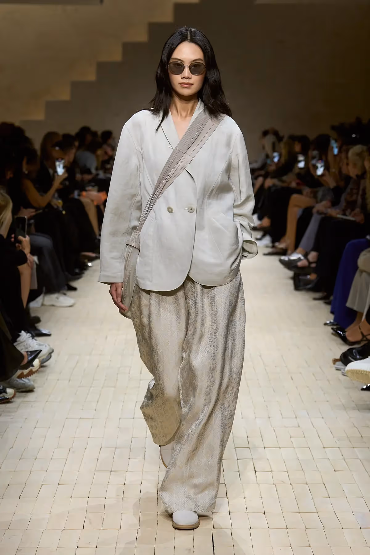 افتُتِح العرض بألوان هادئة وناعمة، مع لمسات أرماني التي تذيب الخشونة في الحرير المعدني، وتضيف نعومة في التريكو، وخفة في الأحزمة المتدلية. سترات مفتوحة تكشف السمرة الباهتة، وكأنها تذكرك بأن الرحلة لم تنتهِ بعد، وأن ما خلفت وراءك من أماكن لا يزال حيّاً في تفاصيلك.