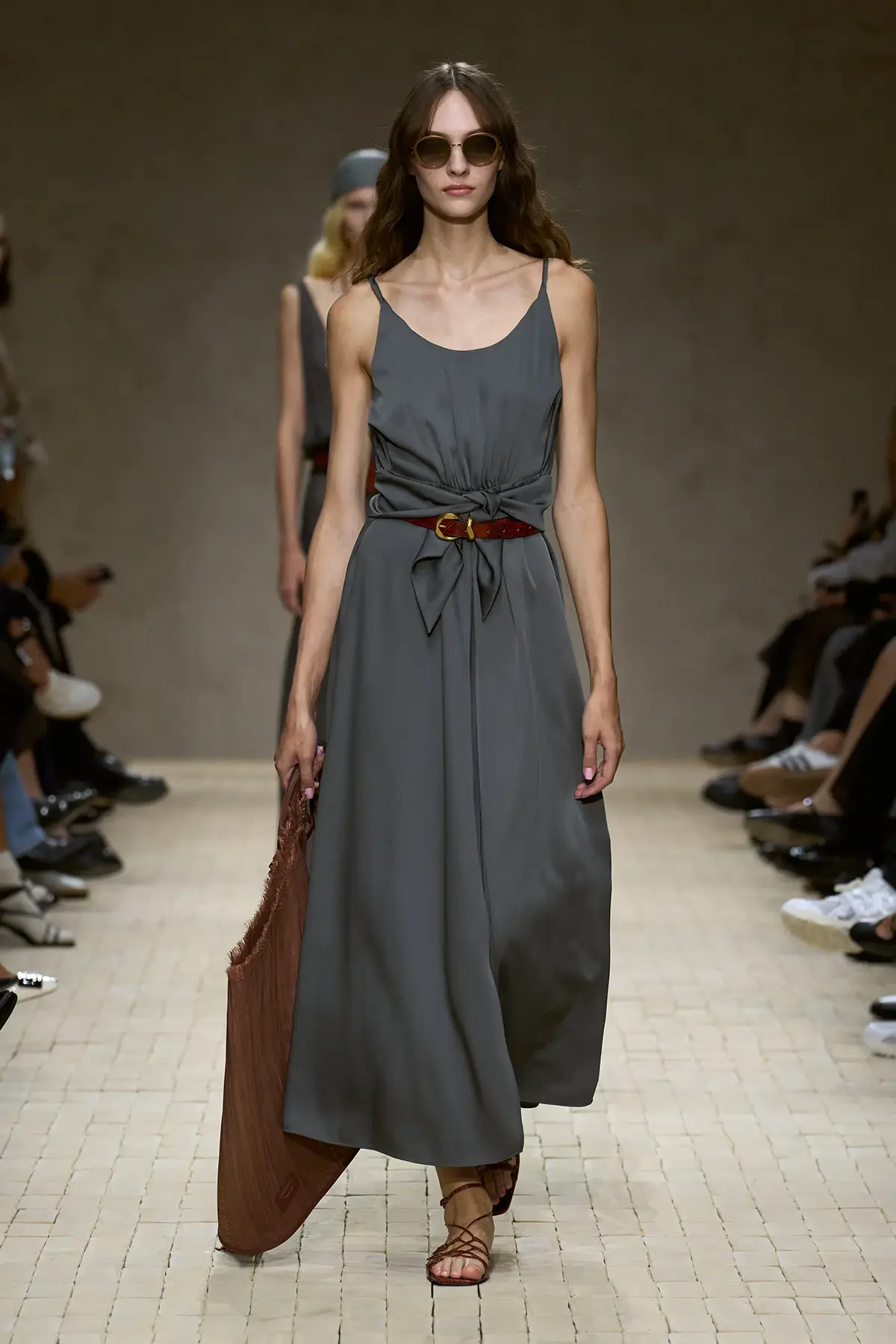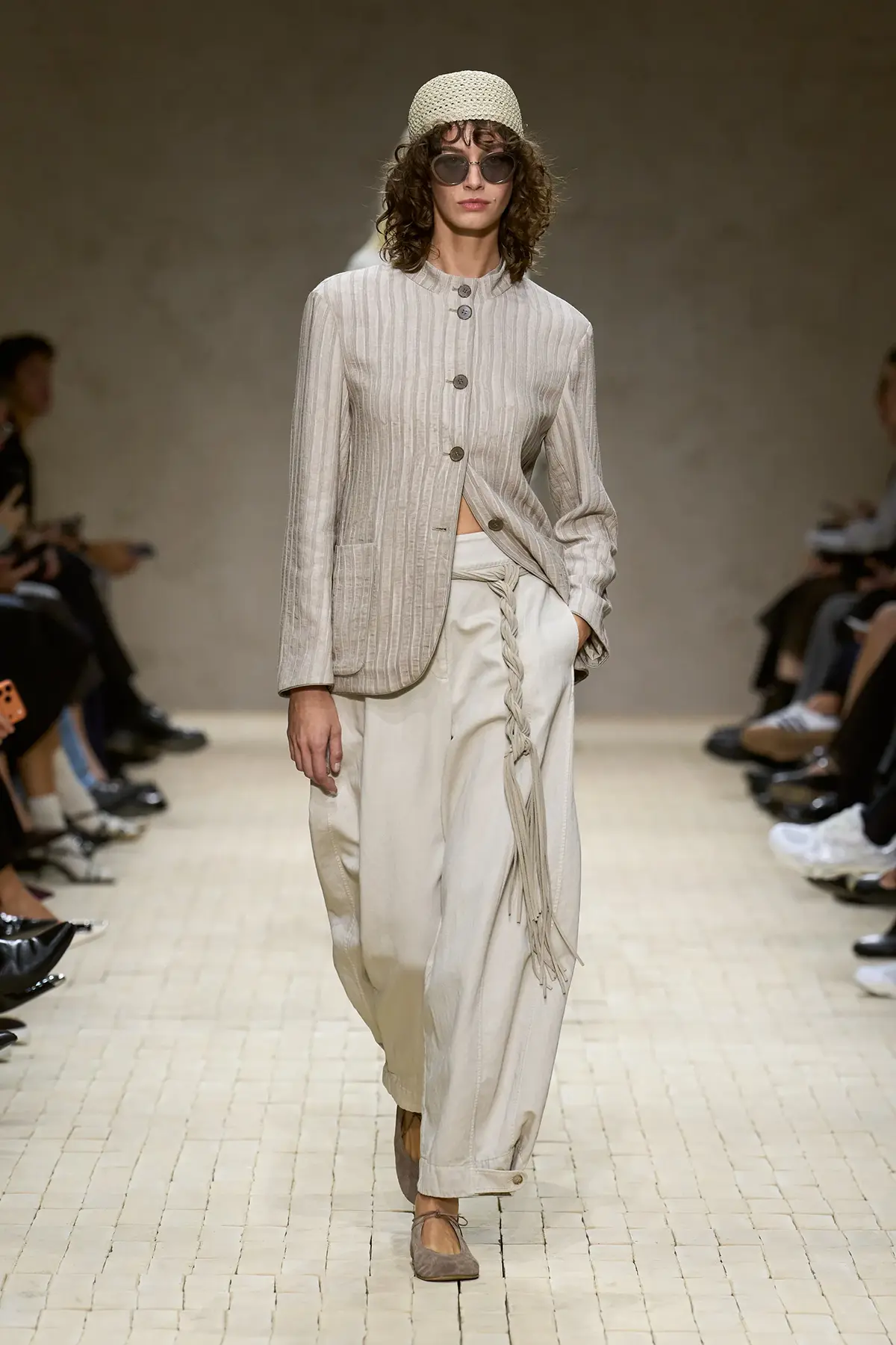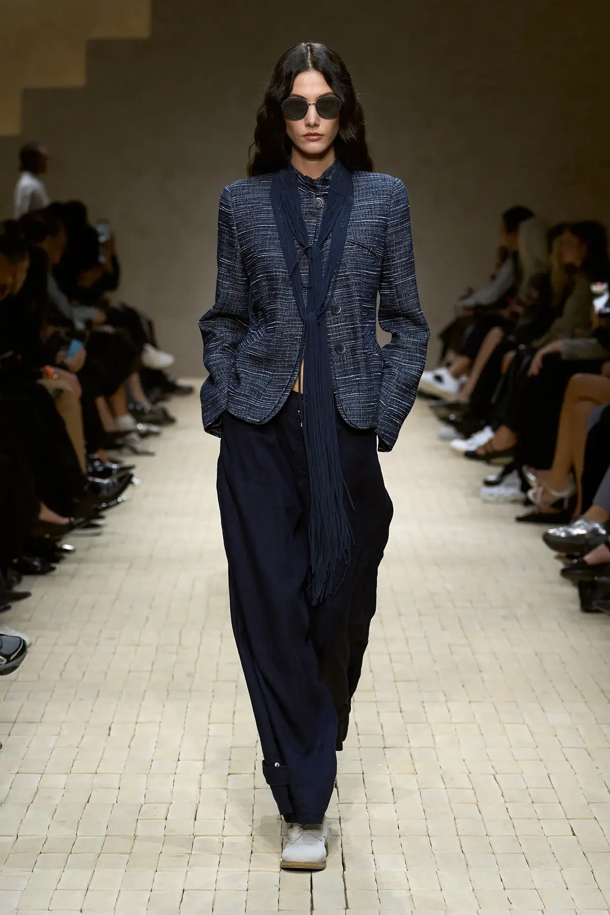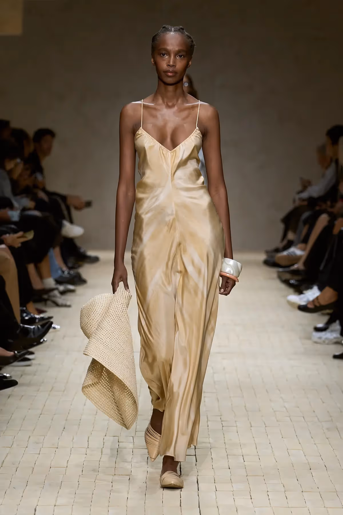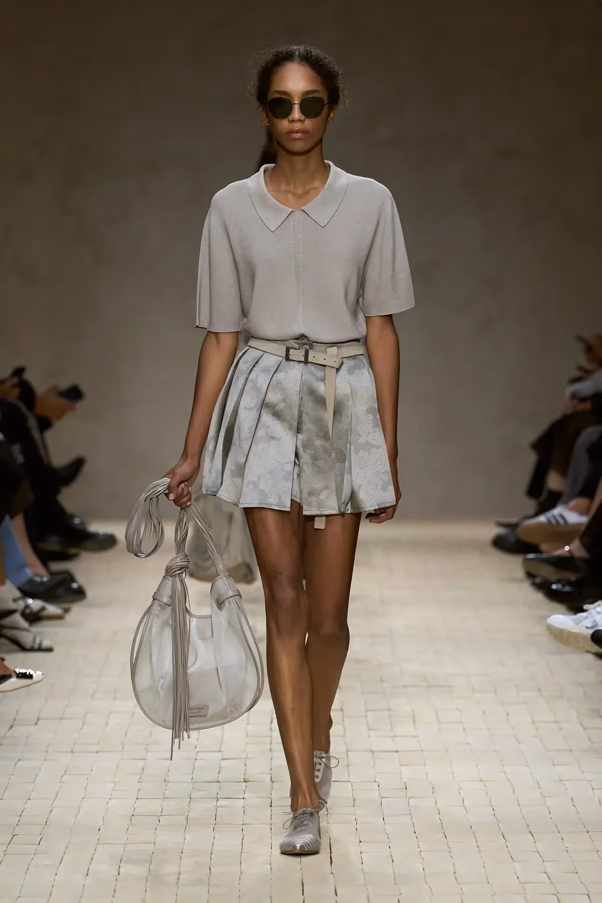 افتُتِح العرض بألوان هادئة وناعمة، مع لمسات أرماني التي تذيب الخشونة في الحرير المعدني، وتضيف نعومة في التريكو، وخفة في الأحزمة المتدلية. سترات مفتوحة تكشف السمرة الباهتة، وكأنها تذكرك بأن الرحلة لم تنتهِ بعد، وأن ما خلفت وراءك من أماكن لا يزال حيّاً في تفاصيلك.