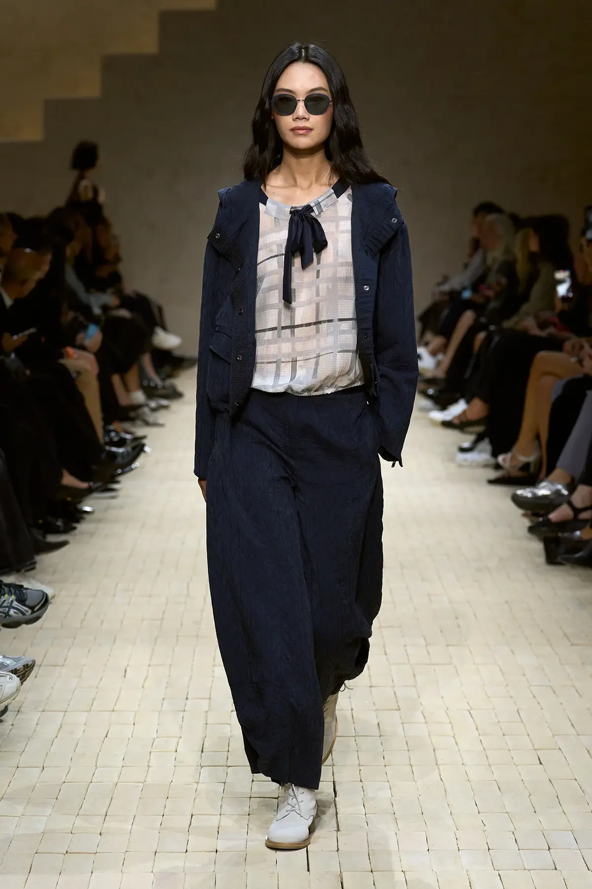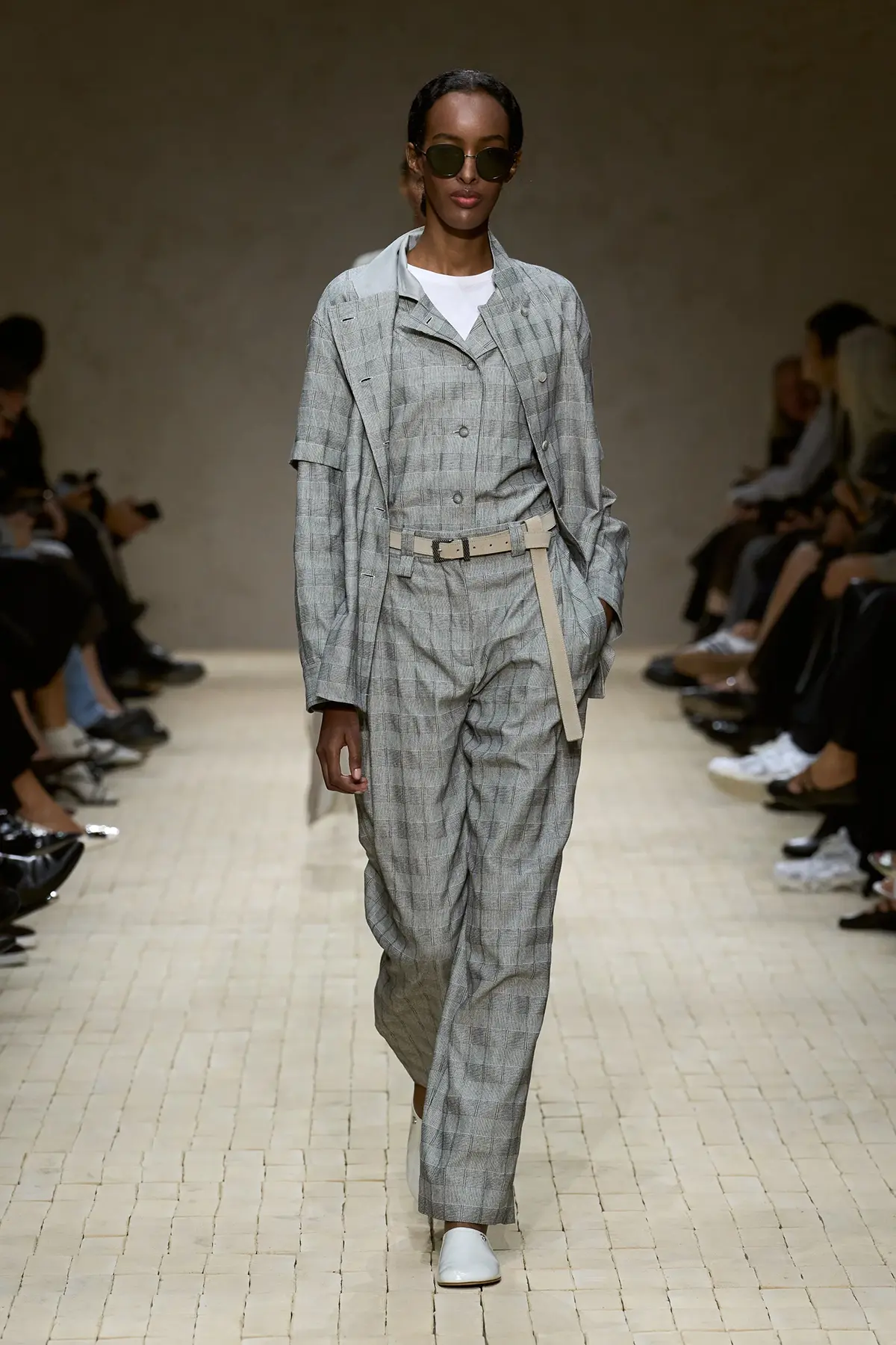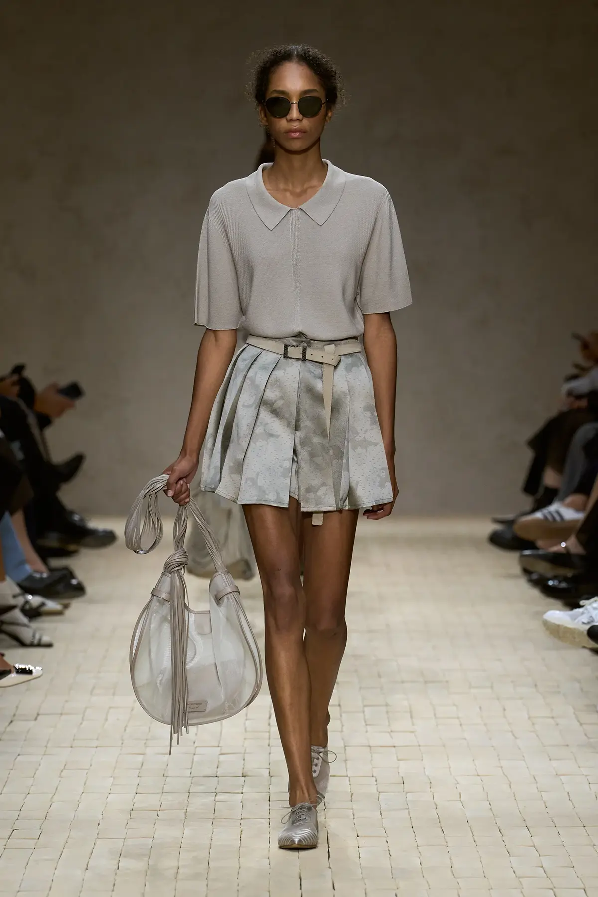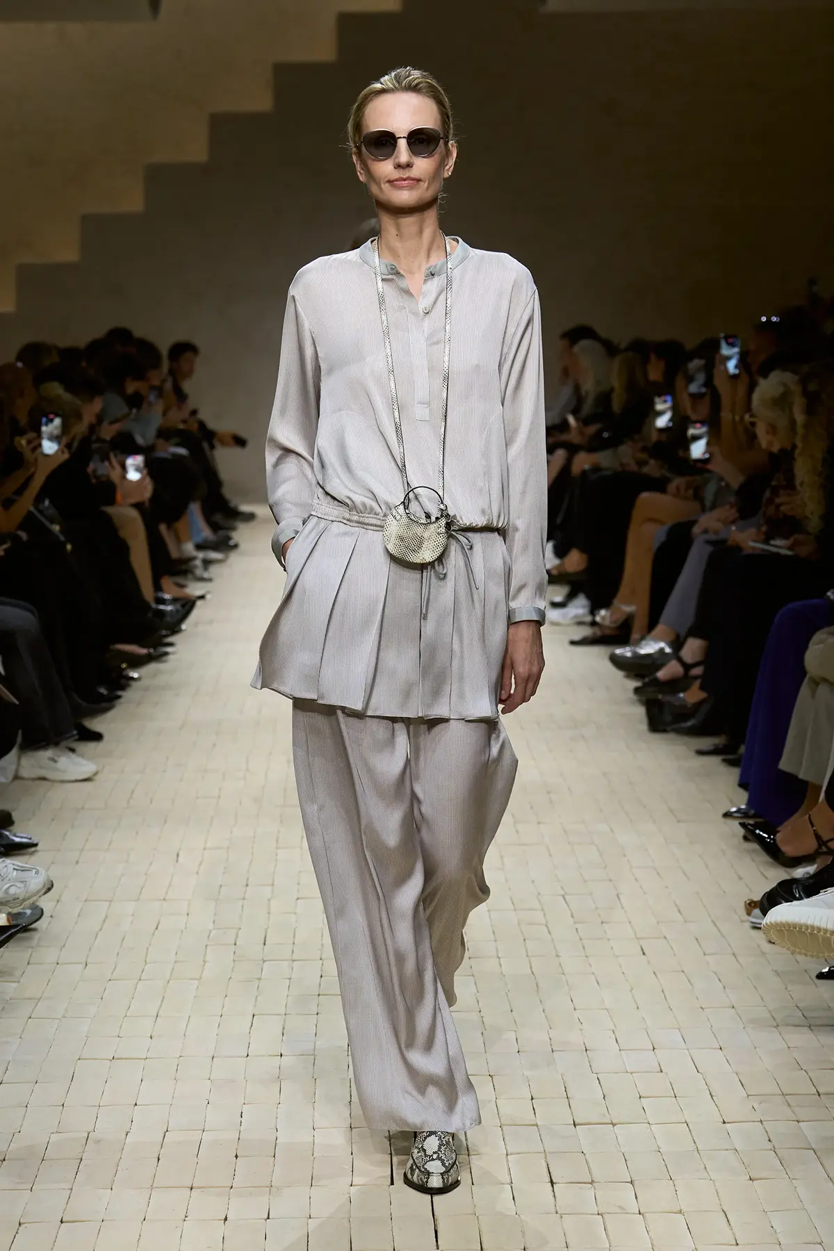 افتُتِح العرض بألوان هادئة وناعمة، مع لمسات أرماني التي تذيب الخشونة في الحرير المعدني، وتضيف نعومة في التريكو، وخفة في الأحزمة المتدلية. سترات مفتوحة تكشف السمرة الباهتة، وكأنها تذكرك بأن الرحلة لم تنتهِ بعد، وأن ما خلفت وراءك من أماكن لا يزال حيّاً في تفاصيلك.