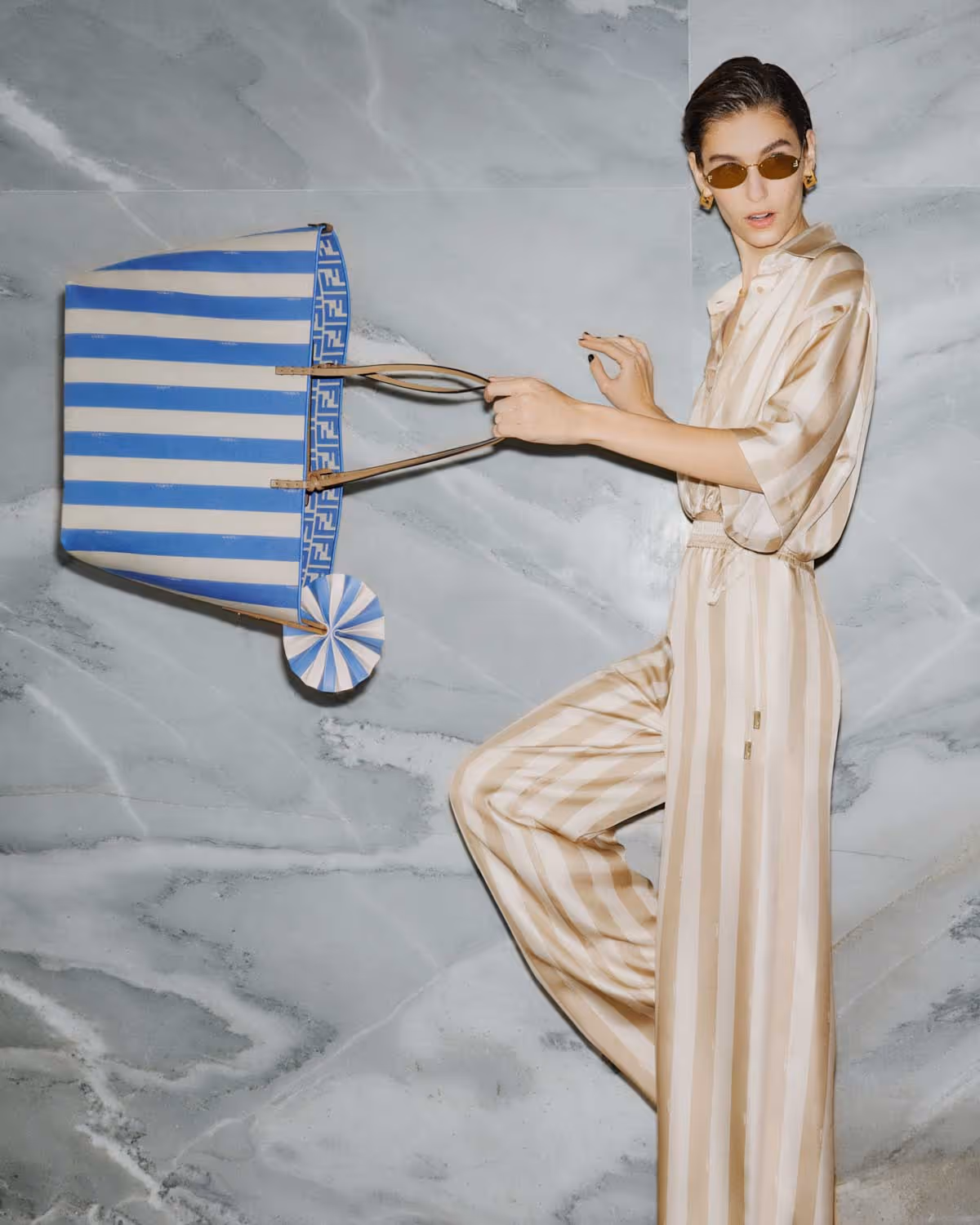 ويهيمن على المجموعة هذا الإحساس بالازدواجية، وهي ميزة من ميزات FENDI، من شوارع المدينة إلى الشاطئ، ومن الطابع العمليّ إلى المرح، ومن الهدوء إلى ضجيج الحياة. وتتلخّص هذه السمات جميعها في نسخة متجدّدة وصيفية من نمط Pequin الأيقوني، وهو نمط "شعار لا شعار" أو "logo no logo"، بشكله العمودي وباللونين الأسود والتبغي الذي صمّمه كارل لاجرفيلد بدايةً في العام 1983. يجسّد هذا النمط خير مثال عن الرفاهية الهادئة وقد أعيد تفسيره في تنوّعات ثنائية الألوان من الألوان الزاهية والمحايدة الباهتة - الأصفر والأزرق الفاتح، والبيجيّ والأزرق الداكن. من الملابس الخارجية إلى ملابس البحر، يظهر نمط Pequin على الملابس النسائية الجاهزة بلمسة عصرية، فبرز على جاكيت go-to-jacket من الجلد، وعلى قطع متطابقة من نسيج الحرير، وفساتين وسروايل من التول الخفيف وبلوزات مضلّعة مزينة بالترتر البرّاق. وتنعكس الأجواء نفسها على مجموعة الرجال حيث يسيطر نمط Pequin على المواد الصيفية، من الأقمشة الاسفنجية إلى القطن والكروشيه.