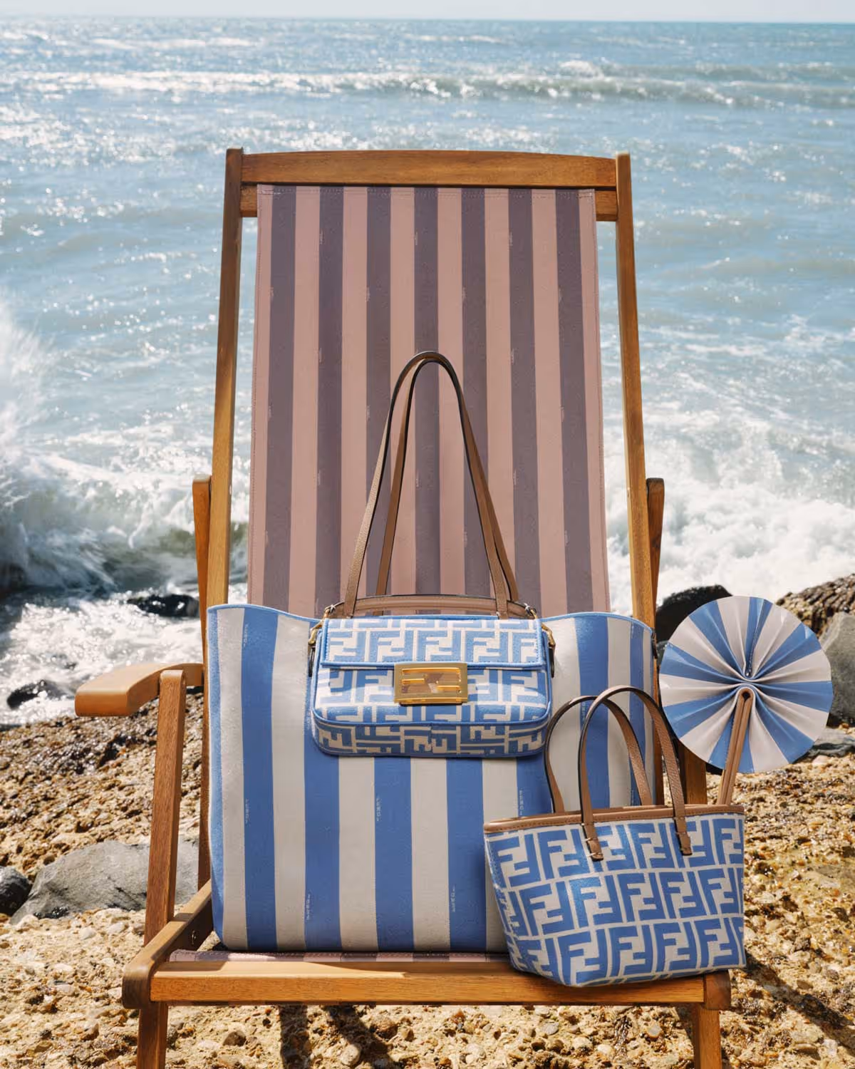 وفي خطوة تستتبع ما قدّم ضمن الملابس الجاهزة، مثّل قماش الدنيم مصدر إلهام أيضاً وراء انتهاج مقارباتٍ ملوّنة ومريحة لمختلف الموادّ التي صُنعت منها الحقائب. فقد هيمنت ألوان الأزرق الهادئة لجاكارد الدنيم بشعار FF، المتعارضة مع تفاصيل الجلد باللون البيجي على مختلف الحقائب الأيقونية بما فيها Baguette ،Fendigraphy ،C’Mon، و Sunshine Shopper، إضافة إلى الحقائب الأيقونية الصغيرة Mini Icons مثل Origami، Mini Mon Trésor، و Mini By The Way. وتظهر حرفية التشابك في شكلٍ غير متوقع في قماش الدنيم على