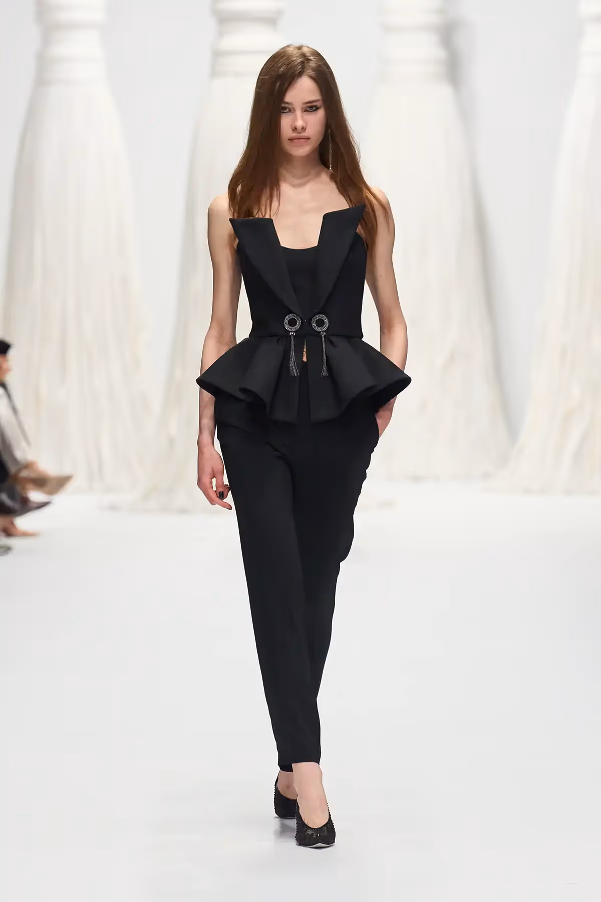 وتستعين التشكيلة بأرشيف العلامة لتثري مختلف التفاصيل الزخرفية التقليدية لديها بأنماط جديدة، كاللمسات المعدنية الصغيرة على شكل أسطوانات حول الياقات في سترات الصوف التي تتألق بطابع فريد ضمن تشكيلة هذا الموسم، بالإضافة إلى مشابك وأزرار على شكل حرف جي الذي يرمز إلى اسم العلامة جيني، فضلاً عن القرص النحاسيّ المخرّم الذي تم طرحه في المجموعة الجديدة على شكل ميدالية تحتفي بمعاني الأنوثة والرقة. وتقدم دار جيني ضمن مجموعتها لهذا الموسم، شراريب معلقة بقطع على شكل قلب تشكّل سلسلة ذهبية اللون يمكن ارتداؤها كحزام، إضافة إلى معطف بقصة واسعة وبتصميم يشابه المعاطف العسكرية، الذي تتألق المديرة الإبداعية سارة بارتدائه منسدلاً إلى الخلف، مع تثبيت الأكمام بشرائط الكورسيه إلى الوراء، ليبدو كفستان سهرة أنيق باللون الأبيض والأسود. وأبدعت العلامة بتقديم تصاميم متنوعة تتميز بتناغمها الرائع بين الأضواء والظلال بإلهامٍ من مفهوم نظرية الطاوية القائمة على التوازن بين الخير والشر، إلى جانب ابتكار أشكال جديدة، بما فيها قطع الكاب مع ياقة مفتوحة على الظهر، أو الكنزات المزينة بكشاكش مع تفاصيل معدنية بأشكال دائرية وهندسية. وتتنوع التدرجات اللونية لتشمل الأزرق الداكن كالبدلات الرسمية والمعاطف بقصة مزدوجة عند الصدر، فيما تزهو المعاطف ذات الياقات المزدوجة باللون البني الفاتح، وتضفي التدرجات الوردية لمسةً مميزة على التصاميم الكلاسيكية للرجال، مثل القطع الموشحة بالتقليمات الناعمة أو المزينة بنقشة الترتان الإسكتلندية، إذ تجسّد جميع تصاميم المجموعة الأناقة البريطانية التقليدية مع اللمسة الفريدة للأزياء الراقية. ويبرز من بين التصاميم كورسيه على شكل قفص باللون الأزرق والأسود مزيناً بنمط الشراريب،ما يضمن للمرأة العصرية إظهار جمالها الاستثنائي وتعزيز ثقتها بنفسها لتقدم كل الودّ والمحبة لمن حولها، حيث تسلّط المجموعة الضوء على جمال السيدات وتفاصيل الأنوثة المرهفة.