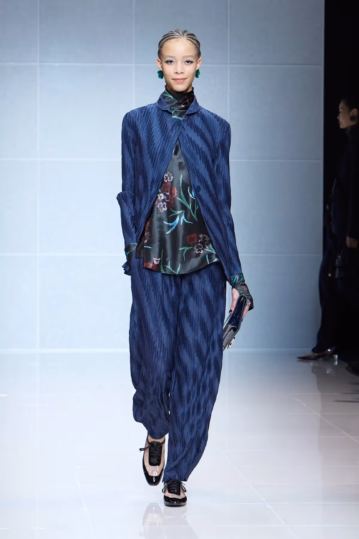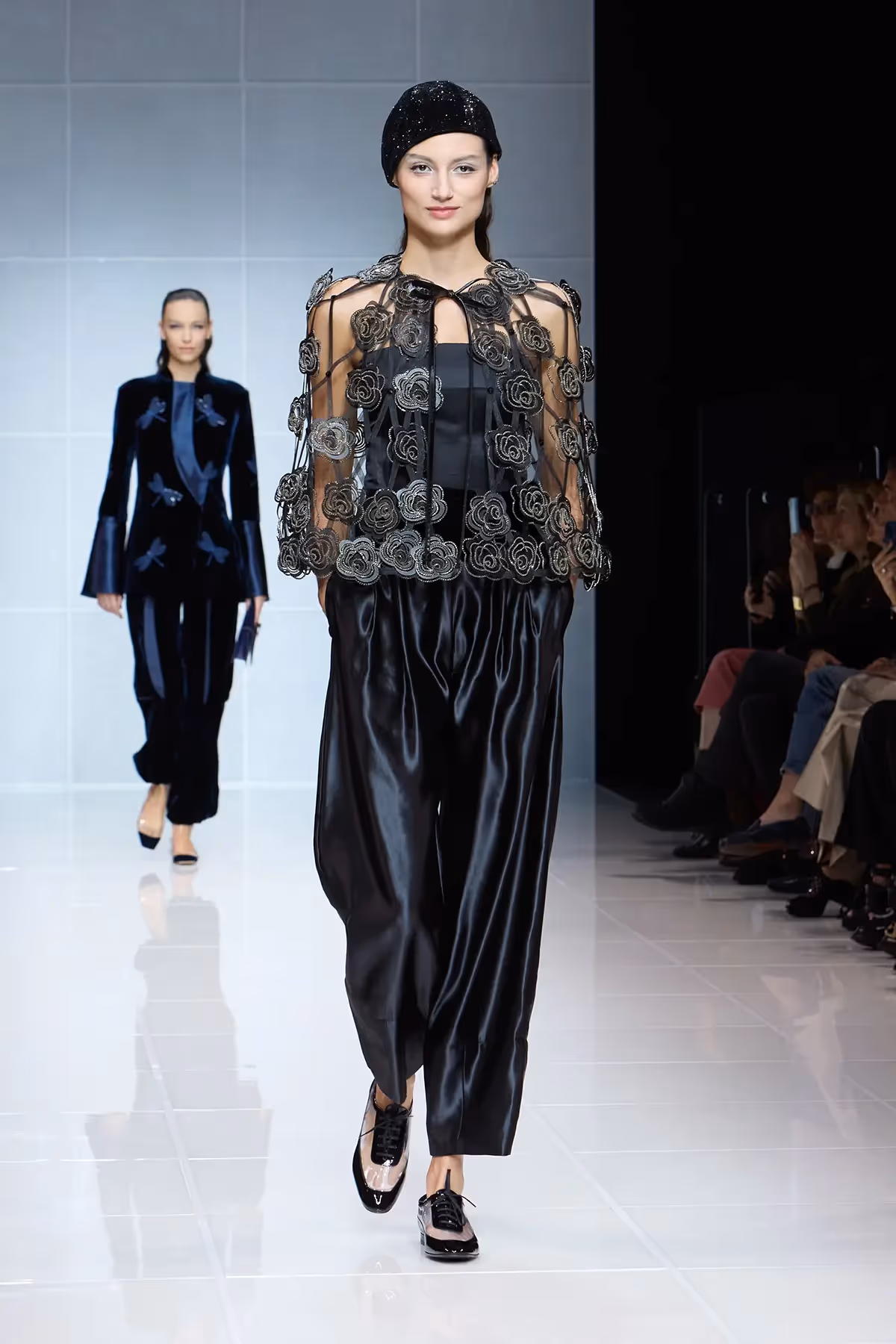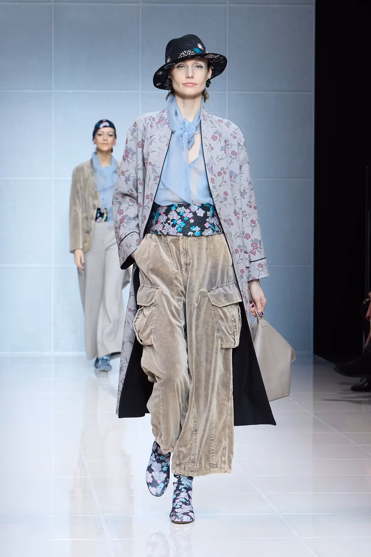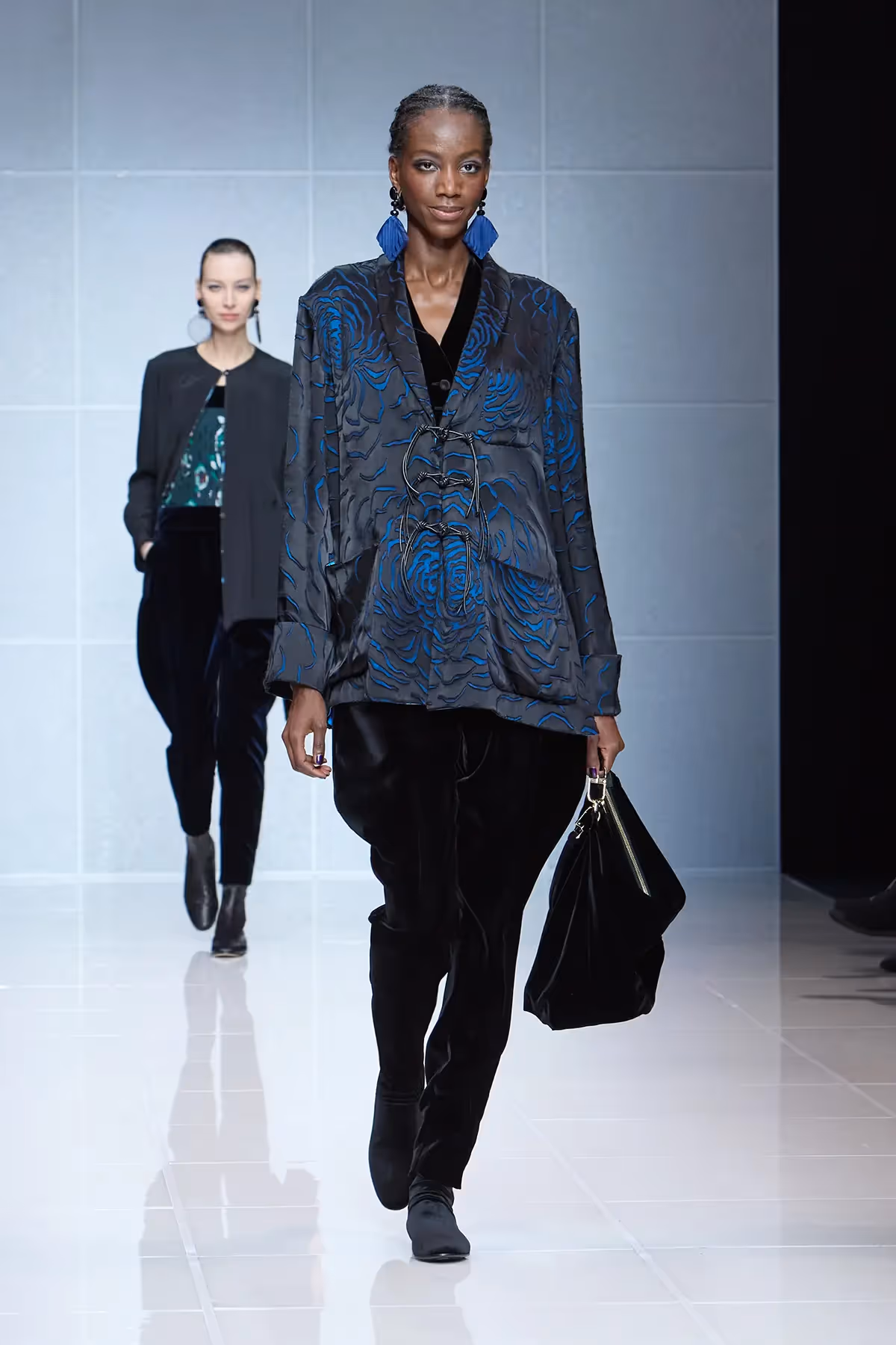تتمحور لوحة الألوان حول الأزرق الليلي والأسود الكثيف والأخضر الداكن، ألوان تُشرق لامعة بتألق المخمل والساتان والحرير التقني، وكثافة الصوف الـ bouclé الناعم والتطريز. تتغلغل الازهار وتبرز معززةً الضوء واللون، مصحوبة باليعاسيب المُطرزة، التي تُعتبر أيضاً رمزاً للأمل. صورة أرماني الظلية ترسم قامة ممشوقة رشيقة الوزن تتضمن سترات بأكمام واسعة ومعاطف طويلة وسراويل فضفاضة. وقت المساء، ترسم الفساتين الطويلة الرائعة شكلاً شاعرياً نحيلاً. رؤية نابضة بالحياة زاخرة بالراحة والثقة: امرأة تتفتح في البرد، رشيقة الحركة، ترتدي أحذية الـ trainers الرياضية أو أحذية منخفضة، امرأة حاضرة على الدوام.