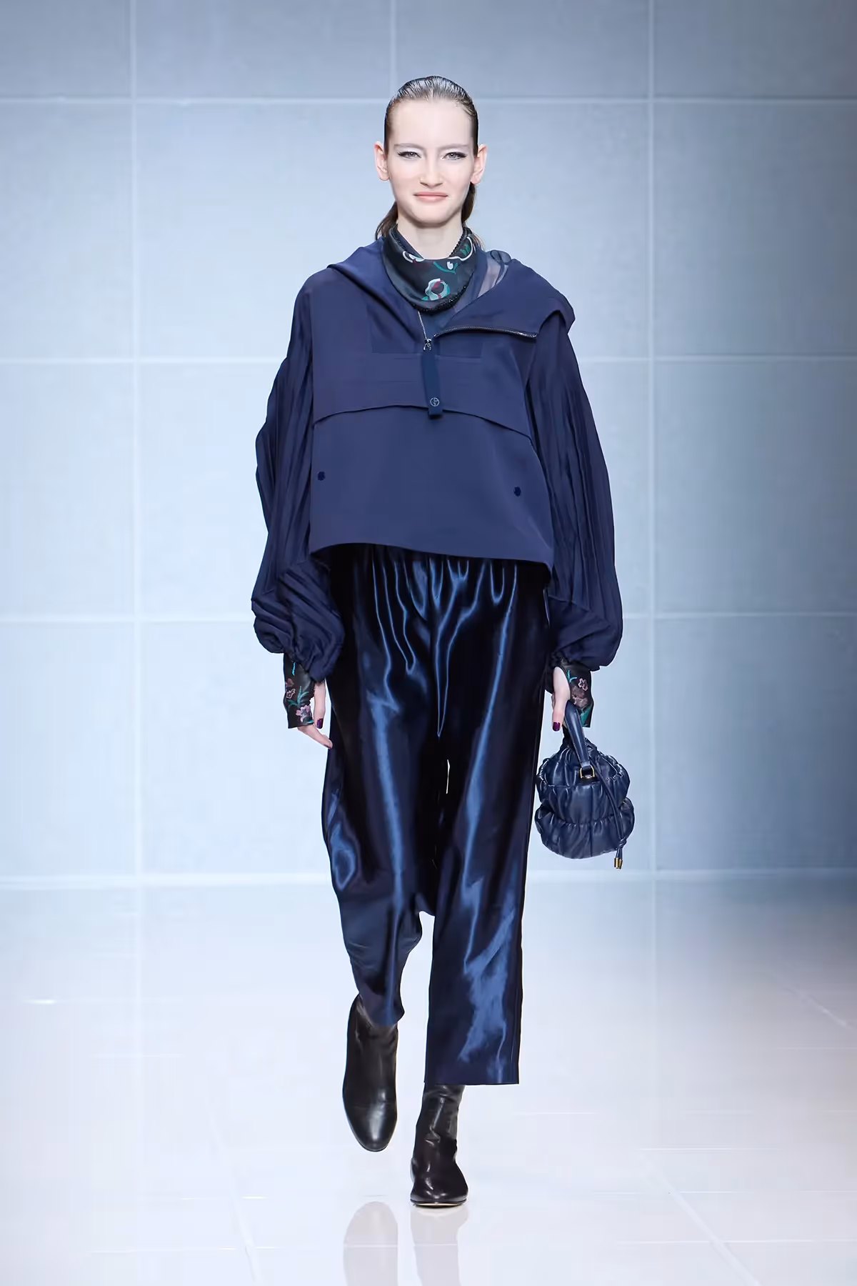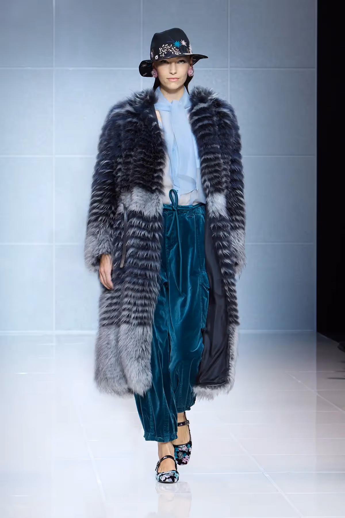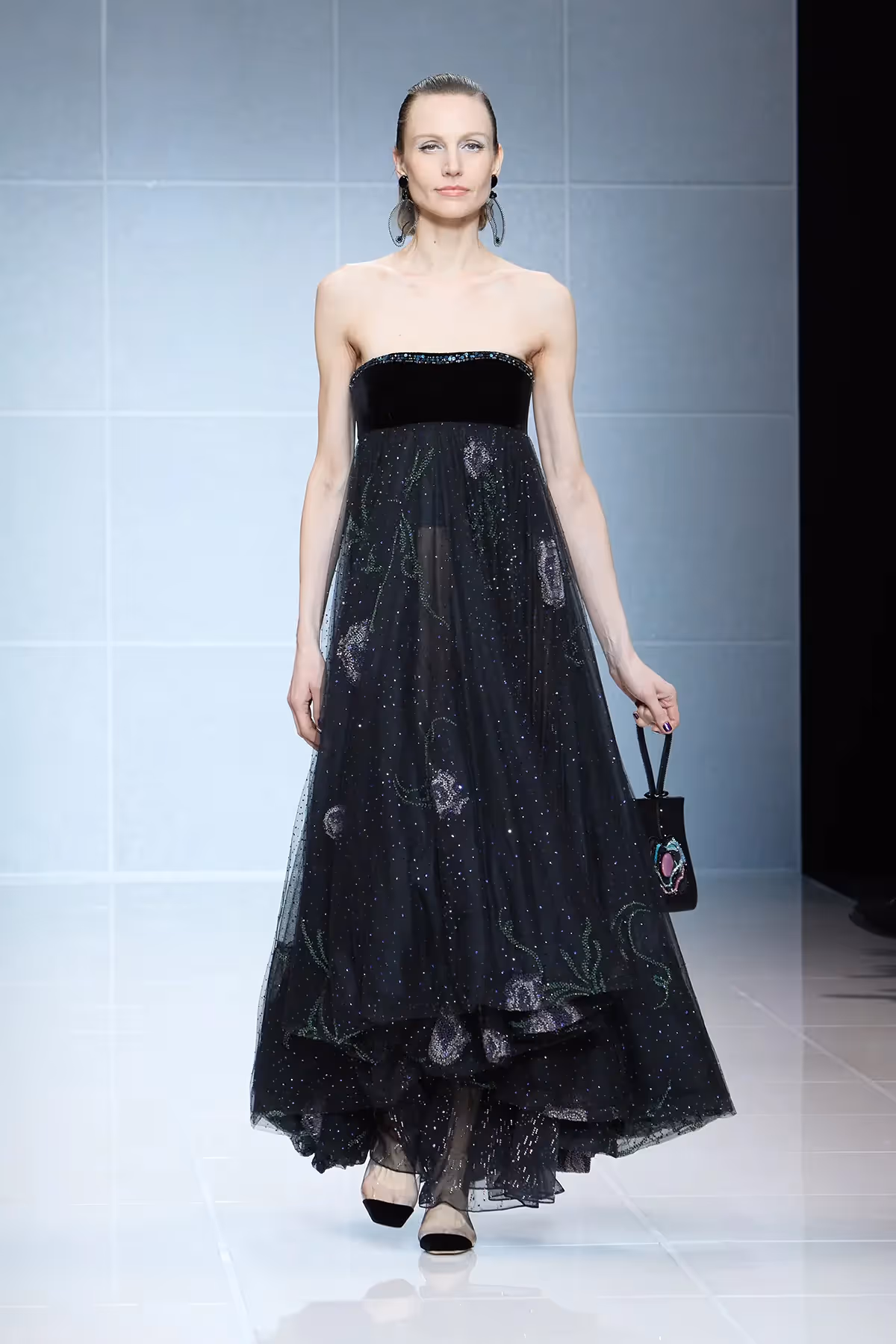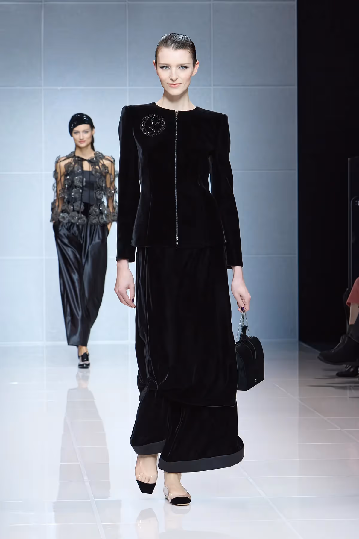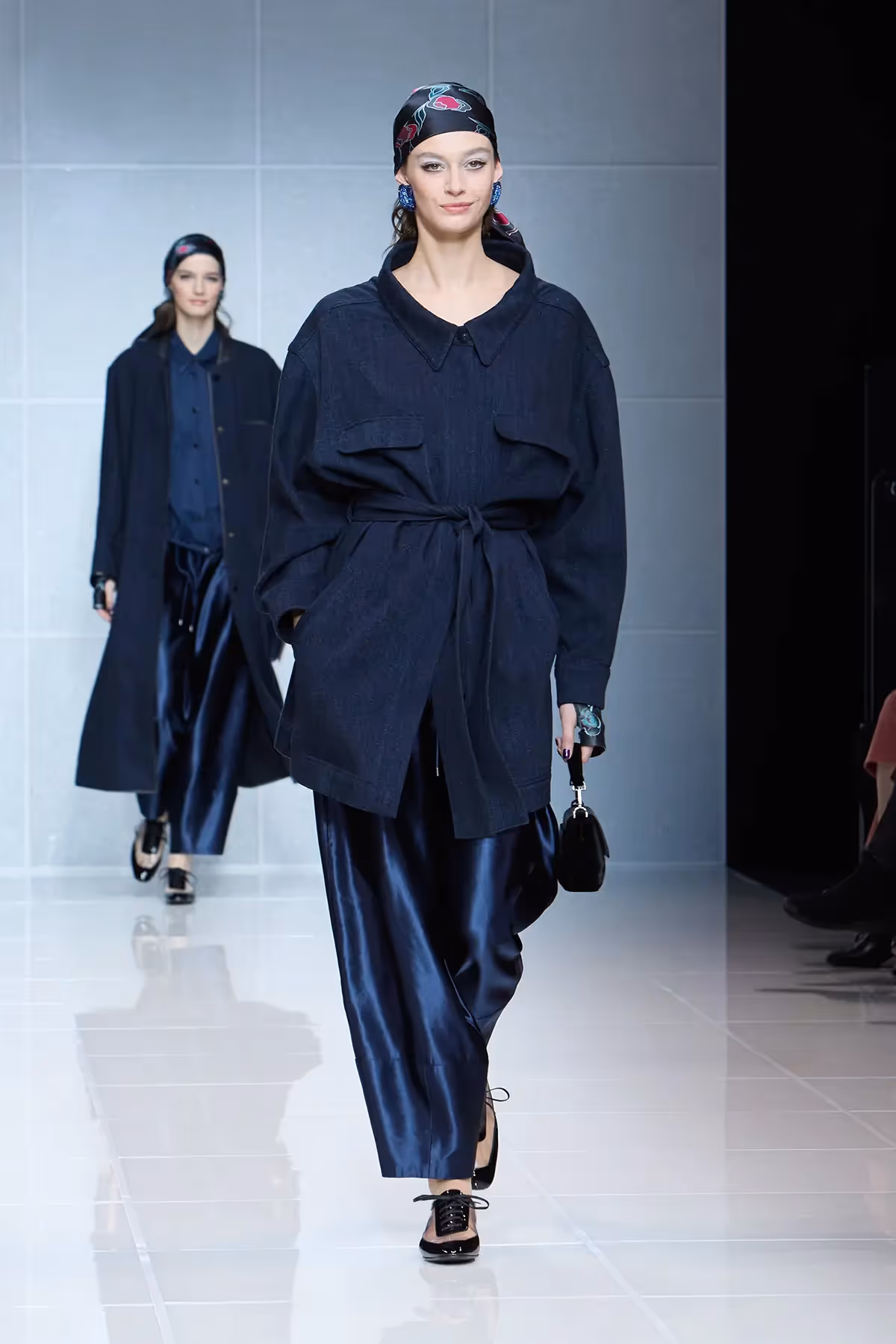 تتمحور لوحة الألوان حول الأزرق الليلي والأسود الكثيف والأخضر الداكن، ألوان تُشرق لامعة بتألق المخمل والساتان والحرير التقني، وكثافة الصوف الـ bouclé الناعم والتطريز. تتغلغل الازهار وتبرز معززةً الضوء واللون، مصحوبة باليعاسيب المُطرزة، التي تُعتبر أيضاً رمزاً للأمل. صورة أرماني الظلية ترسم قامة ممشوقة رشيقة الوزن تتضمن سترات بأكمام واسعة ومعاطف طويلة وسراويل فضفاضة. وقت المساء، ترسم الفساتين الطويلة الرائعة شكلاً شاعرياً نحيلاً. رؤية نابضة بالحياة زاخرة بالراحة والثقة: امرأة تتفتح في البرد، رشيقة الحركة، ترتدي أحذية الـ trainers الرياضية أو أحذية منخفضة، امرأة حاضرة على الدوام.