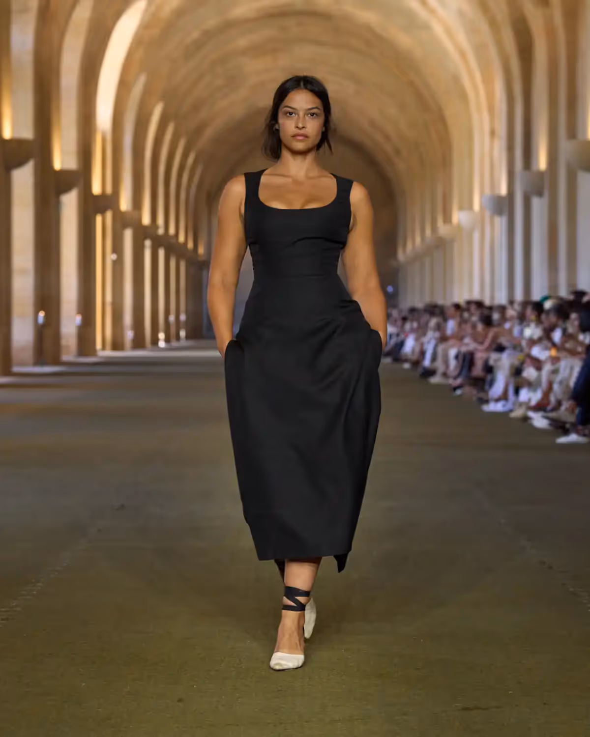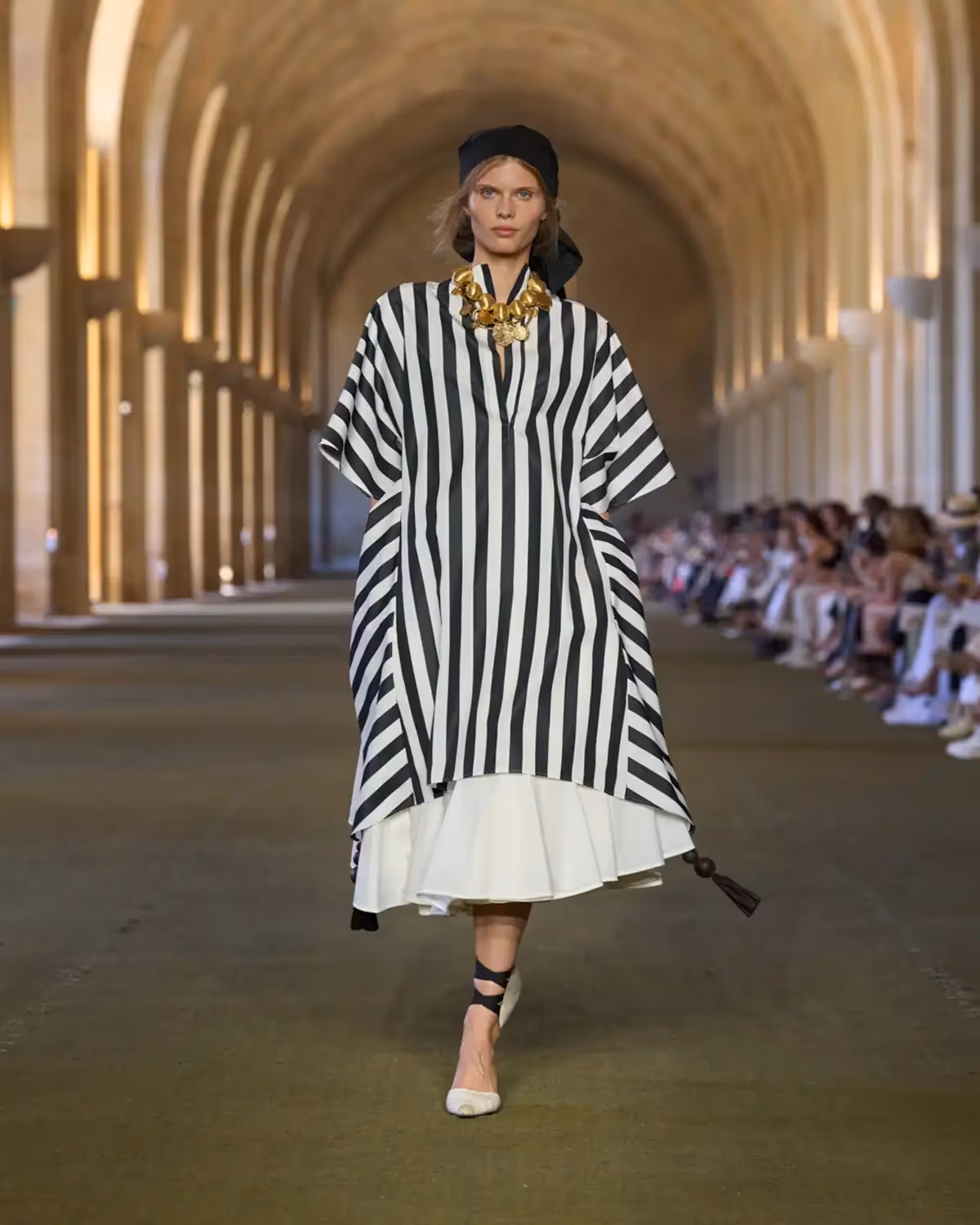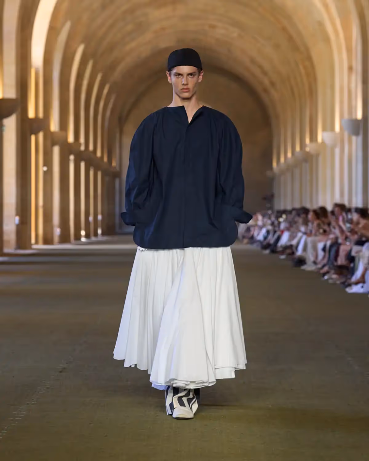 هناك أناقة صادقة وفطرية في كل تفصيلة؛ بساطة تنبعث منها الرقي والمرح في آنٍ معًا. في جوهر العرض، رجل وامرأة تتوسط ملابسهما توازنًا بين الريفي والراقي، بلوحة ألوان من الأبيض الحليبي، والكريمي، والأسود، وتدرجات من الأزرق والوردي والأصفر مستوحاة من حلوى اللوز السكري وخطوط بيرلينغو.
