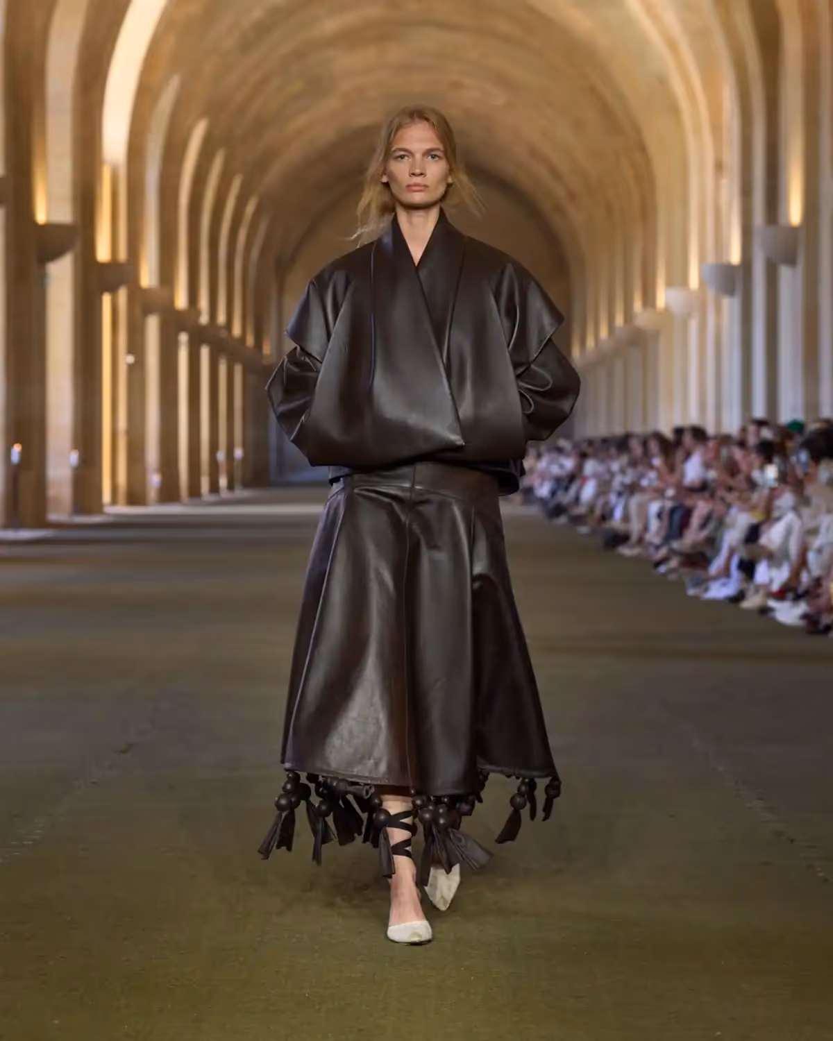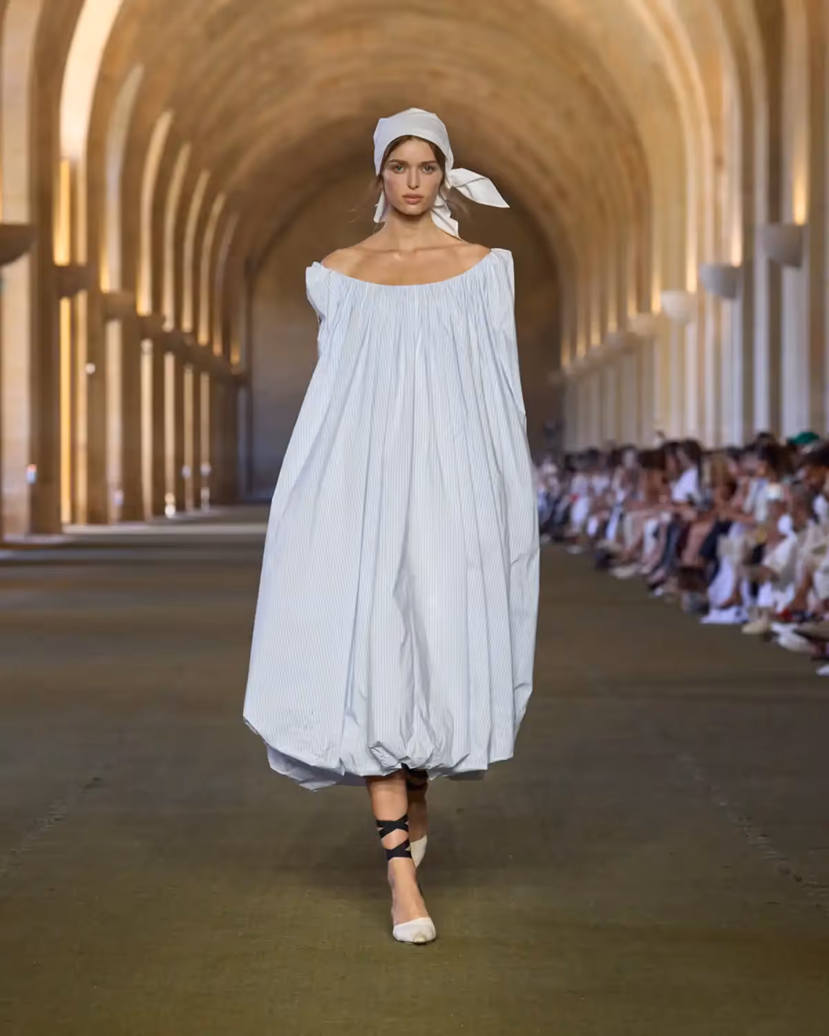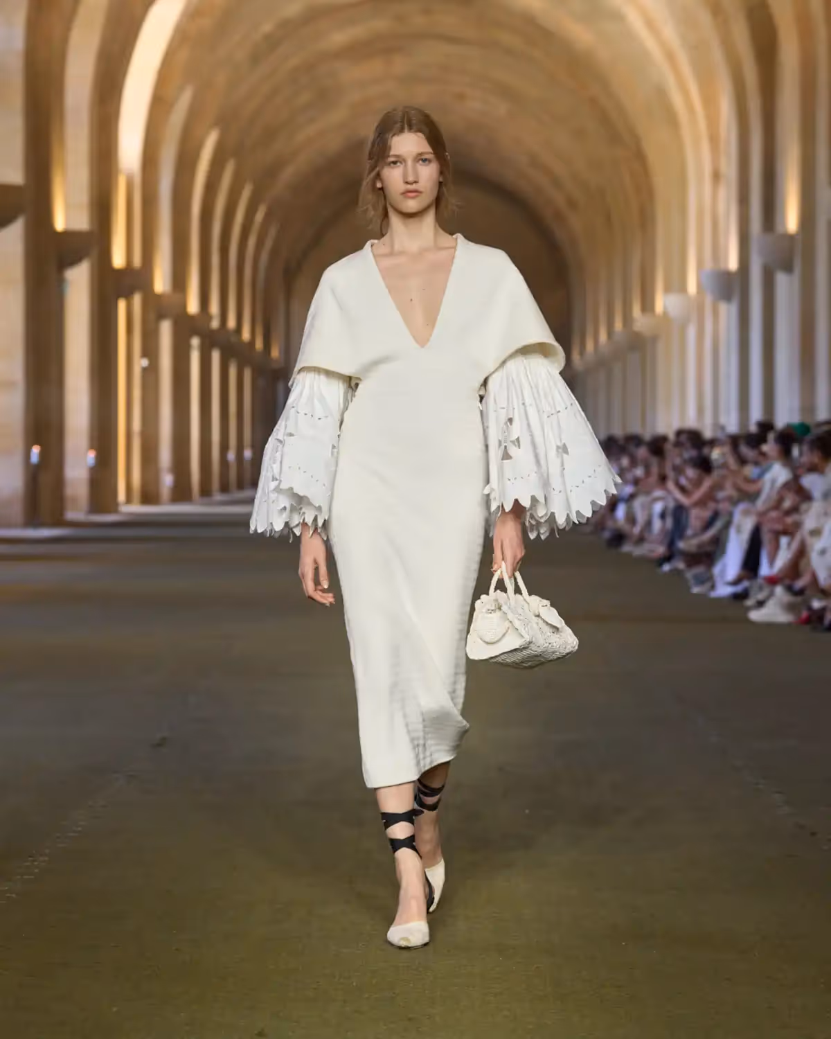 تُبرز الفساتين أيضًا حرفية استثنائية من خلال "تول البوبين"، وهو تول إنجليزي نادر يُنسج على نول عمودي تقليدي. يظهر هنا على شكل فستان منتفخ من التول مزين بـ700 متر من الحبال. كما تظهر قطعة من الموسلين الشفاف بتطريز ماسي من التفتا الحريري. وتتزين بعض الإطلالات بأهداب مصممة خصيصًا من الجلد ومكوّنة من كرات منحوتة يدوياً.