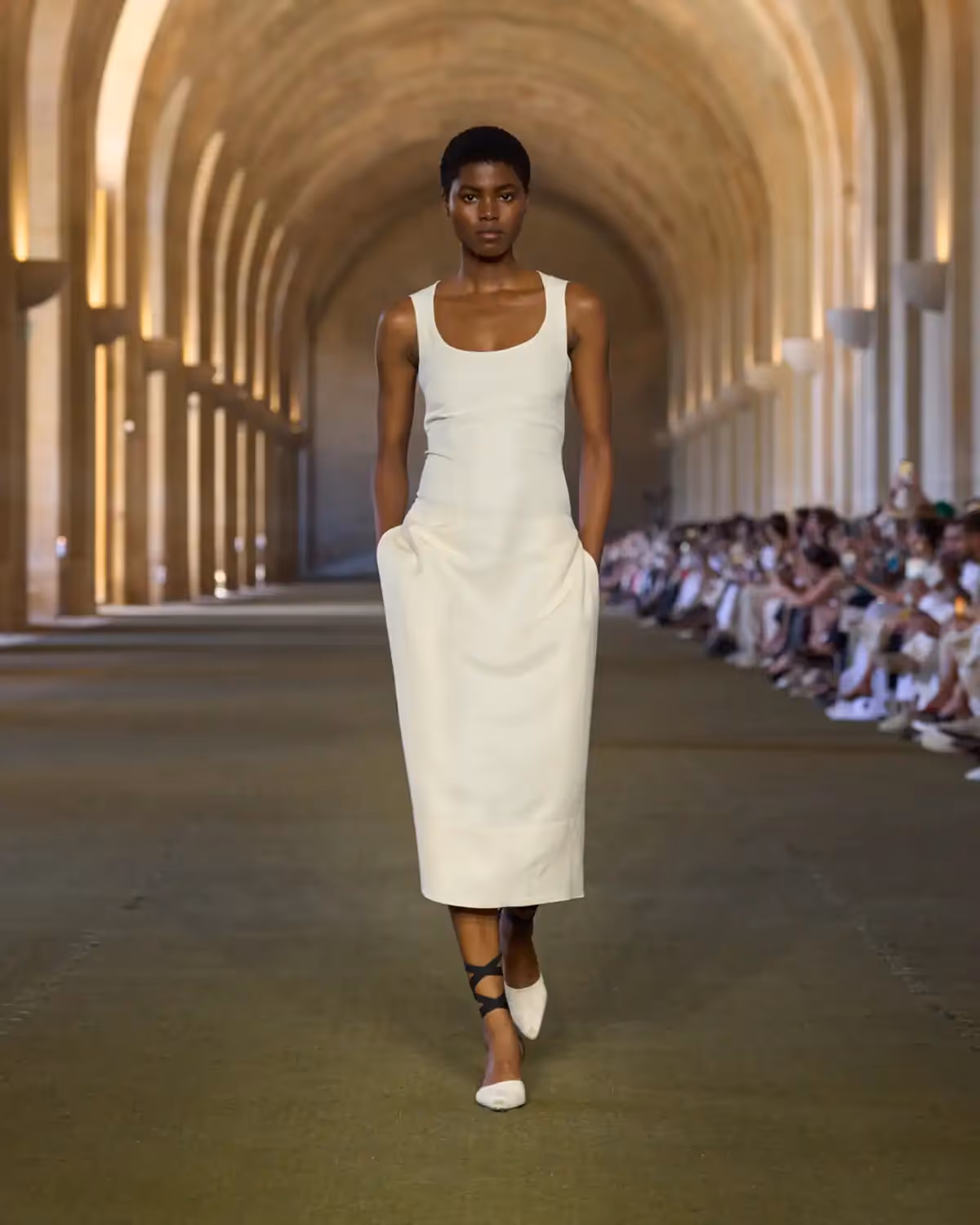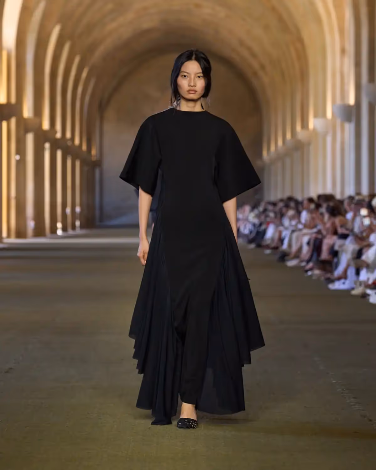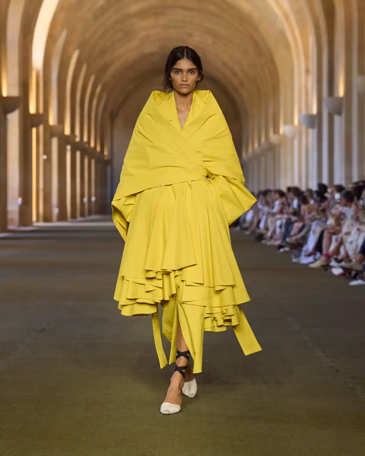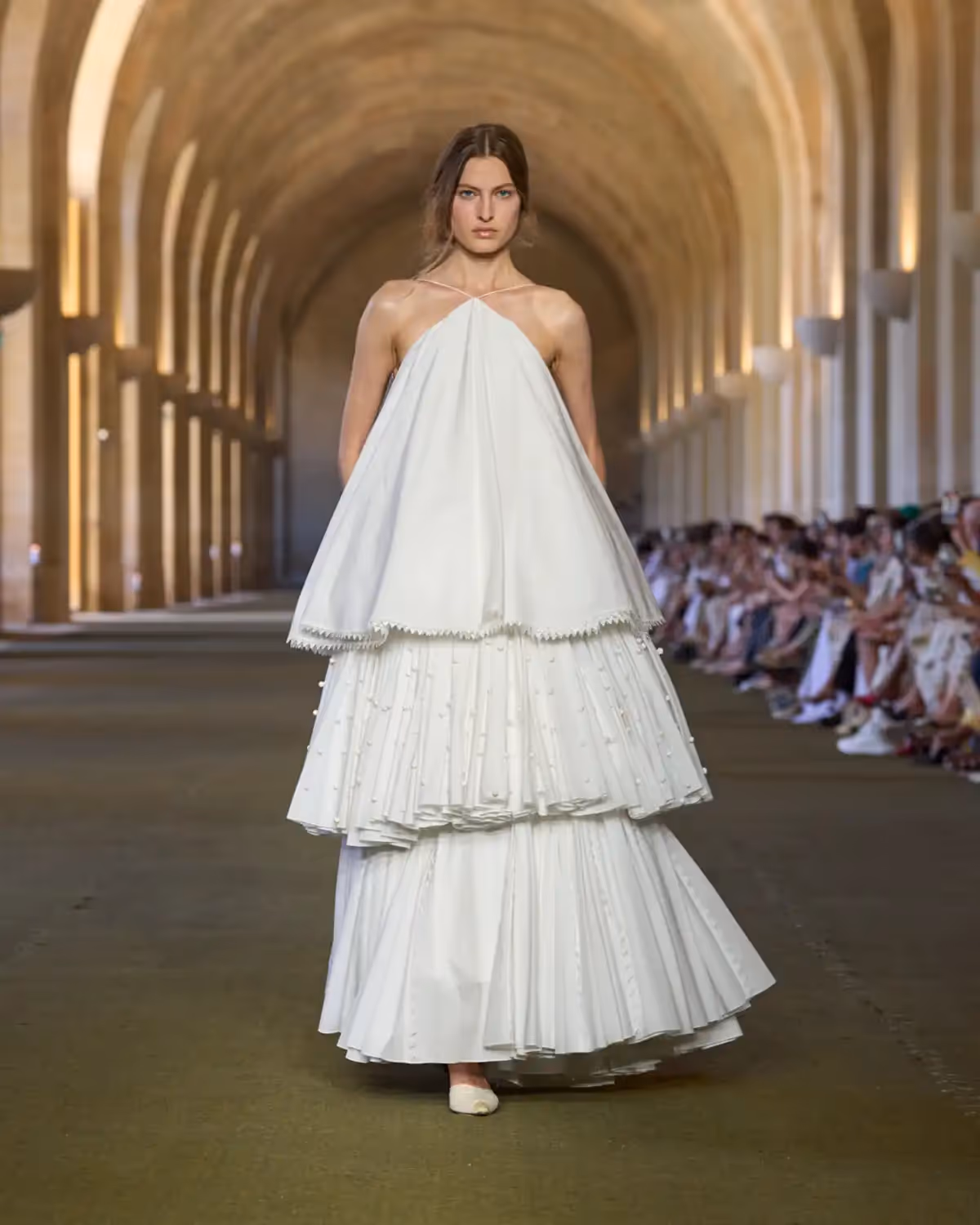 تُبرز الفساتين أيضًا حرفية استثنائية من خلال "تول البوبين"، وهو تول إنجليزي نادر يُنسج على نول عمودي تقليدي. يظهر هنا على شكل فستان منتفخ من التول مزين بـ700 متر من الحبال. كما تظهر قطعة من الموسلين الشفاف بتطريز ماسي من التفتا الحريري. وتتزين بعض الإطلالات بأهداب مصممة خصيصًا من الجلد ومكوّنة من كرات منحوتة يدوياً.