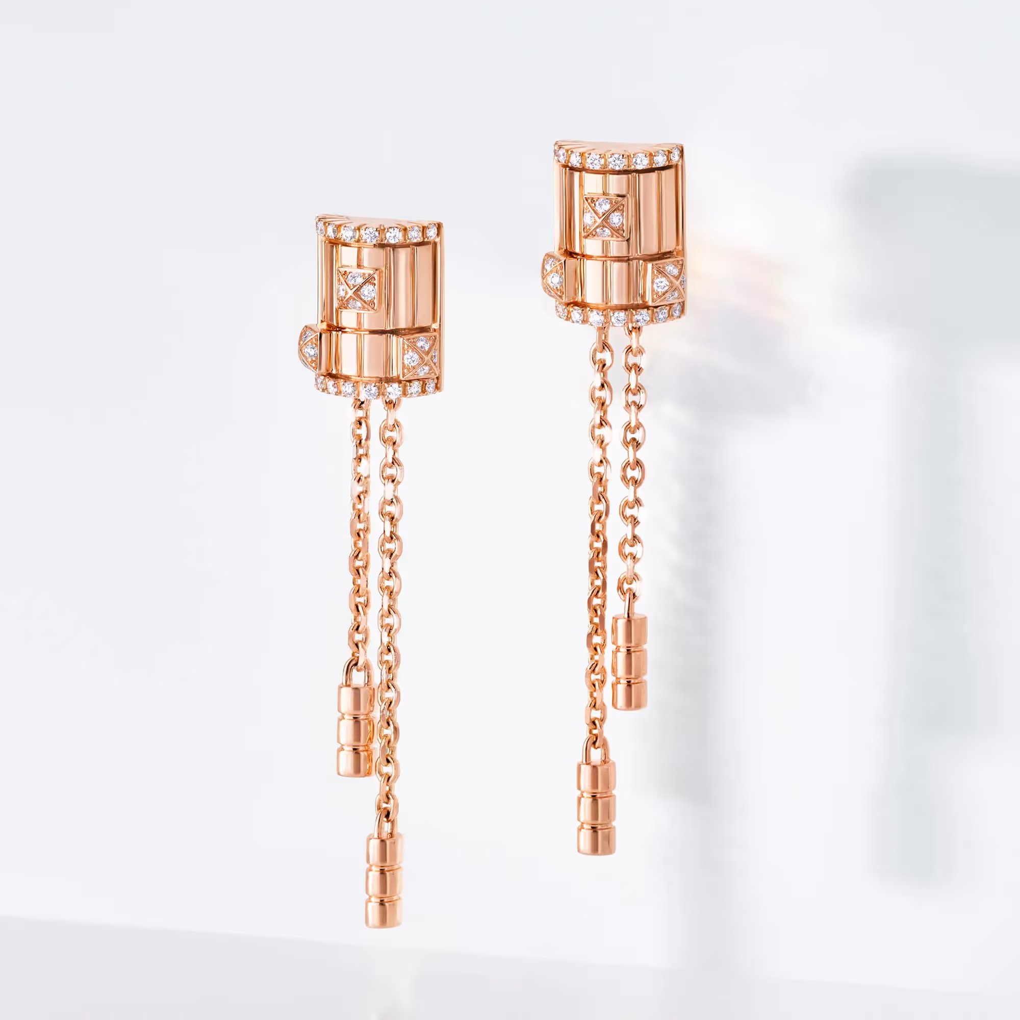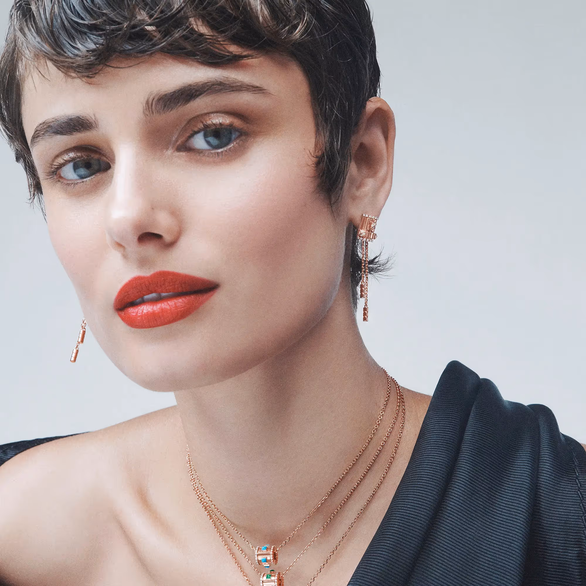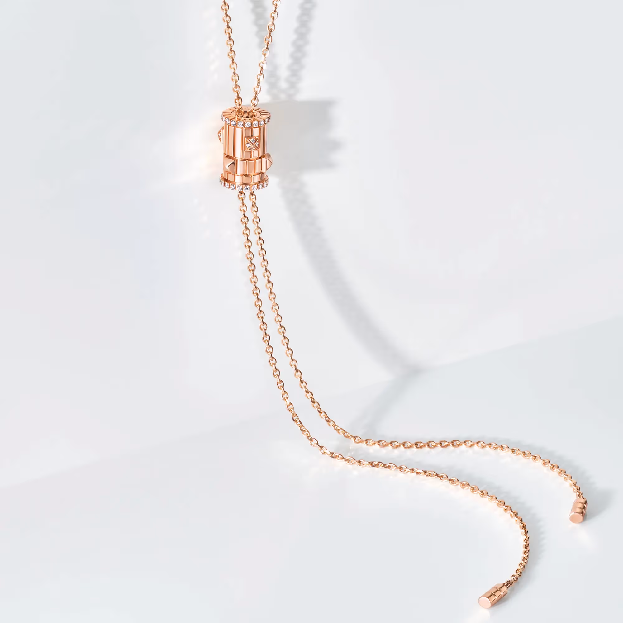 للمرّة الأولى على الإطلاق، تُضاف القلادات والأقراط إلى مجموعة LIFE، وقد تمّ تصميم كلّ قطعة بدقّة فائقة لتوفير أساليب غير محدودة للتعبير عن الذات. يتصدّر هذا التوسّع عقد آسر مُزوّد بحلية دوّارة، وهو مصنوع ببراعة من الماس المُرصّع بالذهب الوردي عيار 18 قيراطاً. تُضفي هذه القطعة الأنيقة لمسة من المرح على المجموعة، وتتناغم تماماً مع تشكيلة أساور وخواتم LIFE التي تم إطلاقها لأول مرة عام 2023. تكشف هذه القلادة المُصمّمة بأسلوب ربطة عنق عن حلية دوّارة، تعكس الحركة الديناميكية لتصميم الخاتم المُميّز في المجموعة، مع إمكانية تعديل طولها حسب الرغبة لتناسب أسلوب المرأة الفريد وتتلاءم مع مختلف المناسبات. تكتمل هذه القطعة المُنمّقة بأقراط متطابقة معها بشكل شراريب، يمكن تنسيقها مع قلادة لمظهر لافت أو يُمكن وضعها بمفردها لترك انطباع مُميّز لا يُنسى.