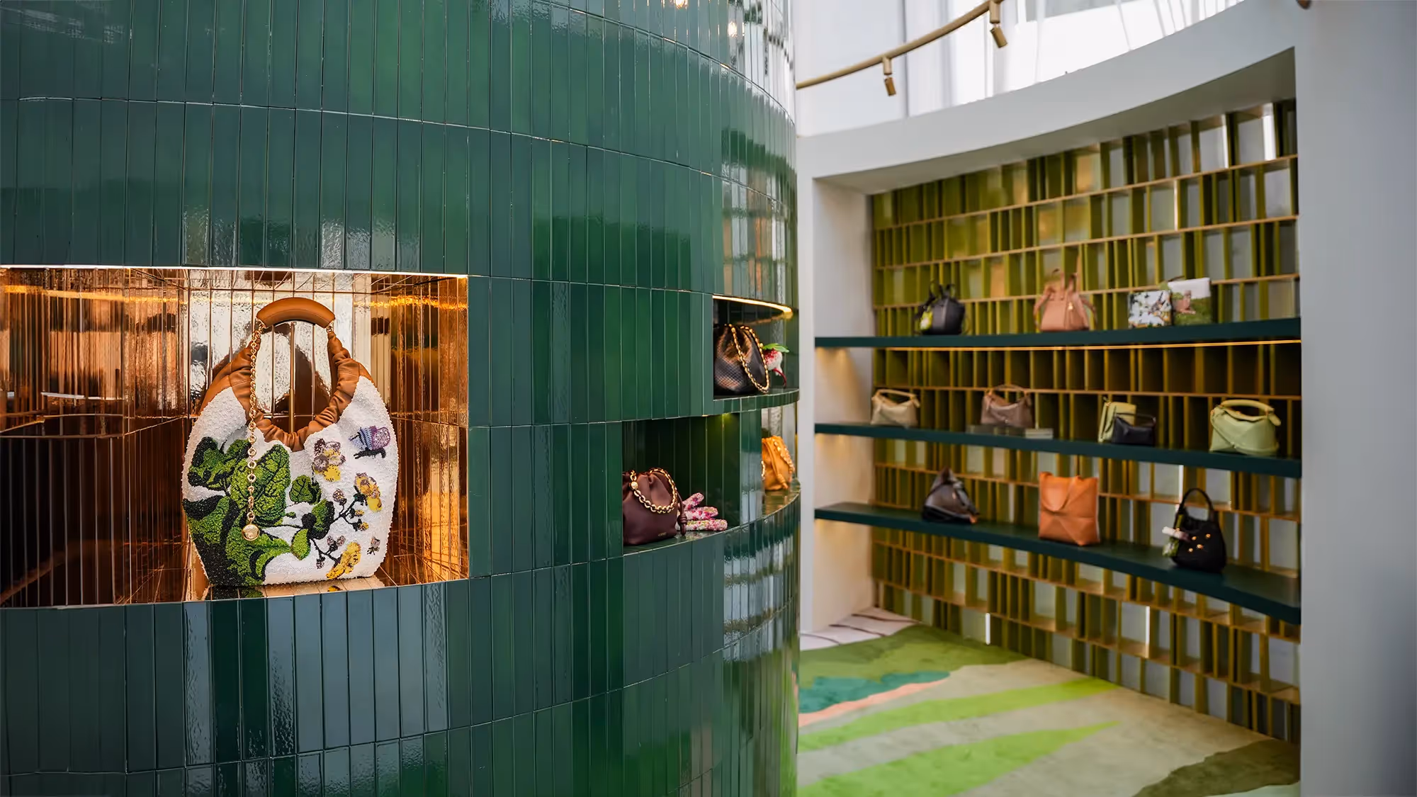 كما يبرز في منتصف المتجر عمود بتصميم شبه مغلق مزين ببلاط باللون الأخضر الداكن، ما يمنح المساحة طابعاً دافئاً يتماشى مع تميز الحقائب المميزة والمزينة بأجمل قطع الخرز. وتحتضن هذه الزاوية ورشة عمل مزينة بخشب البلوط تمنح لمحة حول تقنيات ترصيع الحقائب الجلدية وتزيينها بالخرز. وتستضيف ورشة العمل هذه اثنين من أمهر الحرفيين خلال فترة حضور المتجر، حيث يتولى أحدهما استعراض تقنيات التطريز لتشكيلة خريف وشتاء 2024 بين 5 و10 نوفمبر، في حين يكشف خبير التصاميم الجلدية من متجر العلامة Getafe عن رحلة إبداع حقيبة Flamenco من 12 ولغاية 17 نوفمبر.