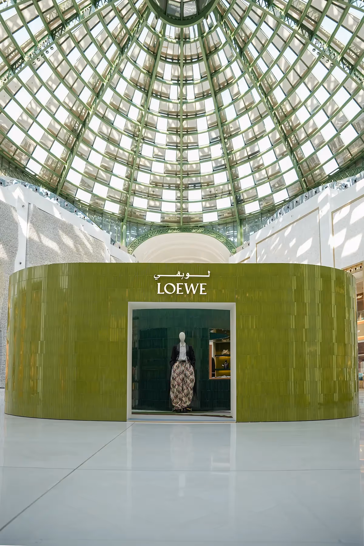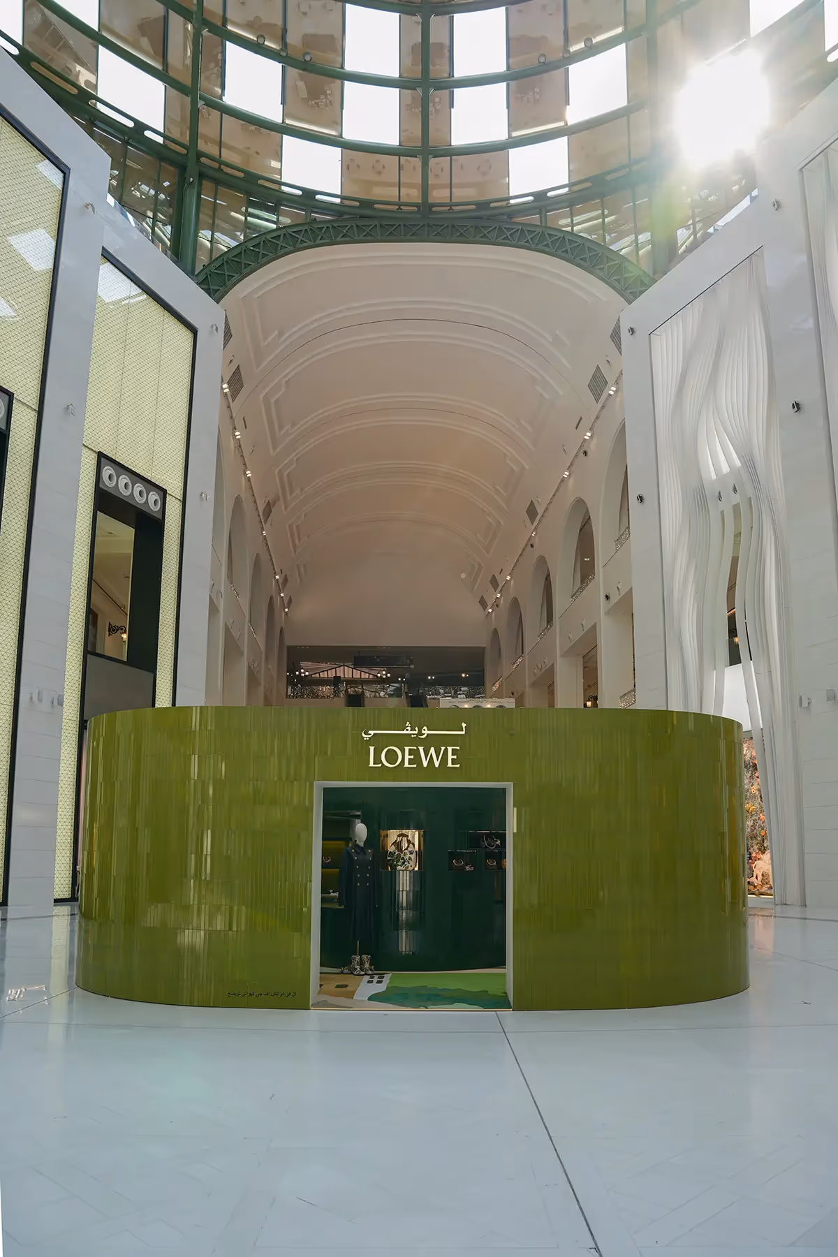 وتتميز واجهة المتجر المؤقت بتصميمها المبتكر من البلاط باللون الأخضر الفاتح، الذي يمنح أجواءً ترحيبية مريحة. أما بهو المدخل، فيتألق بالتصاميم الرخامية التي تزهو بتدرجات اللون الأخضر، في حين تضفي التفاصيل النحاسية لمسة من التباين الدافئ والجميل. ويستمد المتجر إلهامه من متجر CASA LOEWE الذي أبدعه المدير الإبداعي لدى العلامة Jonathan Anderson، والذي يجمع بين عراقة المعارض الفنية وفخامة المتاجر، ليضم أربعة أعمال فنية مبتكرة على يد الرسام البريطاني Eliot Hodgkin الشهيرة بلوحاته المتمحورة حول عالم النبات. أما سجادة المتجر المبتكرة من الصوف المصنوع يدوياً لوحة بيفيريل من القمة (Peveril of the Peak) للفنان البريطاني John Allen، بينما تمنح التفاصيل المميزة على شكل خضراوات مزينة بالخرز لمسة من الحيوية والمرح.