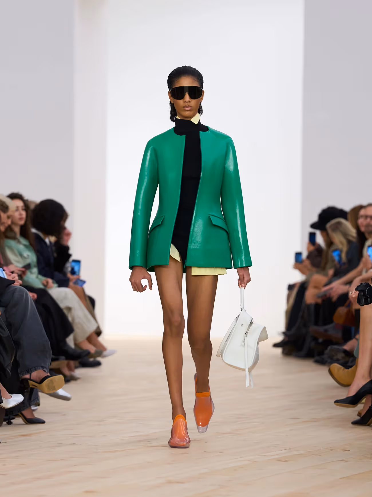 من الإطلالة الافتتاحية، بدت تفاصيل الخياطة جلية. تم قص السترات بدقة هندسية، وتدفقت الفساتين بأشكال انسيابية بلا مجهود، وكانت كل قطعة جلدية شهادة على إرث Loewe. من أبرز القطع بالنسبة لي كانت سترة جلدية خضراء منظمة وملائمة في الوقت نفسه، أنيقة وجريئة في آن واحد. إنها من تلك القطع التي تجذب الانتباه بهدوء دون ضوضاء.