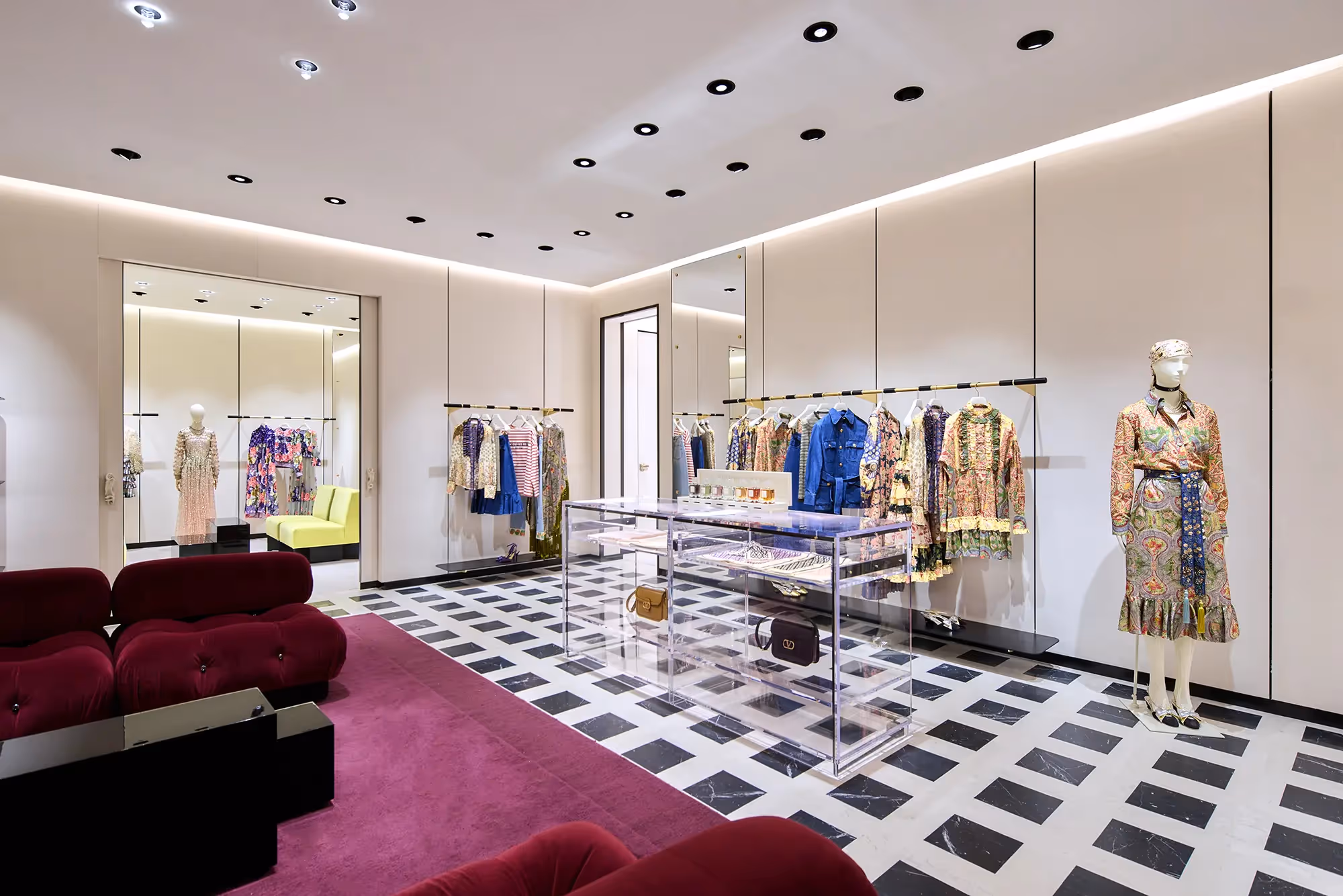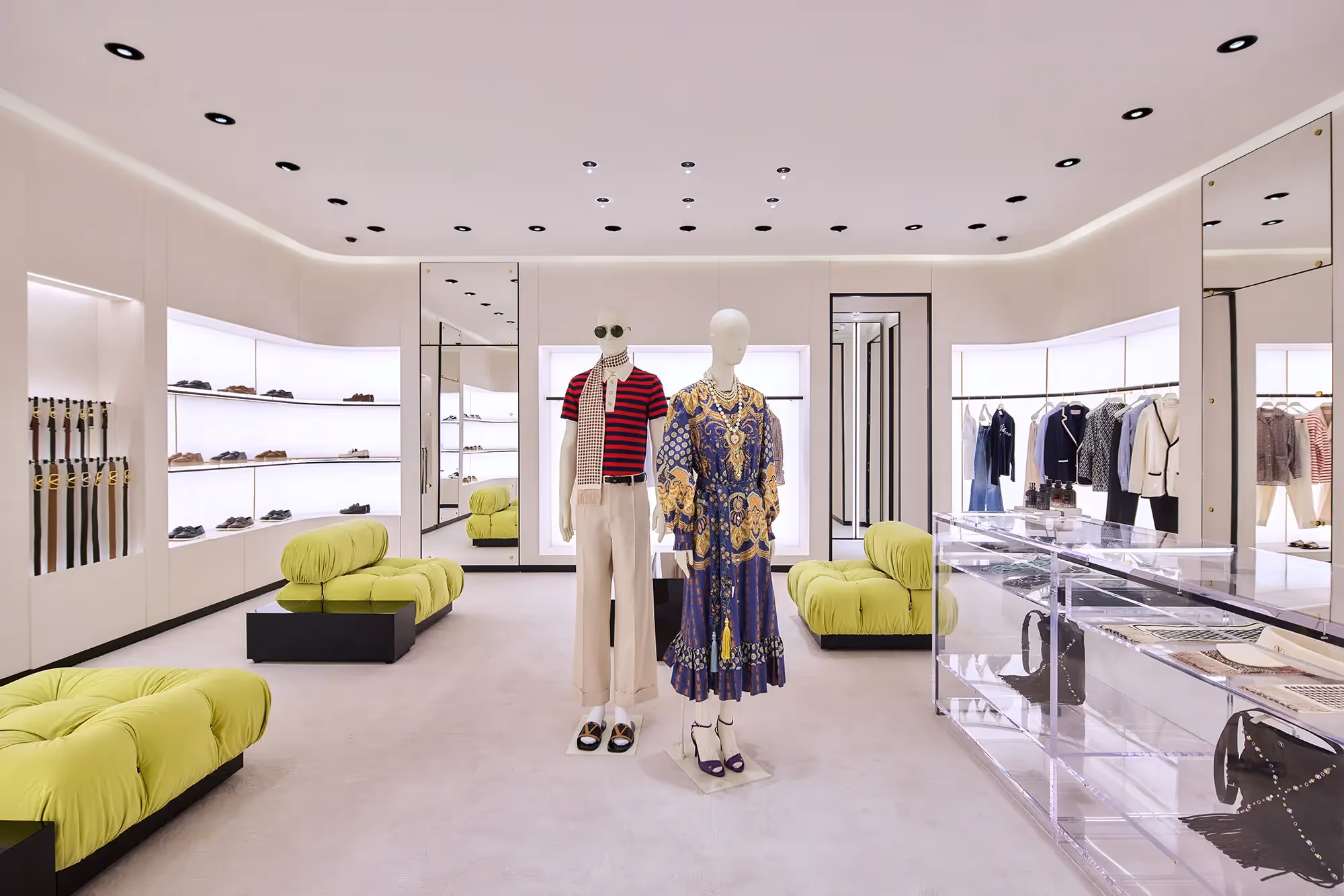 تُُعرض مجموعات الملابس الجاهزة للنساء والرجال، بالإضافة إلى إكسسوارات فالنتينو غارافاني، ومجموعات العطور، ونظارات الشمس من خلال ترتيب هادئ يبرز التفاصيل غير المتوقعة للتصميم.