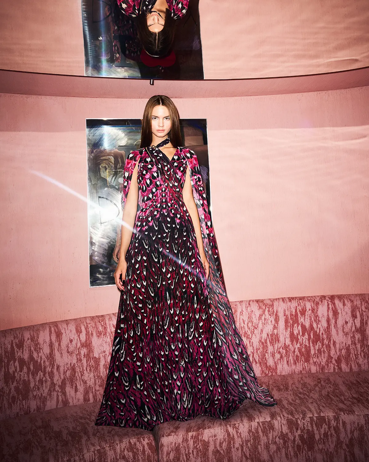 ريشة واحدة تتحول إلى إسقاط بصري ضخم ينزلق على الجسد بألوان متدرّجة كالحرباء، وأجنحة الفراشات تذوب في خصل ريشية متحركة، لتعيد الطبيعة تعريف نفسها بأسلوب سريالي يتخفى أمام العين دون أن يُرى. وتعمّق الطباعات هذا السرد الفني، حيث ترتقي طبعة Camofolia بأوراق الخريف إلى لوحات لونية مشبعة تنسجم فيها أجنحة الطيور والأوراق والزهور في مشهد تعبيري يبتكر مفهوماً جديداً للاختباء الطبيعي. وتتنوع هذه القصة بين درجات الوردي، والأخضر الاستوائي، والأزرق الطاووسي، لتنسّق بأسلوب متناغم أو متباين بجرأة، مع استخدام المخمل الفاخر، والفاييه، والتول المجعّد لمنح الطباعات عمقًا بصريًا غنيًا.