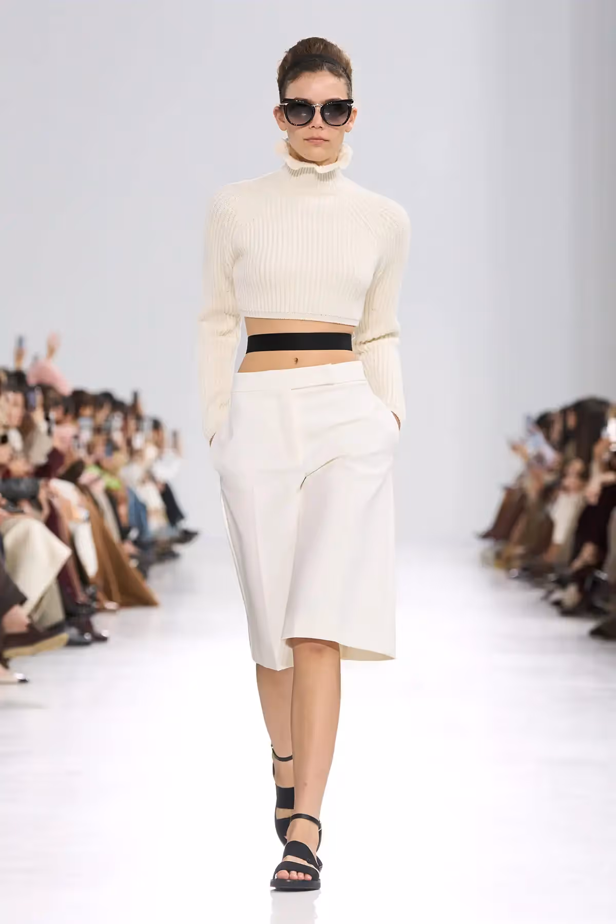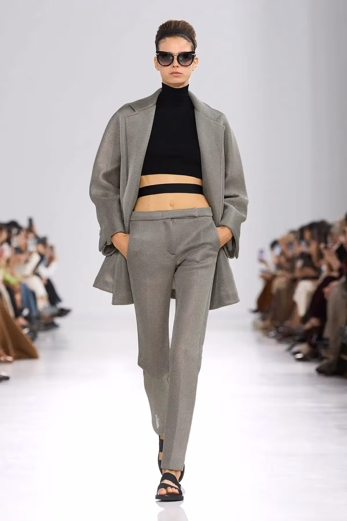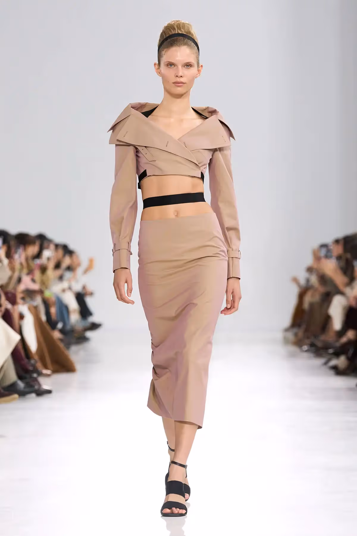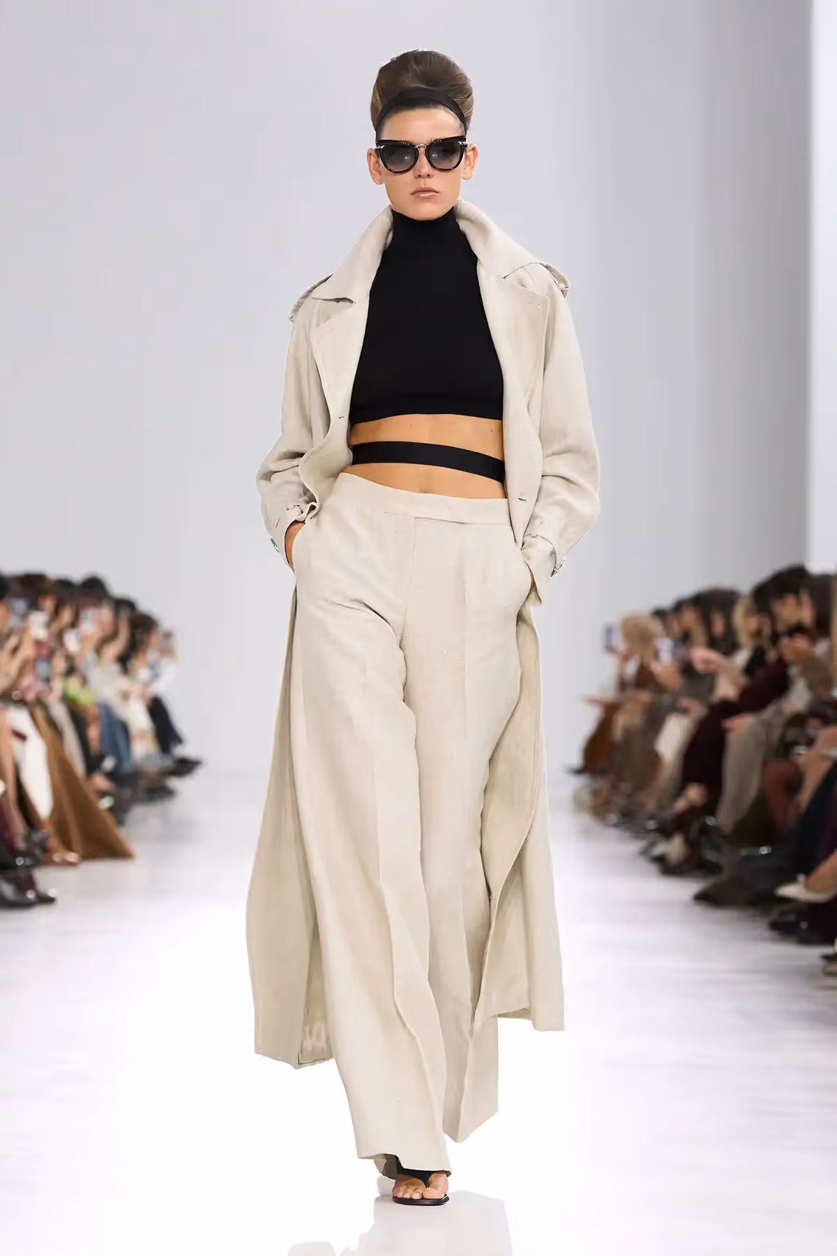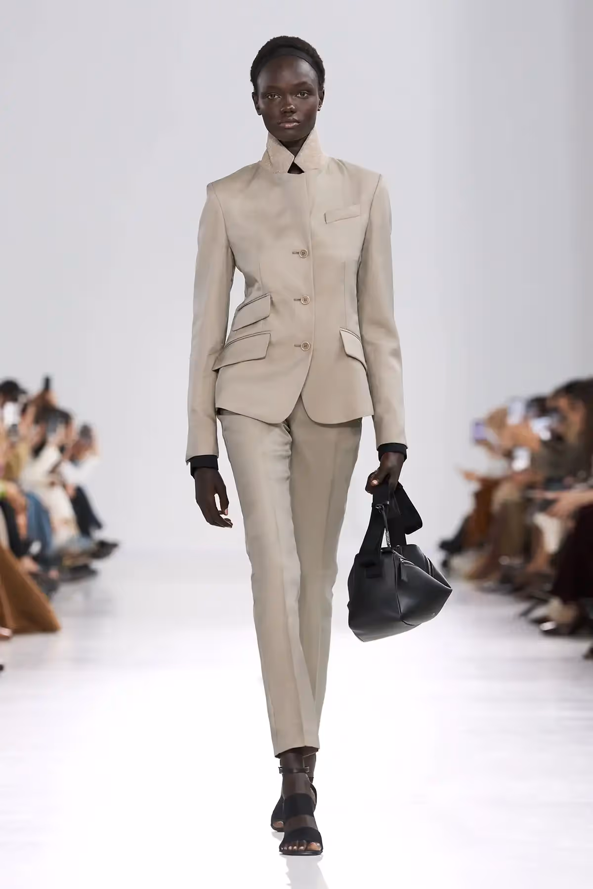 ولا يقتصر إبداع Max Mara على القصات الكلاسيكية، بل تمتد لمساتها إلى عالم الخيال، أحزمة مطاطية سوداء، وحقائب وأحذية بقصات بارزة مستوحاة من حياة Madame de Pompadour وذكائها الاستثنائي. السترات الهندسية والسراويل ذات الخصر المنخفض تمنح التشكيلة بعدًا عصريًا، يجعلها أكثر توازنًا بين الماضي والفن الحديث.