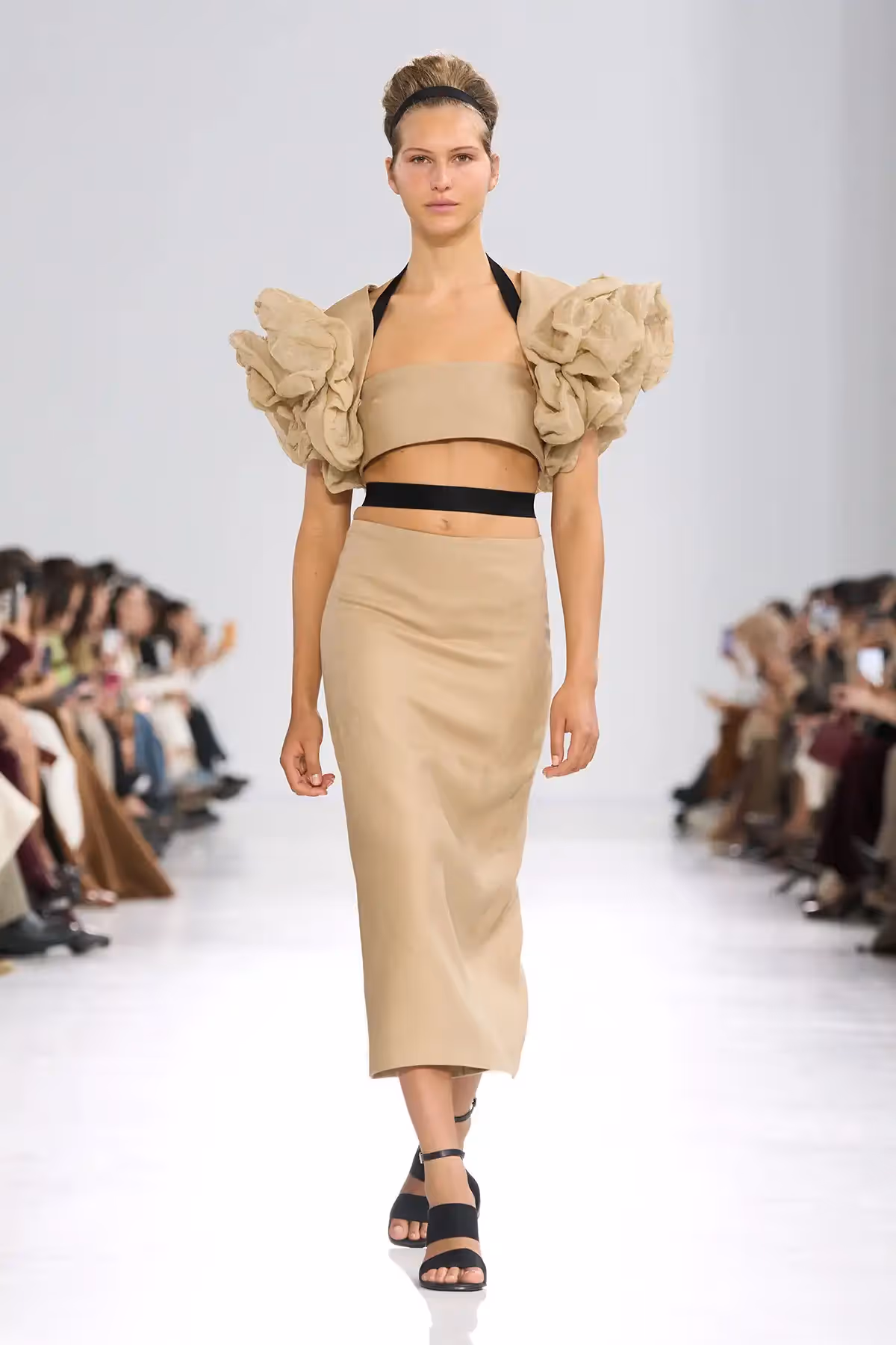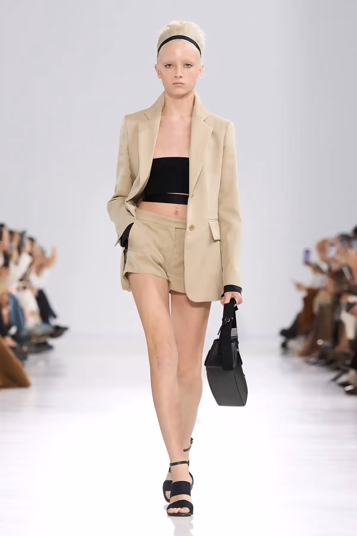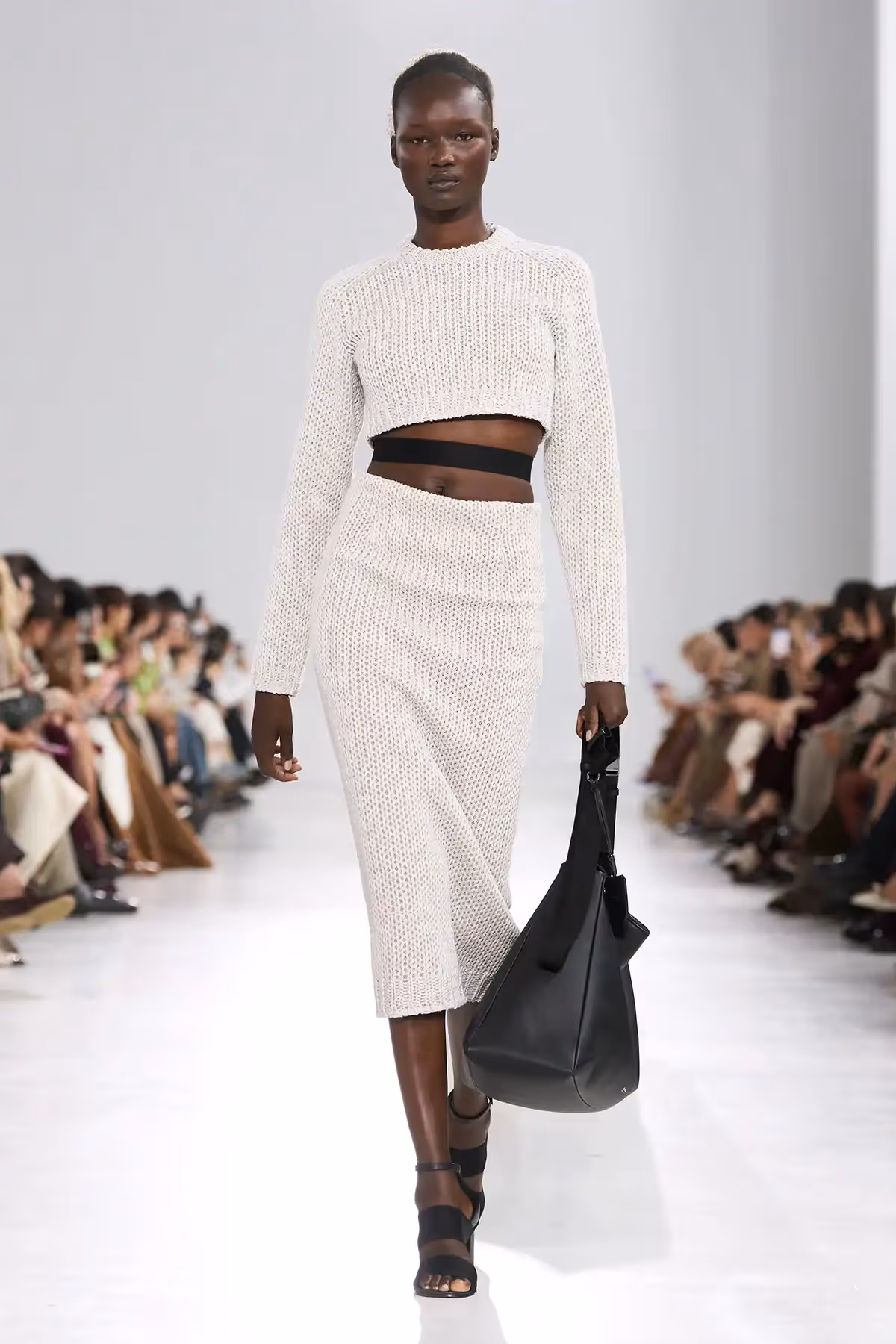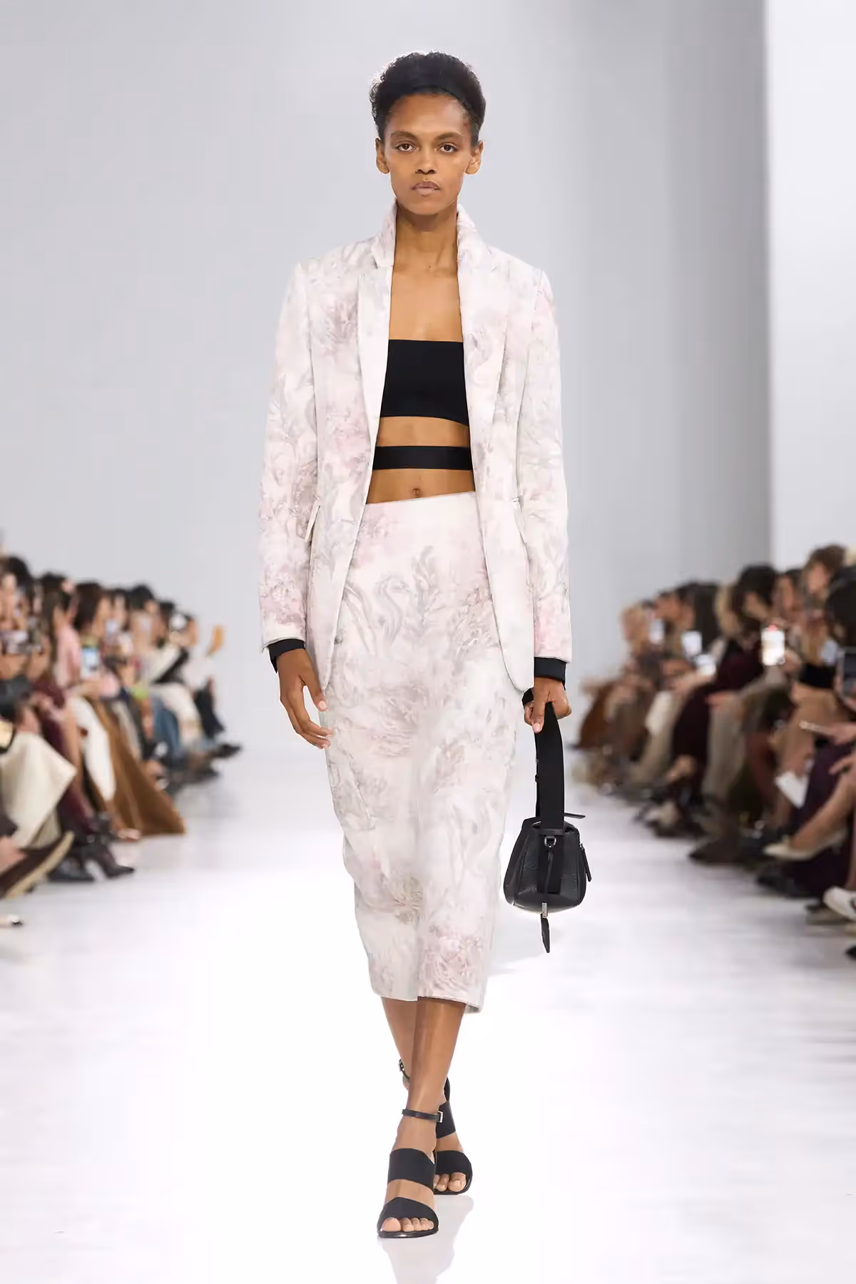ولا يقتصر إبداع Max Mara على القصات الكلاسيكية، بل تمتد لمساتها إلى عالم الخيال، أحزمة مطاطية سوداء، وحقائب وأحذية بقصات بارزة مستوحاة من حياة Madame de Pompadour وذكائها الاستثنائي. السترات الهندسية والسراويل ذات الخصر المنخفض تمنح التشكيلة بعدًا عصريًا، يجعلها أكثر توازنًا بين الماضي والفن الحديث.