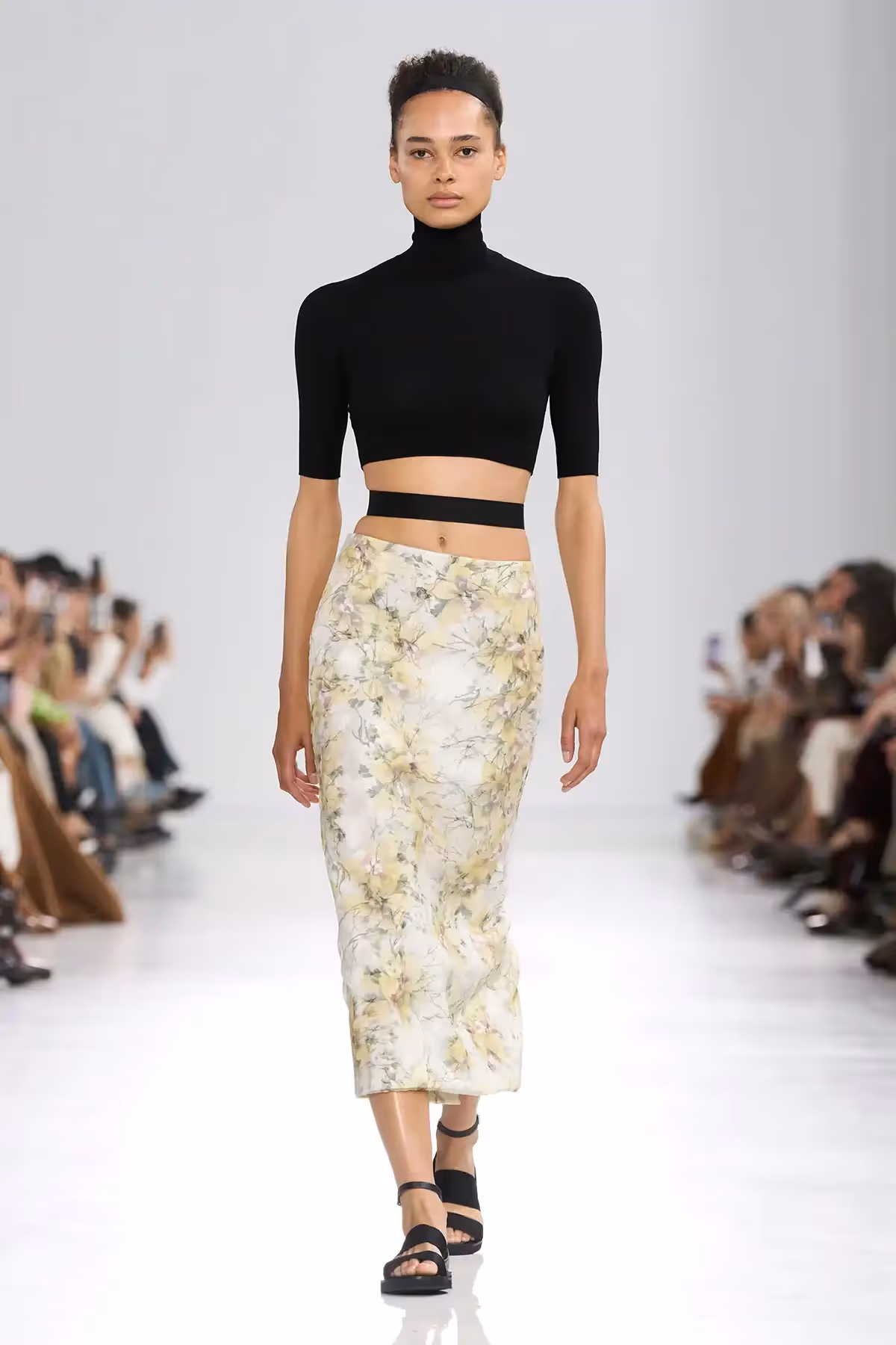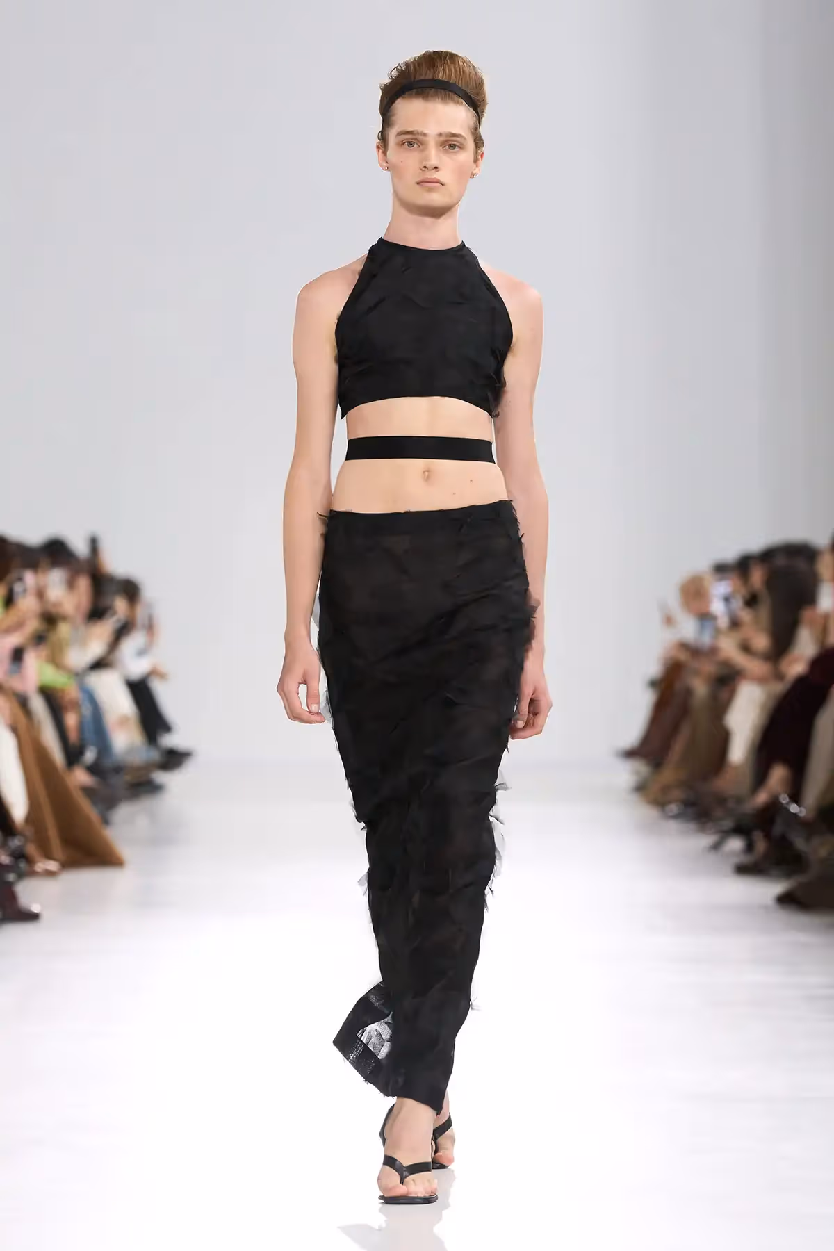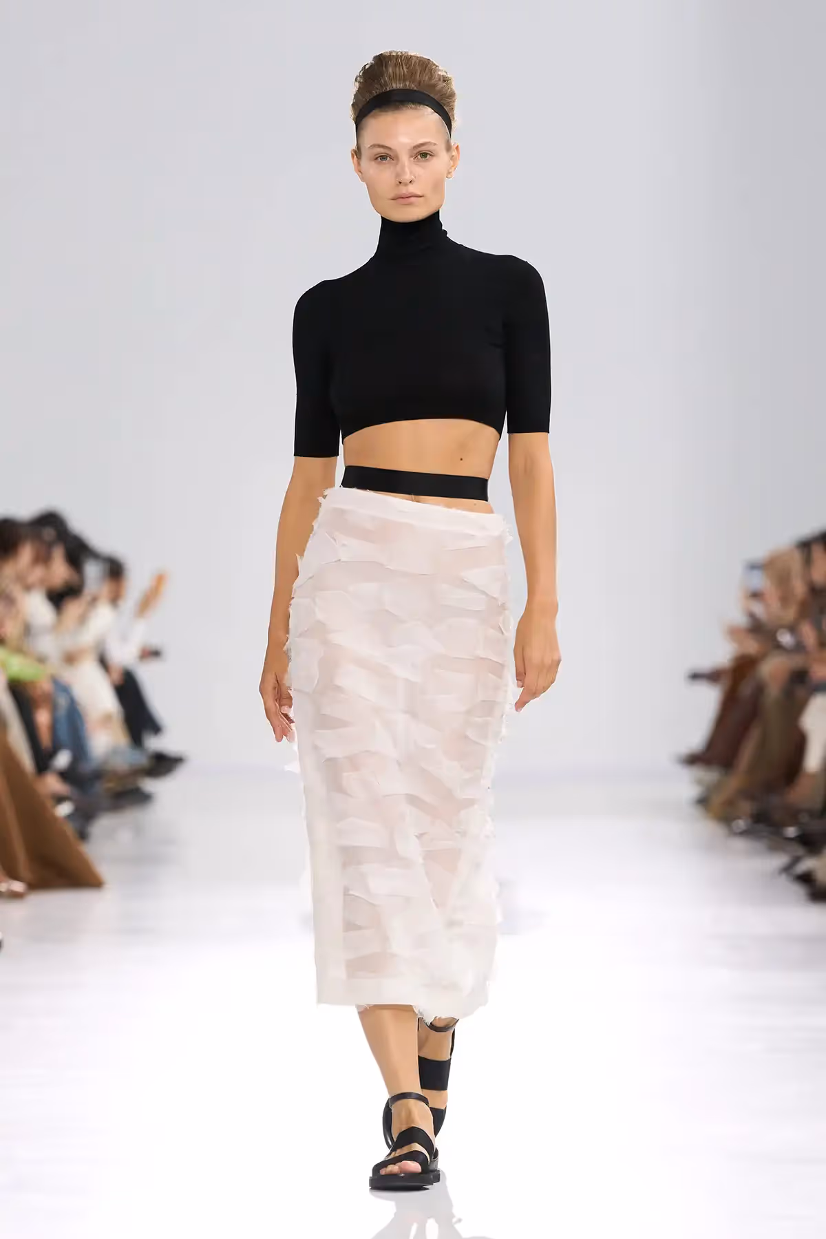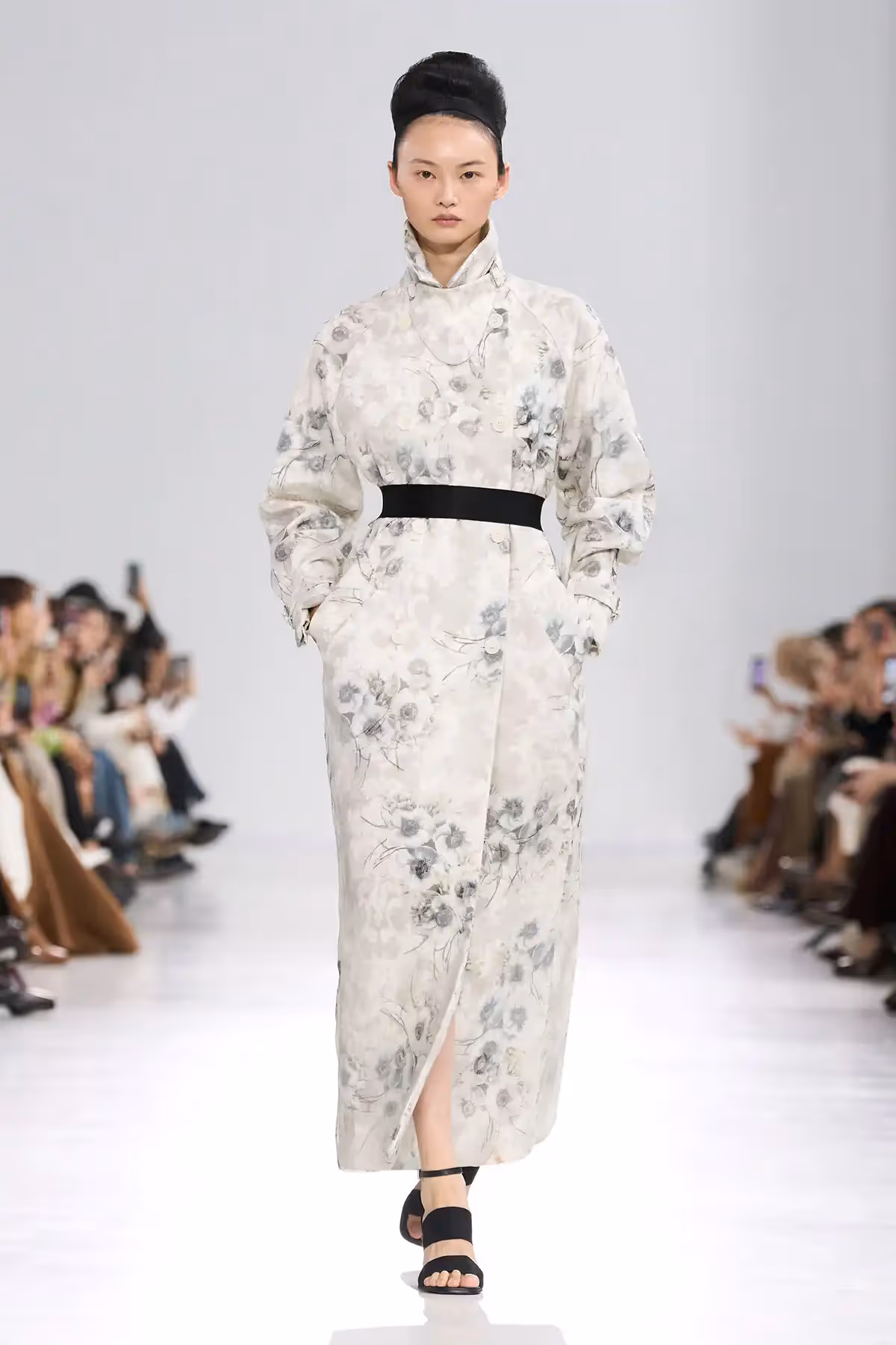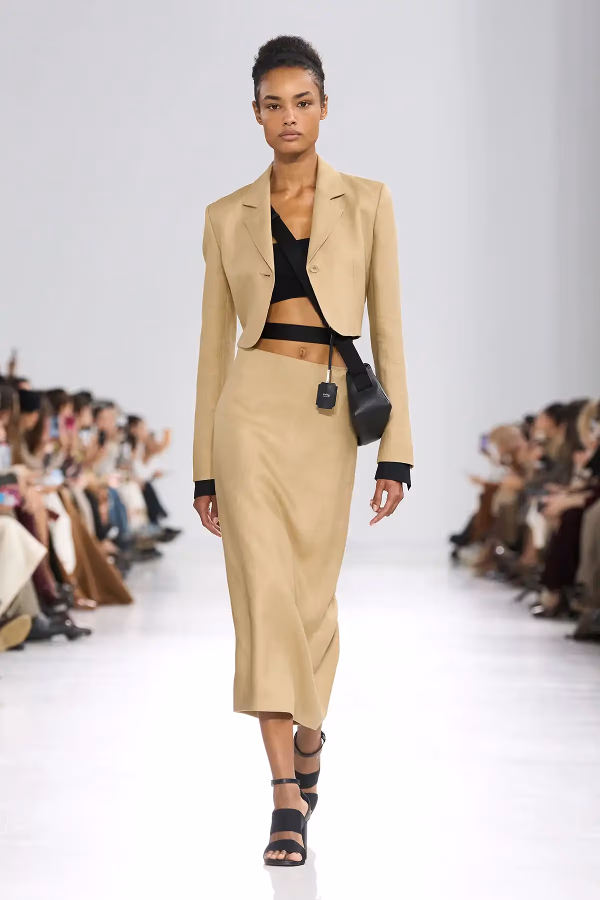 ولا يقتصر إبداع Max Mara على القصات الكلاسيكية، بل تمتد لمساتها إلى عالم الخيال، أحزمة مطاطية سوداء، وحقائب وأحذية بقصات بارزة مستوحاة من حياة Madame de Pompadour وذكائها الاستثنائي. السترات الهندسية والسراويل ذات الخصر المنخفض تمنح التشكيلة بعدًا عصريًا، يجعلها أكثر توازنًا بين الماضي والفن الحديث.