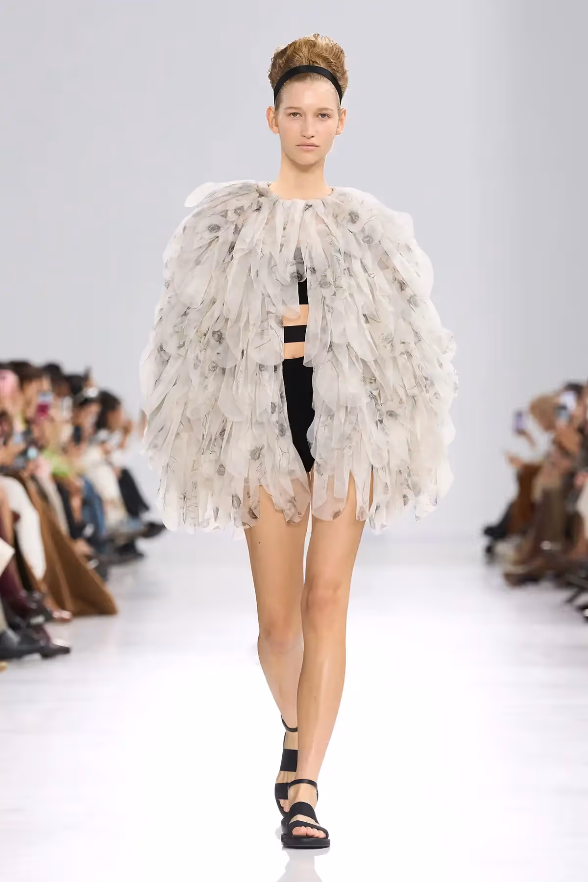 من أبرز القطع في المجموعة معطف مطري مفصل بعناية، مع أكتاف مطوية تحاكي أوراق نبات الأقنثة أو ريش الطيور الرائعة، يليه تنورة ضيقة بشعار يلتف حول الخصر مستلهم من المخلوقات المائية، وتنورة أخرى مصممة بالكثير من الطبقات المطوية من الأورجانزا، لتشبه بتلات الأزهار الرقيقة وأوراق شقائق النعمان.