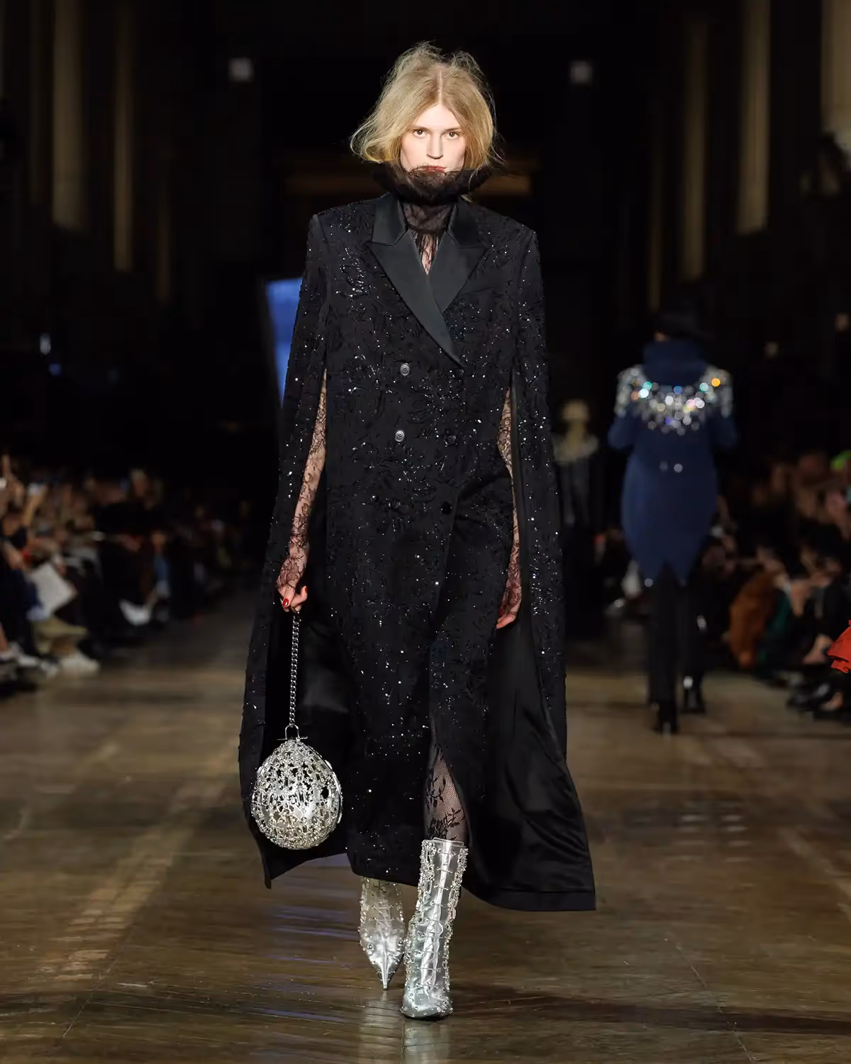 وتتميز التصاميم بلمسات فنية مبتكرة تظهر التباين بين الأقمشة العملية والمجوهرات الفاخرة في سترات باركا الطويلة ذات الأطراف اللامعة التي تعكس أضواء مدينة لندن.