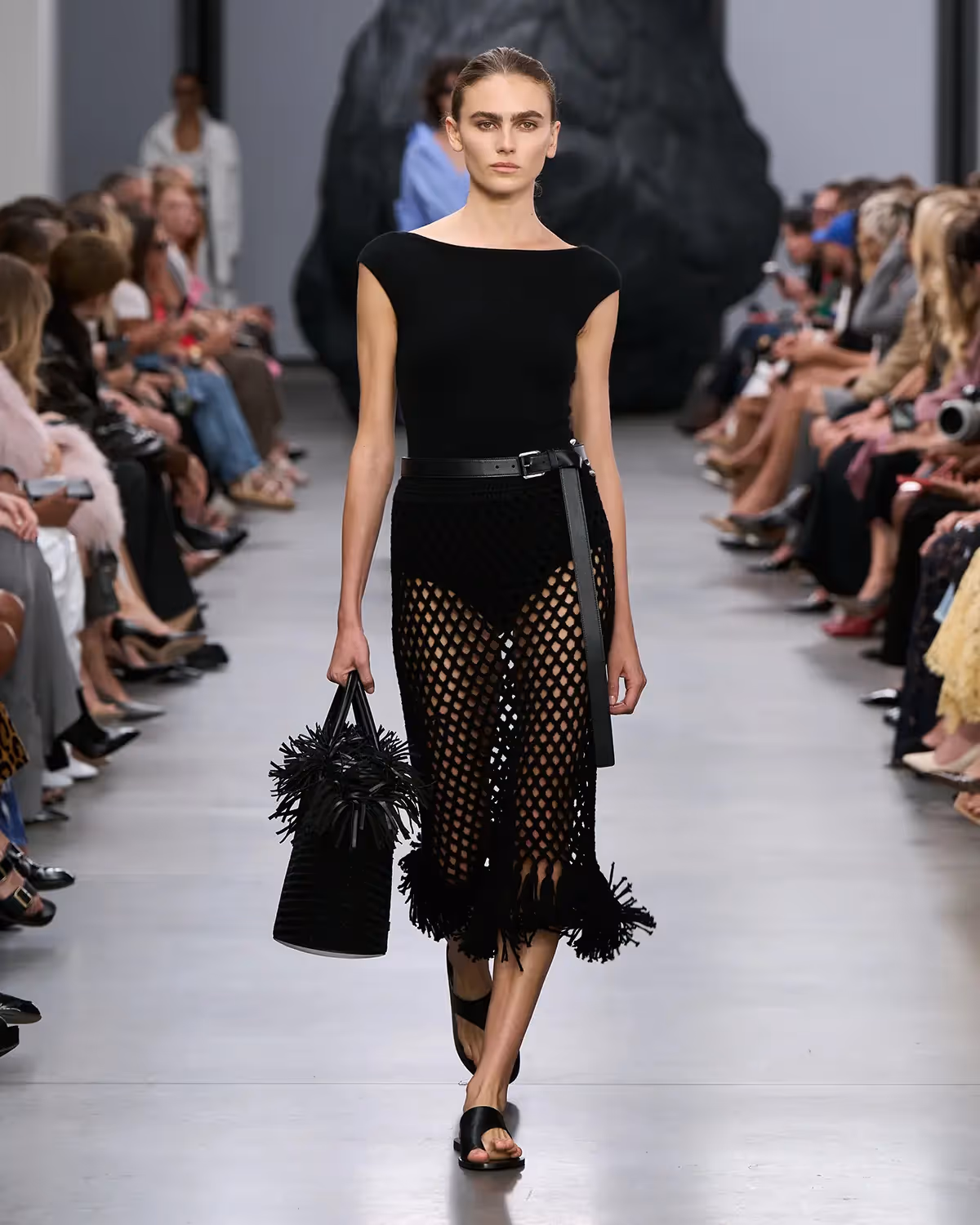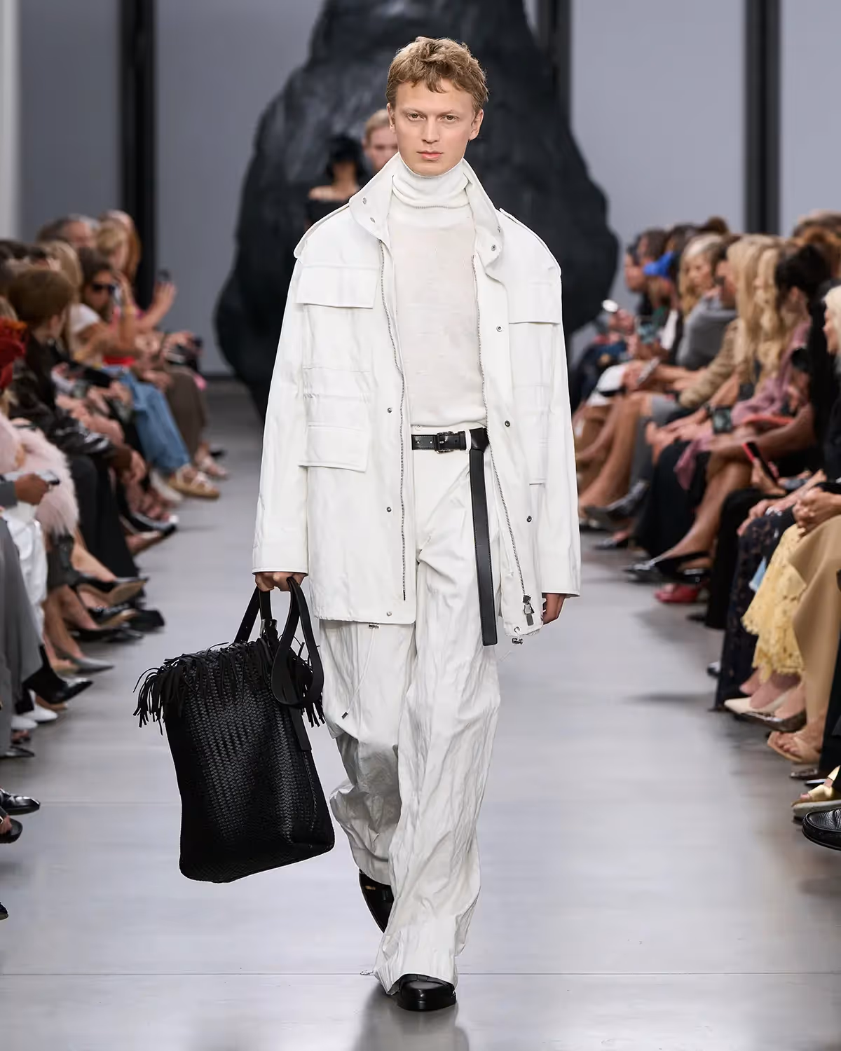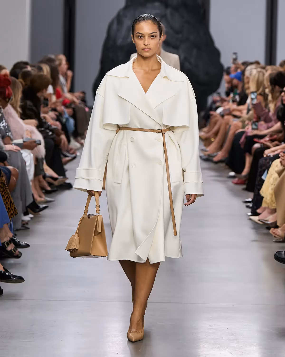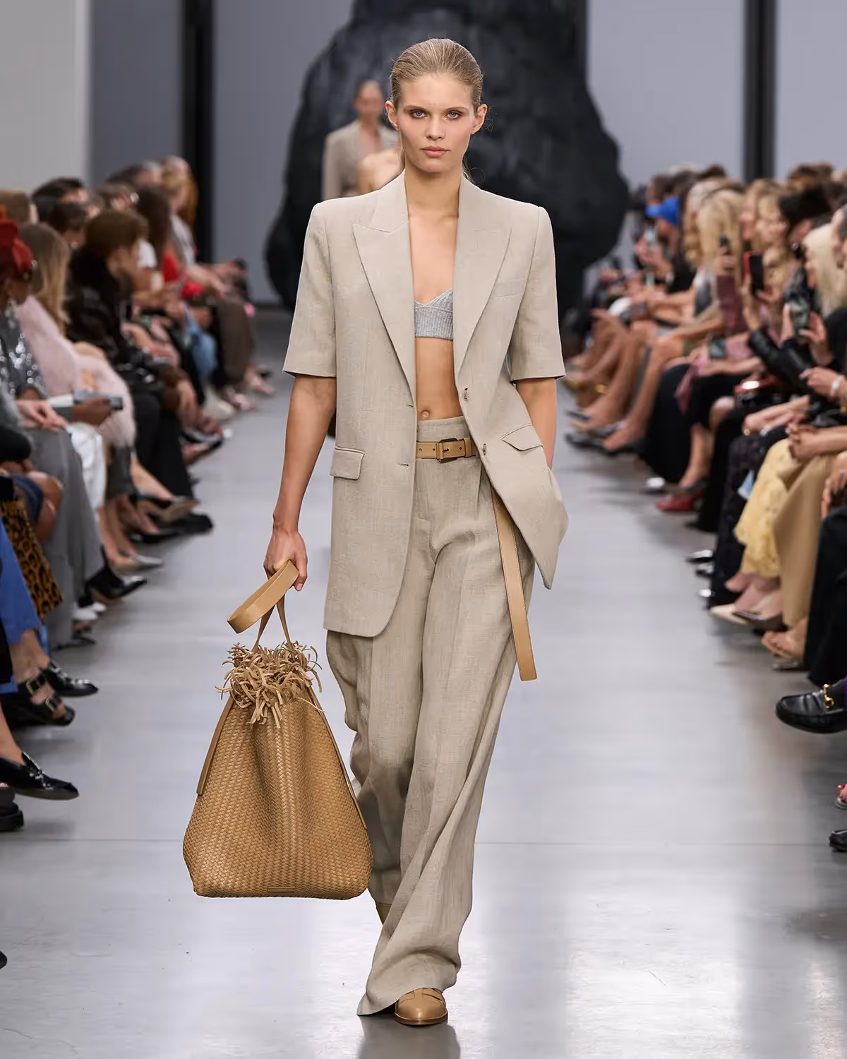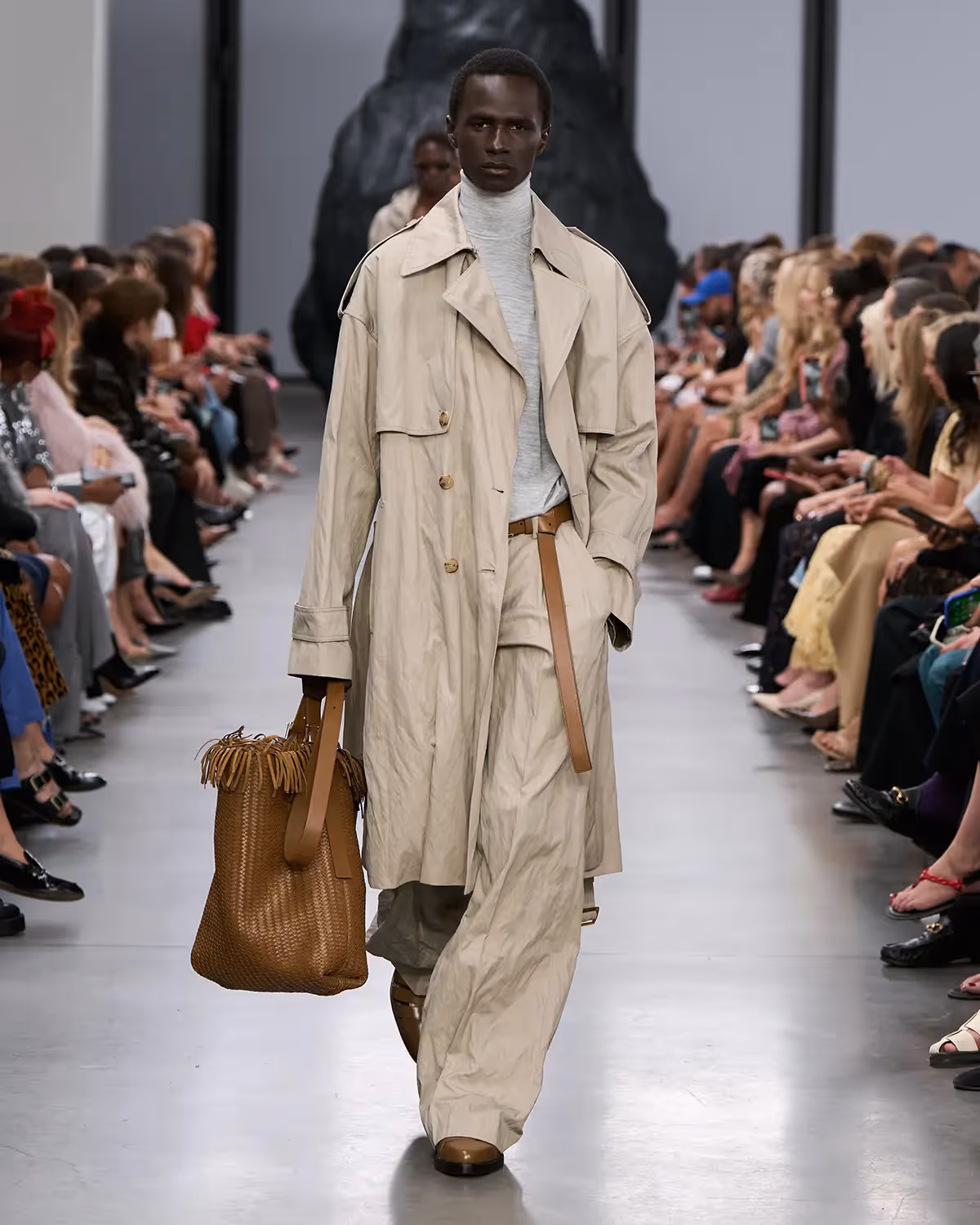 على المنصة، تُعانق درجات الأبيض والأسود بملمسها الغني الدرجات الترابية الدافئة، من الشوكولا الداكنة إلى البيج البراق، مروراً بتدرجات الأزرق والأخضر المشرقة. أما الأحذية، فتتراوح بين الكعوب المنحوتة بإبداع وصنادل المدينة من دون كعب المستوحاة من أحذية الصيادين. وتكتمل اللوحة بحقائب التسوق والـ bucket المصنوعة يدوياً من الجلد المضفور، مزينة بأهداب فنية ومقابض مجدولة بمهارة، لتؤكد على روعة الحرفية في صنع كل قطعة من أصغر تفاصيلها إلى أكبرها.