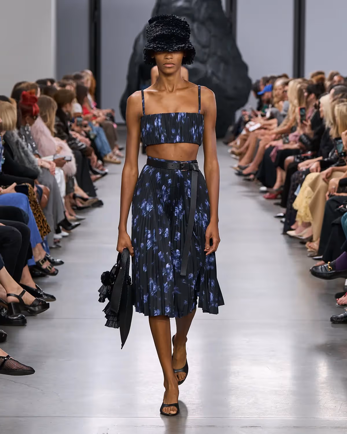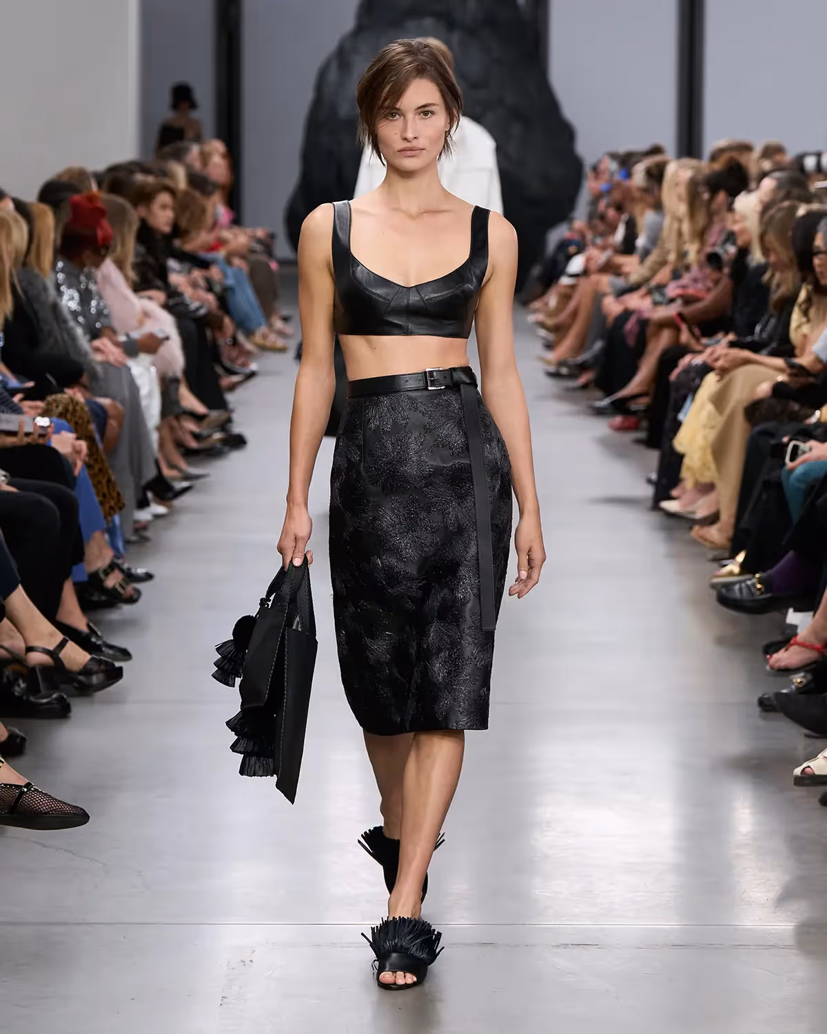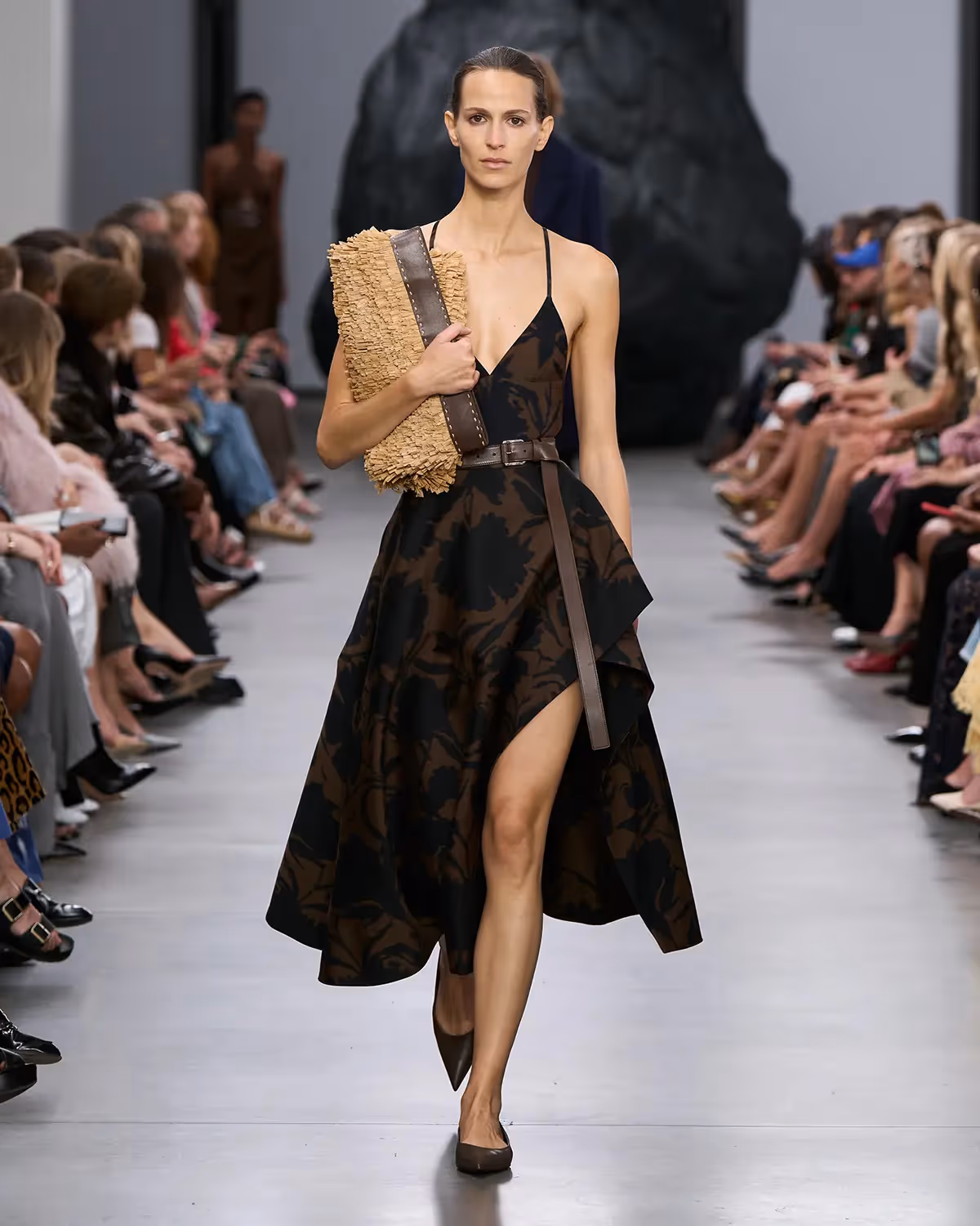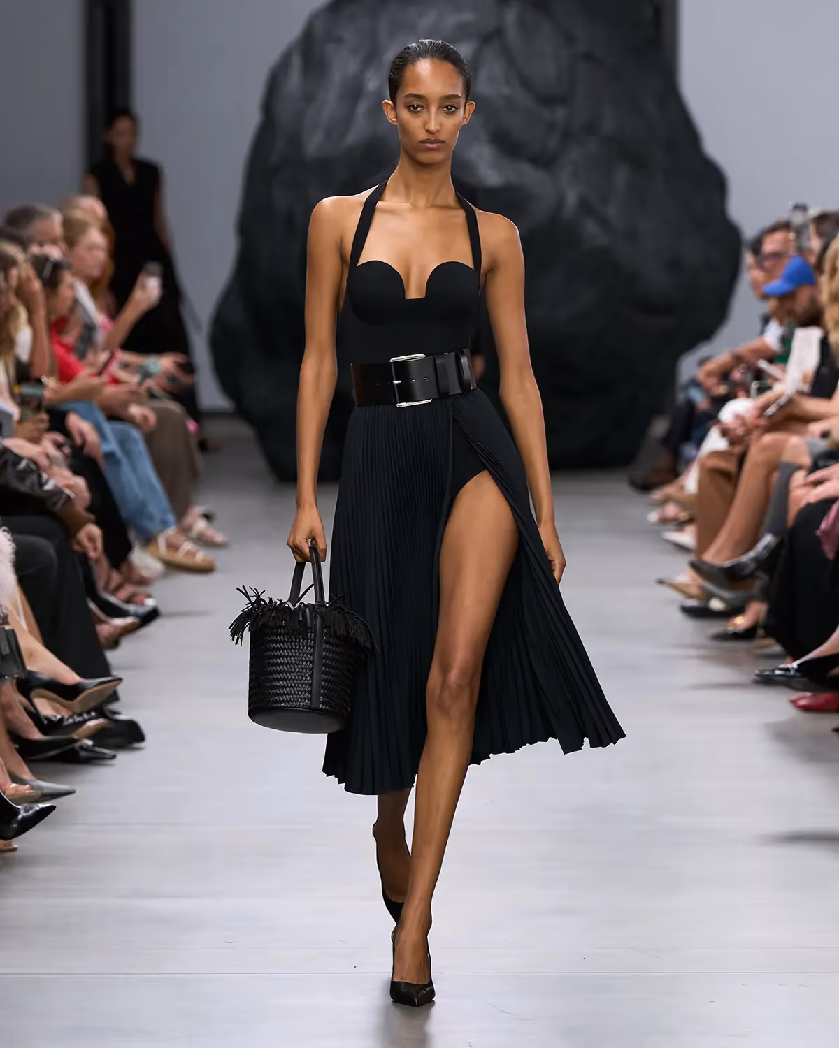 على المنصة، تُعانق درجات الأبيض والأسود بملمسها الغني الدرجات الترابية الدافئة، من الشوكولا الداكنة إلى البيج البراق، مروراً بتدرجات الأزرق والأخضر المشرقة. أما الأحذية، فتتراوح بين الكعوب المنحوتة بإبداع وصنادل المدينة من دون كعب المستوحاة من أحذية الصيادين. وتكتمل اللوحة بحقائب التسوق والـ bucket المصنوعة يدوياً من الجلد المضفور، مزينة بأهداب فنية ومقابض مجدولة بمهارة، لتؤكد على روعة الحرفية في صنع كل قطعة من أصغر تفاصيلها إلى أكبرها.