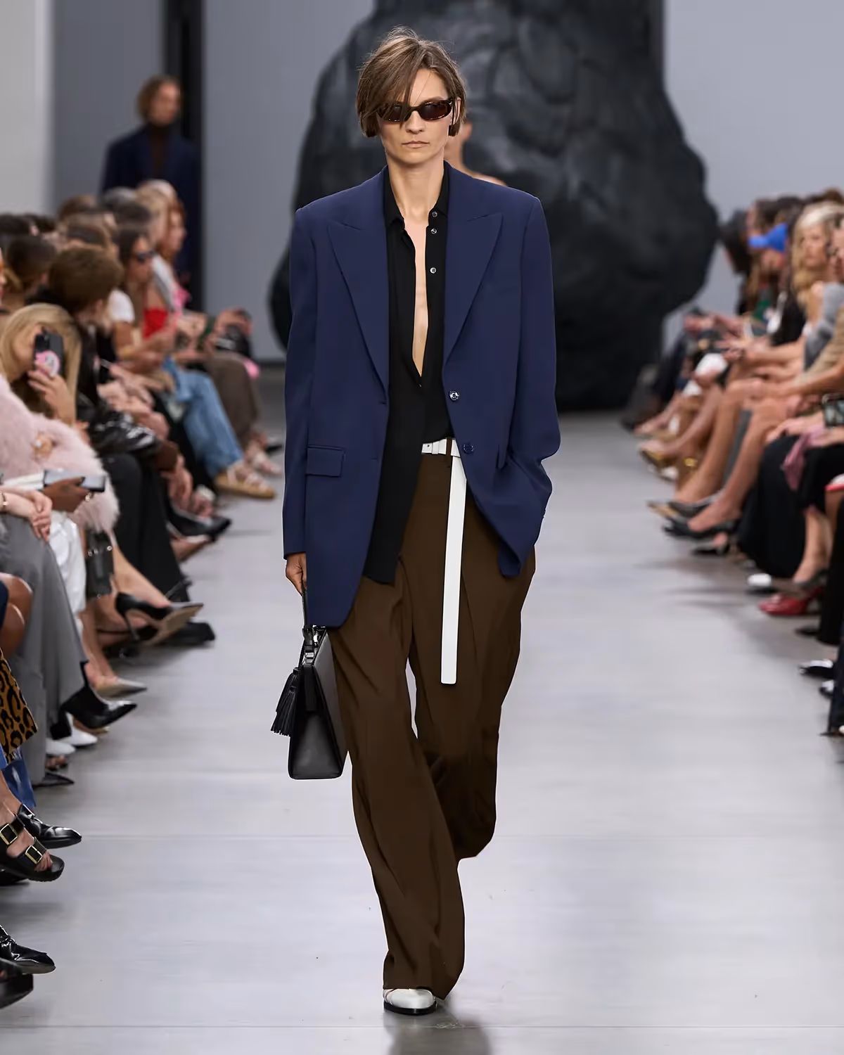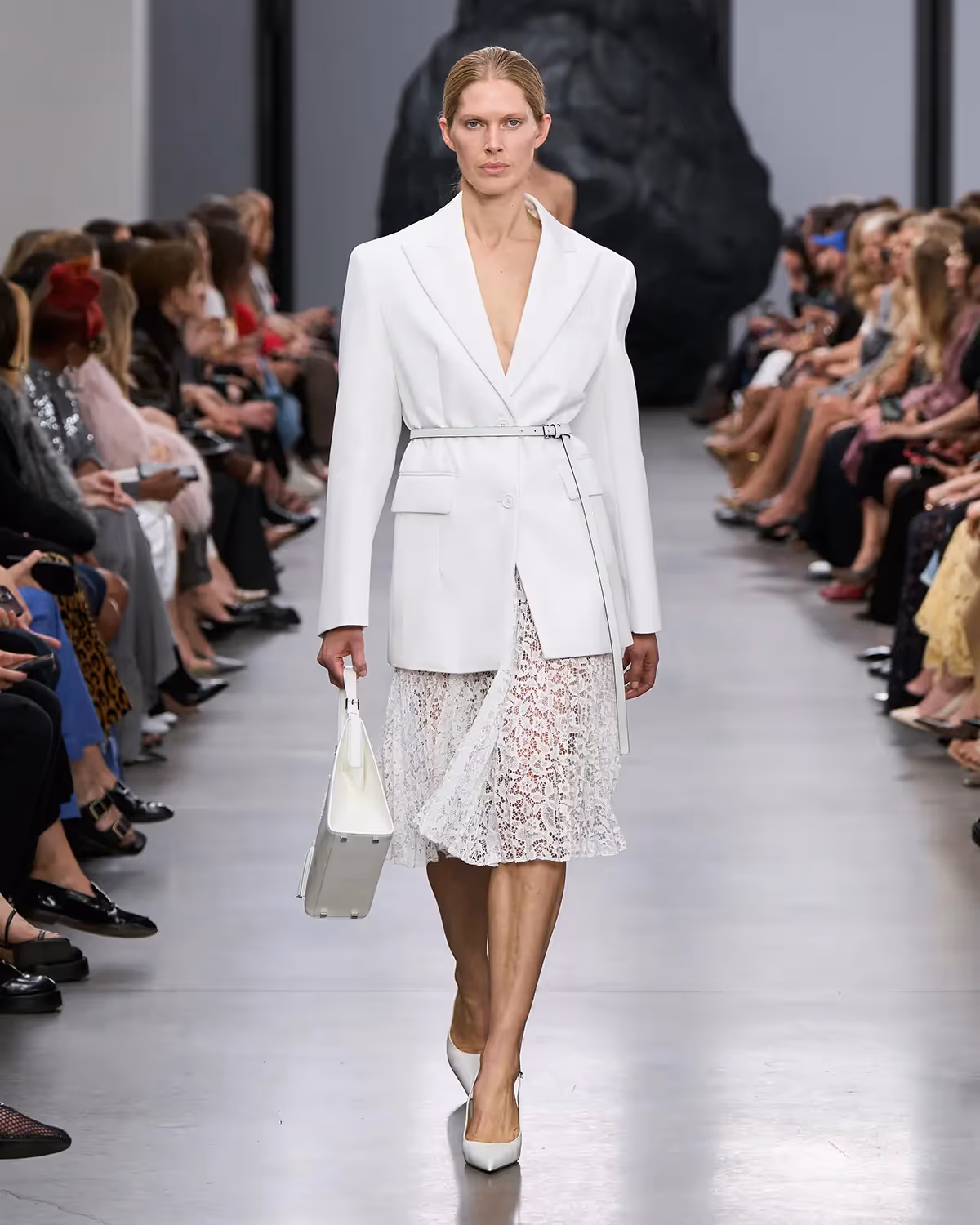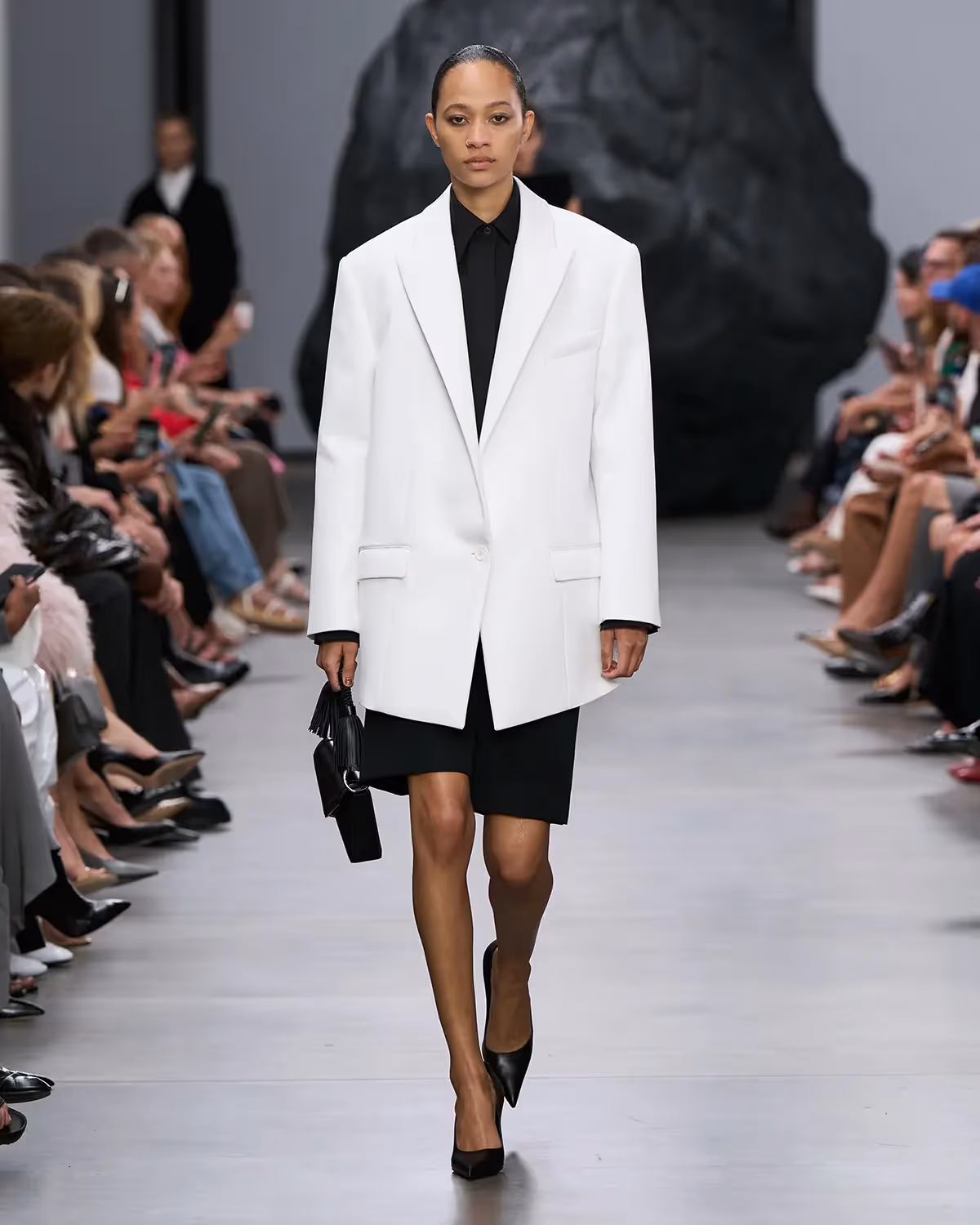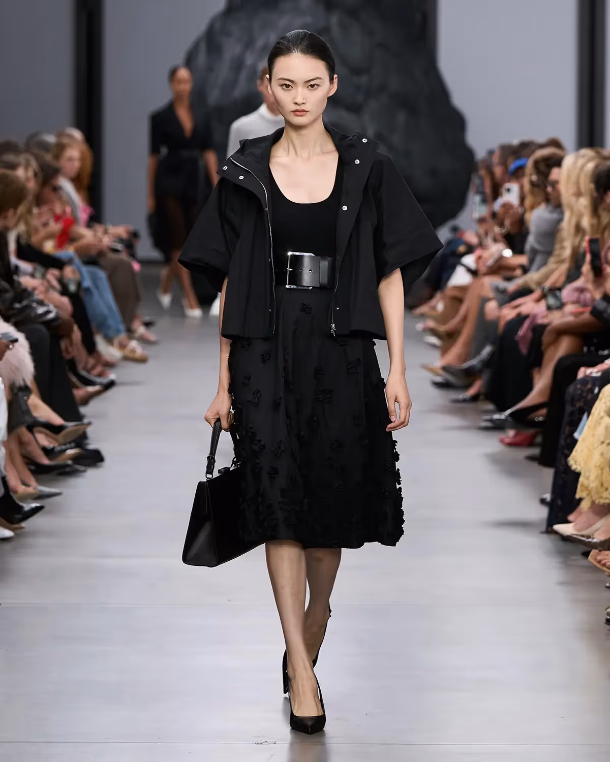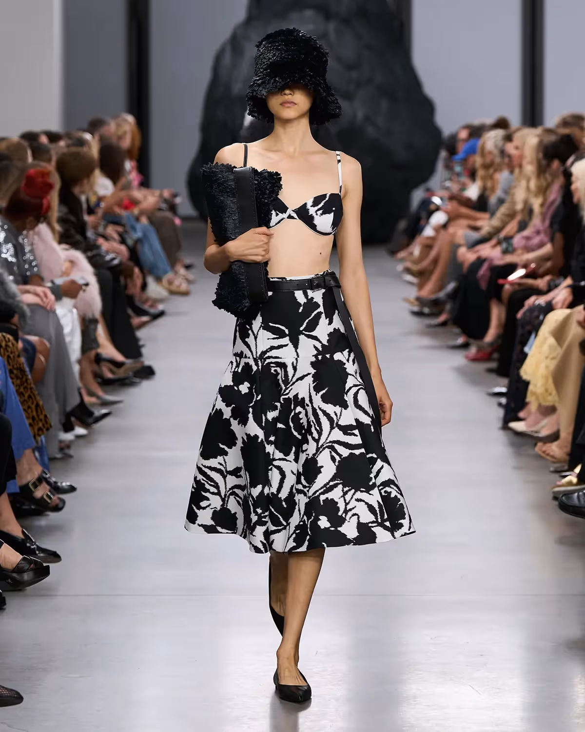 على المنصة، تُعانق درجات الأبيض والأسود بملمسها الغني الدرجات الترابية الدافئة، من الشوكولا الداكنة إلى البيج البراق، مروراً بتدرجات الأزرق والأخضر المشرقة. أما الأحذية، فتتراوح بين الكعوب المنحوتة بإبداع وصنادل المدينة من دون كعب المستوحاة من أحذية الصيادين. وتكتمل اللوحة بحقائب التسوق والـ bucket المصنوعة يدوياً من الجلد المضفور، مزينة بأهداب فنية ومقابض مجدولة بمهارة، لتؤكد على روعة الحرفية في صنع كل قطعة من أصغر تفاصيلها إلى أكبرها.