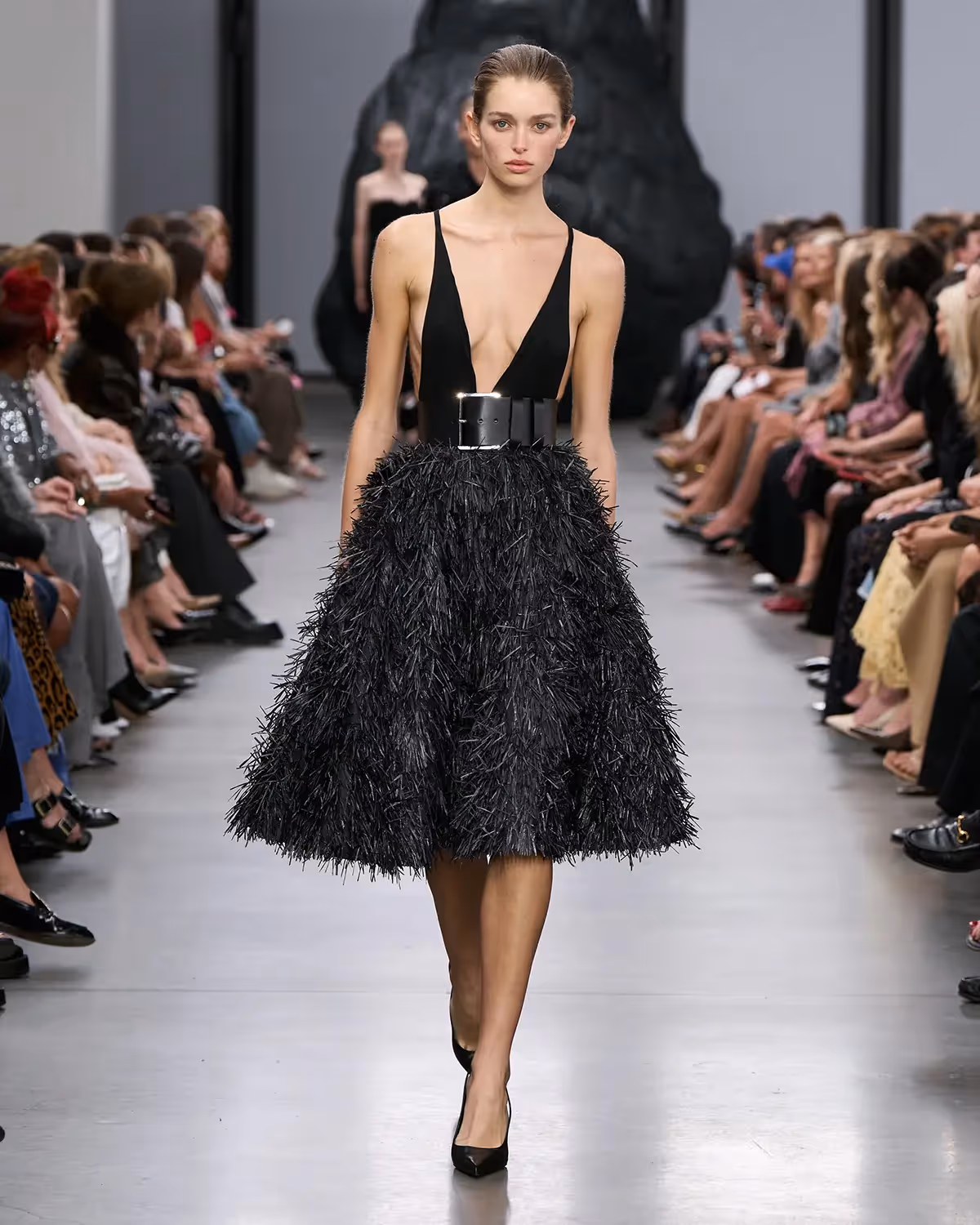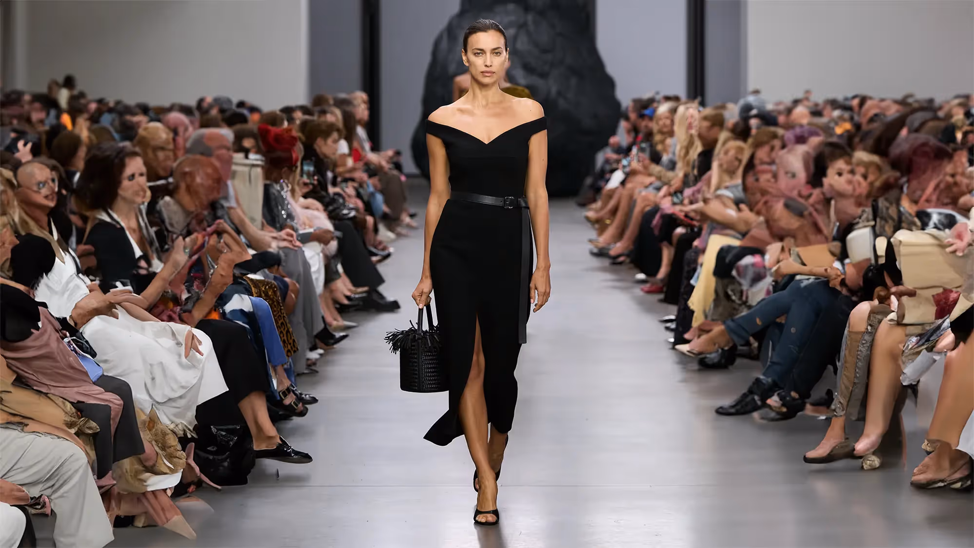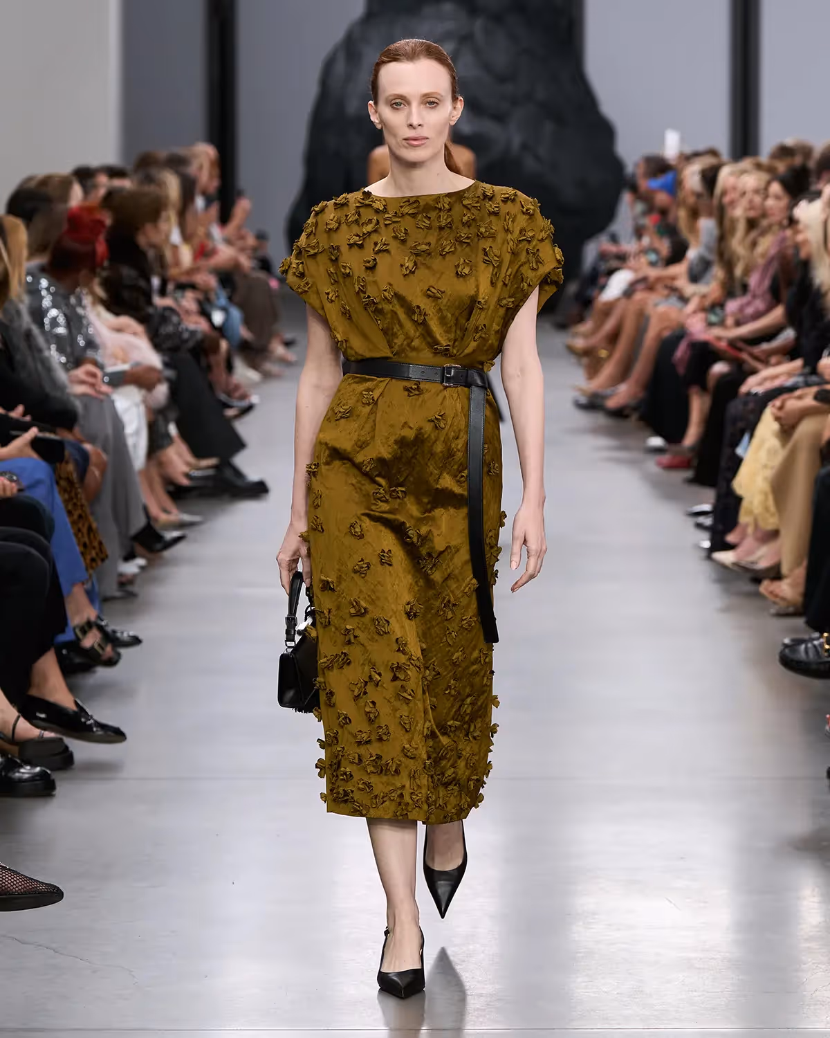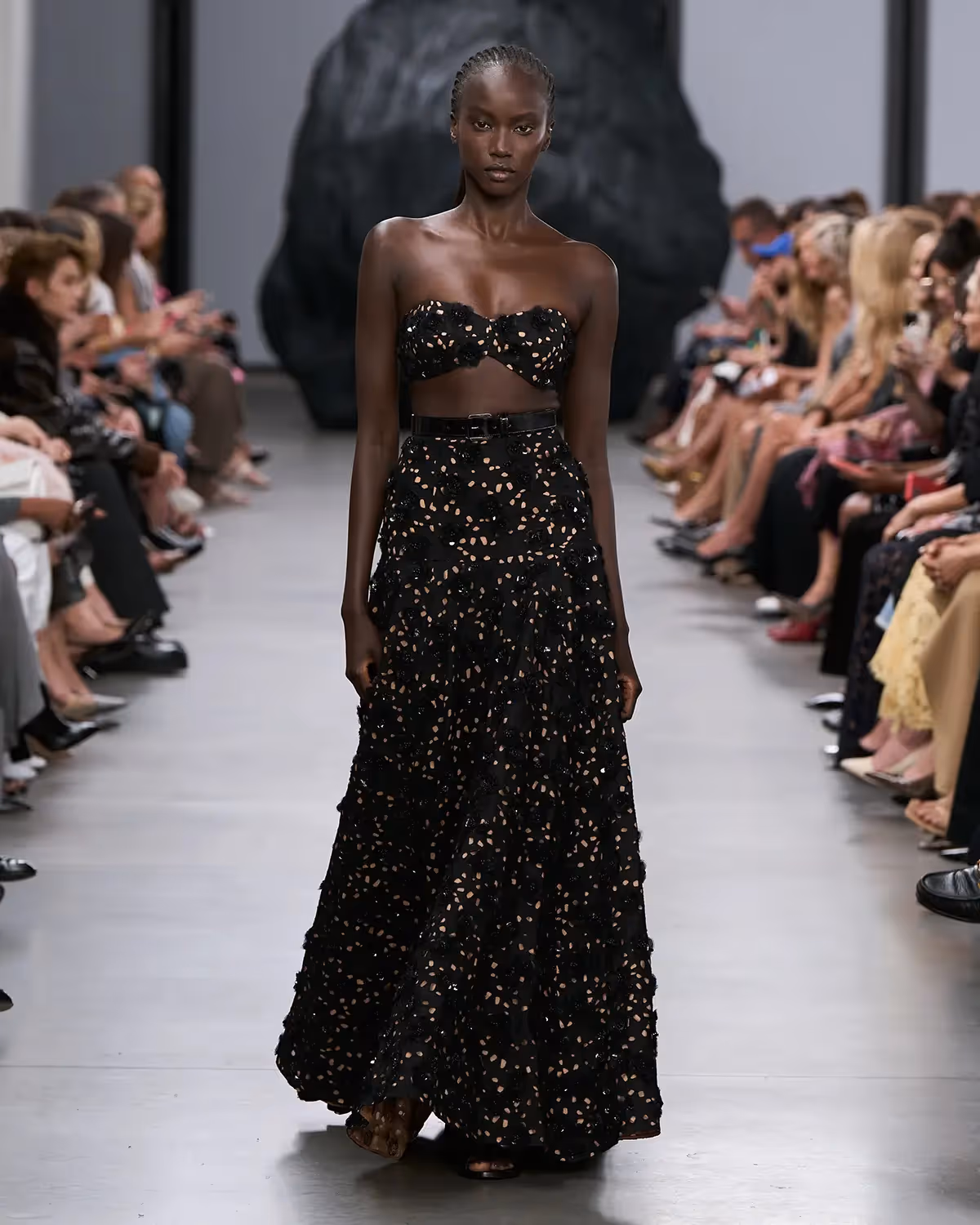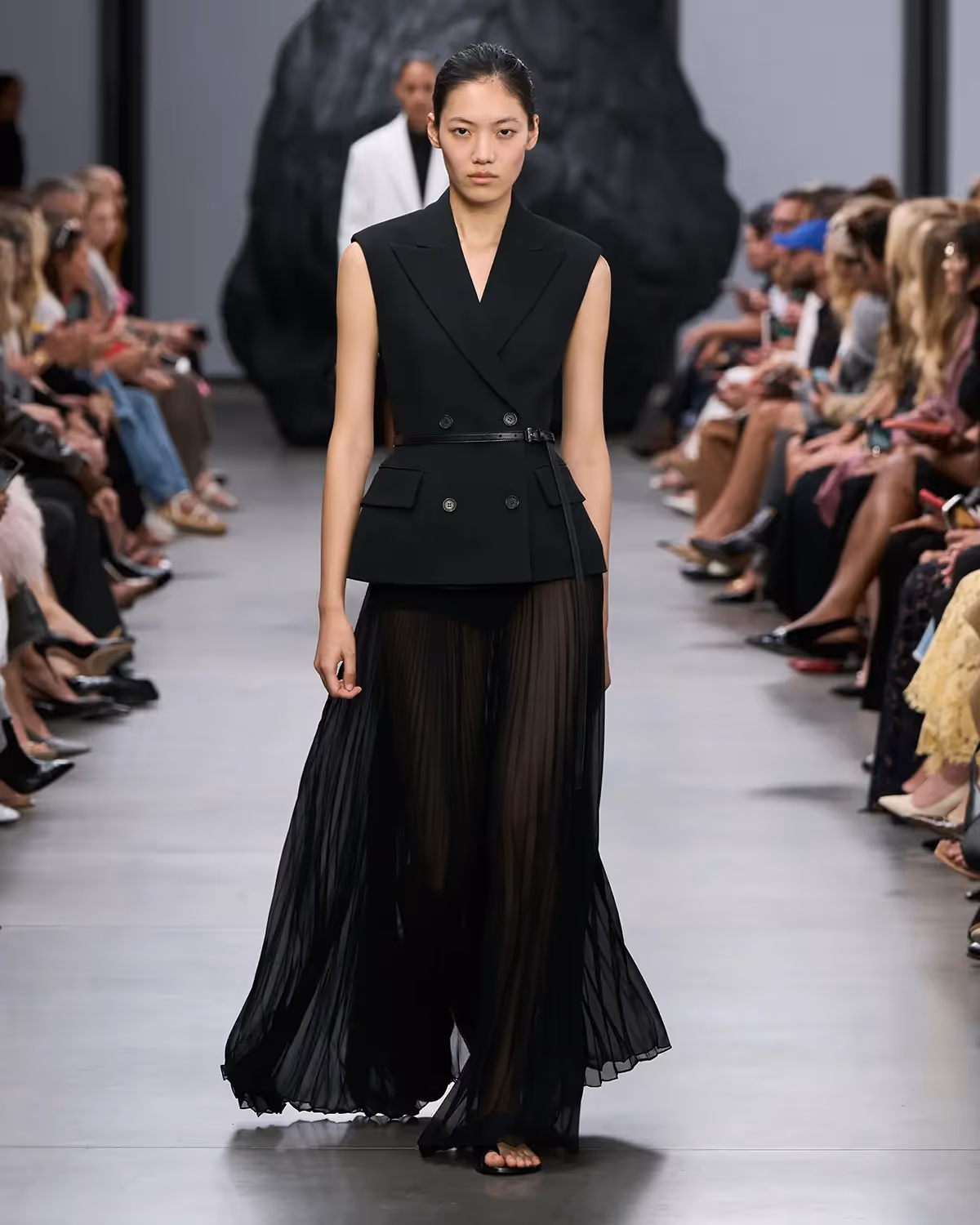 على المنصة، تُعانق درجات الأبيض والأسود بملمسها الغني الدرجات الترابية الدافئة، من الشوكولا الداكنة إلى البيج البراق، مروراً بتدرجات الأزرق والأخضر المشرقة. أما الأحذية، فتتراوح بين الكعوب المنحوتة بإبداع وصنادل المدينة من دون كعب المستوحاة من أحذية الصيادين. وتكتمل اللوحة بحقائب التسوق والـ bucket المصنوعة يدوياً من الجلد المضفور، مزينة بأهداب فنية ومقابض مجدولة بمهارة، لتؤكد على روعة الحرفية في صنع كل قطعة من أصغر تفاصيلها إلى أكبرها.