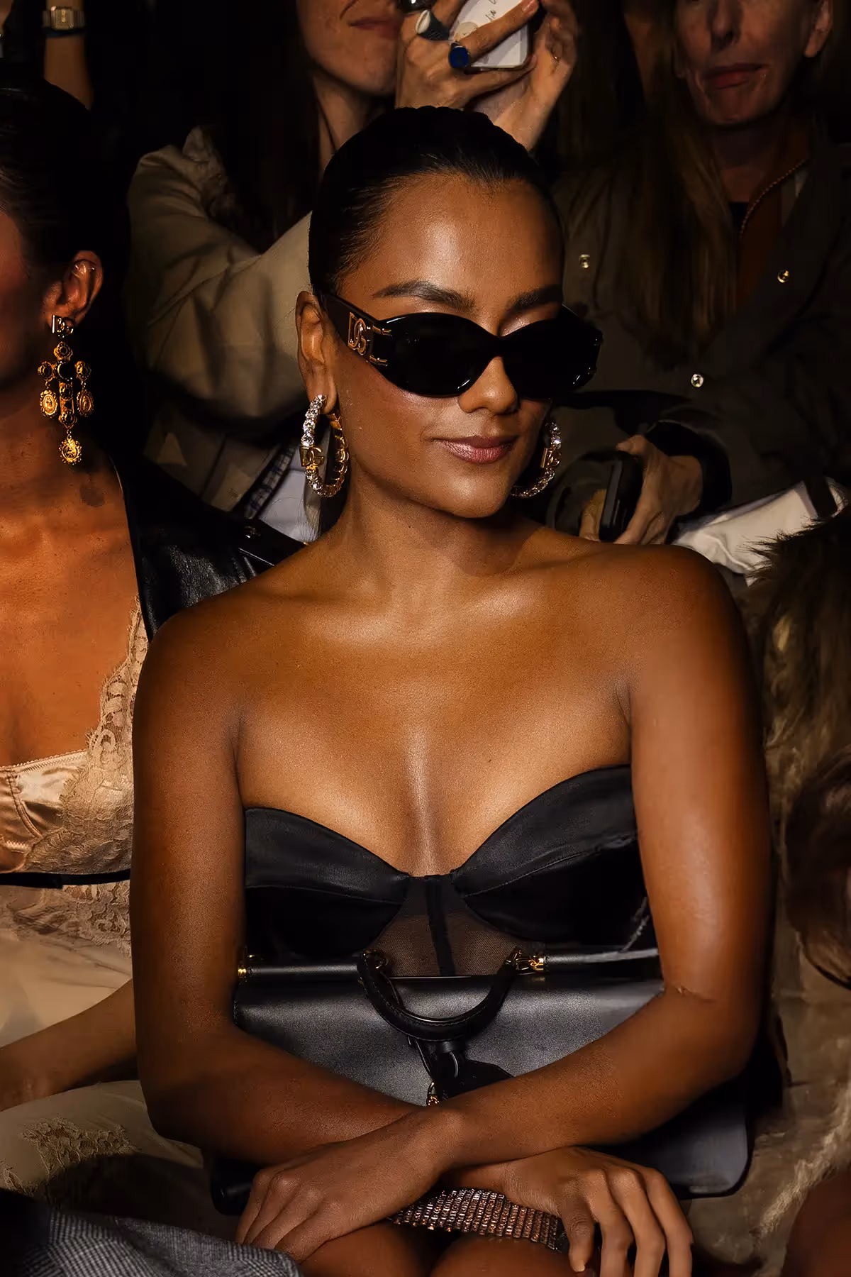 اختارت سيمون آشلي إطلالة آسرة من كورسيه تول مع تفاصيل من الساتان، نسقته مع تنورة من الشبك الكريستالي من مجموعة خريف وشتاء 2024-2025، وسروال قصير مستوحى من الكورسيه بشعار DG، وحملت حقيبة يد من الجلد الأسود من مجموعة MySicily، مع حذاء بكعب لامع من الجلد الأسود اللامع.