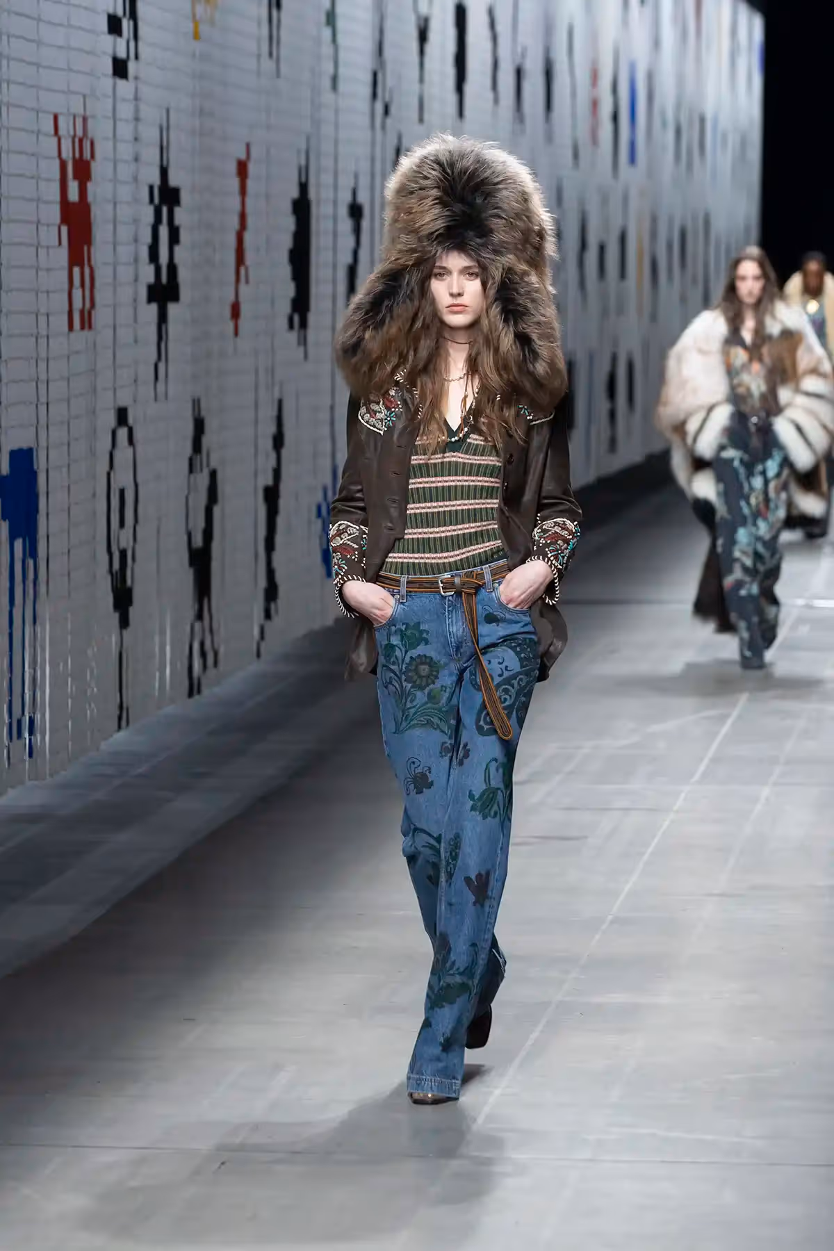 يُضيف الصوف الخام غير المصقول لمسة بدائية تستدعي مشاهد الطبيعة البرية، وتظهر هذه التفاصيل على القبعات والمعاطف. أما في أزياء الرجال، فتمتد هذه العناصر إلى السترات، والمعاطف الواسعة، والمعاطف الطويلة، بالإضافة إلى المخمل المزخرف بطبعات سيكاديلية.