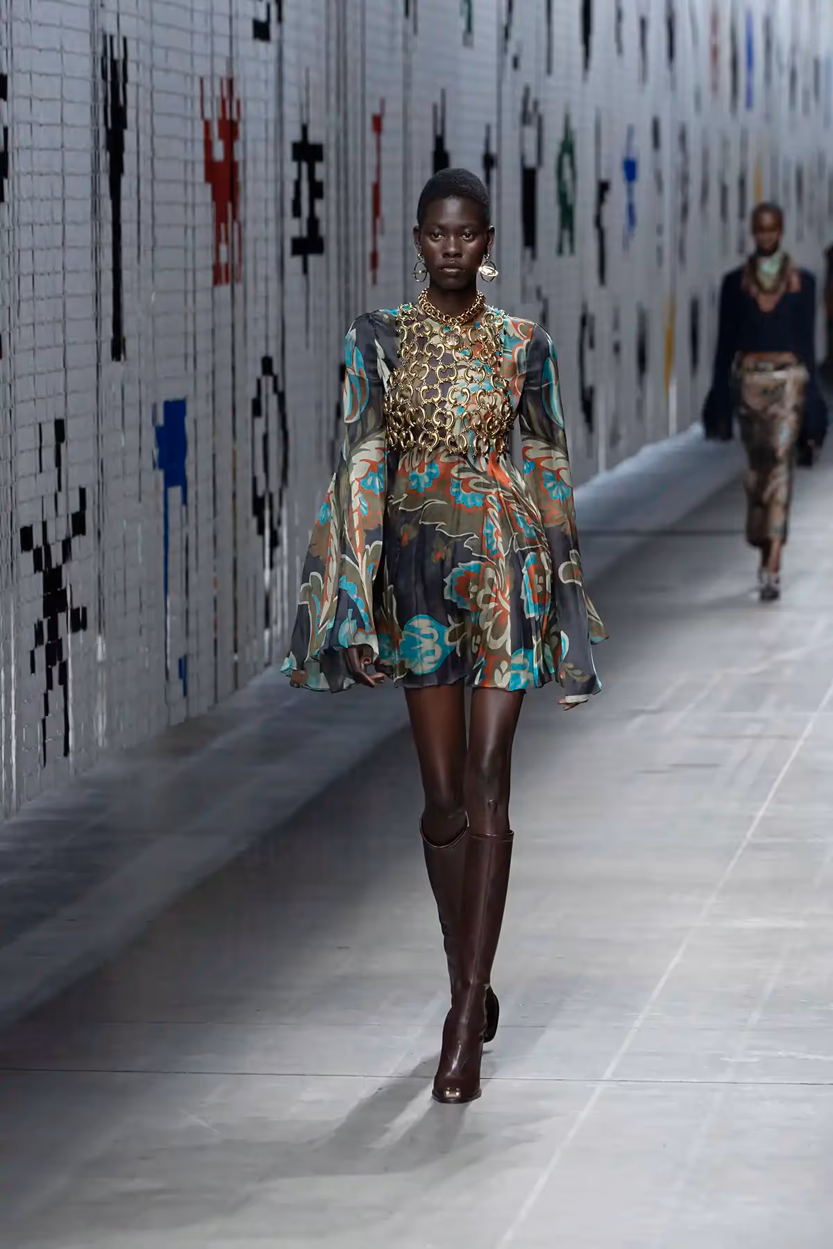 في هذا الموسم، يستكشف ماركو دي فينتشنزو المادة الخام والبدائية، حيث يستوحي المجموعة من جوهر النسيج نفسه، ليجعله ملموسًا وكثيفًا ومليئًا بالطبقات المتراكبة، حيث تتحول حتى الطبعات إلى طلاء، أو مطاطية، أو تطريز يندمج مع النسيج الأساسي. تتحرك الخطوط بانسيابية حول الجسد، فتحدد ملامحه وتداعبه، ثم تتسع بأشكال قصيرة أو طويلة، غير متناظرة، مع تفاصيل مزينة بالشراريب.