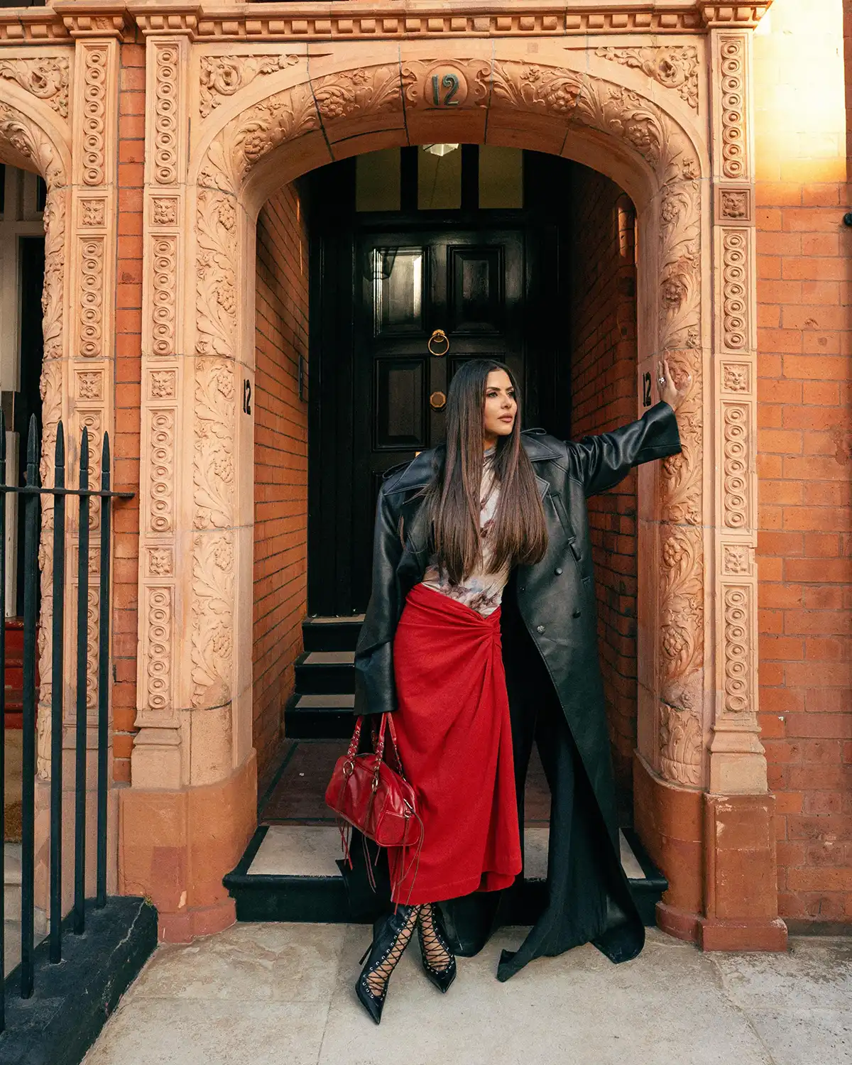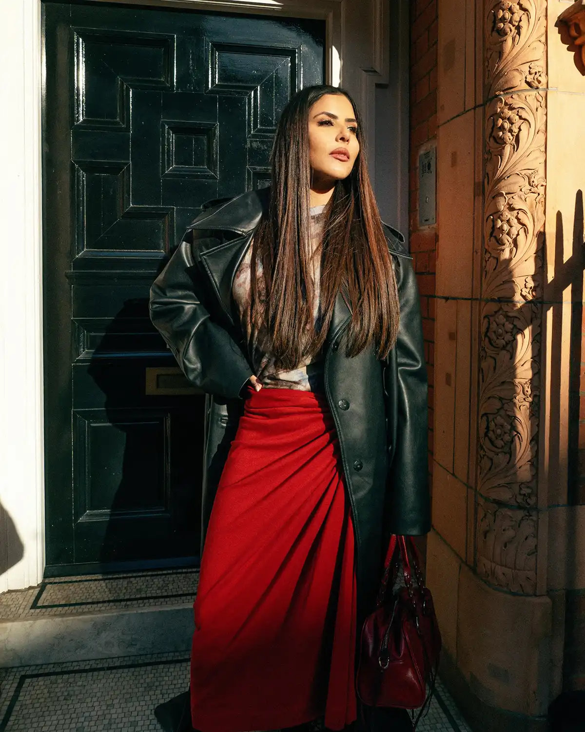 سترة جلدية مصممة بشكل مثالي وبنطال جينز من فيكتوريا بيكهام. معًا، يضيفان لمسة خالدة، أنيقتان، وتعكسان شخصيتي بسهولة.