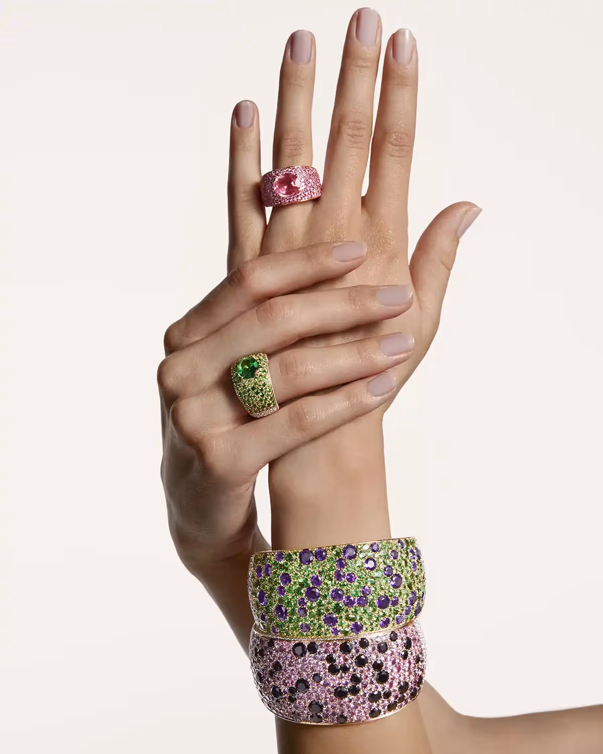 بريشوس بافيه - تستعرض علامة بوميلاتو تفنّنها في الترصيع المتراصّ في هذه المجموعة من الأساور والخواتم والأقراط، حيث يتم ترصيع كل حجر بدقة ونعومة لا نظير لهما. وإذا بها تقدّم سواراً مصنوعاً من الذهب الوردي مرصّعاً بـ1145 حجراً من الألماس الأبيض مع 460 حجر ألماس بنّي اللون. ويُستكمل السوار مع حزام مرصّع بالألماس الأبيض والبني وزوج من الأقراط المصمّمة على شكل سلاسل. وللمسة لونية نابضة بالحياة، تقدم بوميلاتو مجموعة من الأساور بنقشة جلد الفهد مزينة بـ247 حجراً من الصفير الزهري و44 حجراً من التورمالين الأسود، وتحيط بها حواف مرصّعة بالألماس الأبيض. هذا وتأتي مع خاتم متناسق معها مزدان بحجر إسبنيل زهري عيار 4.89 قيراطاً. أمّا السوار الأخضر، فيحتضن 165 حجر تسافوريت و44 حجر جمشت فضلاً عن باقة من أحجار الألماس الأبيض المتراصّة. وتترافق هذه القطع مع خاتم يتباهى بحجر تسافوريت عيار 3.45 قيراطاً.