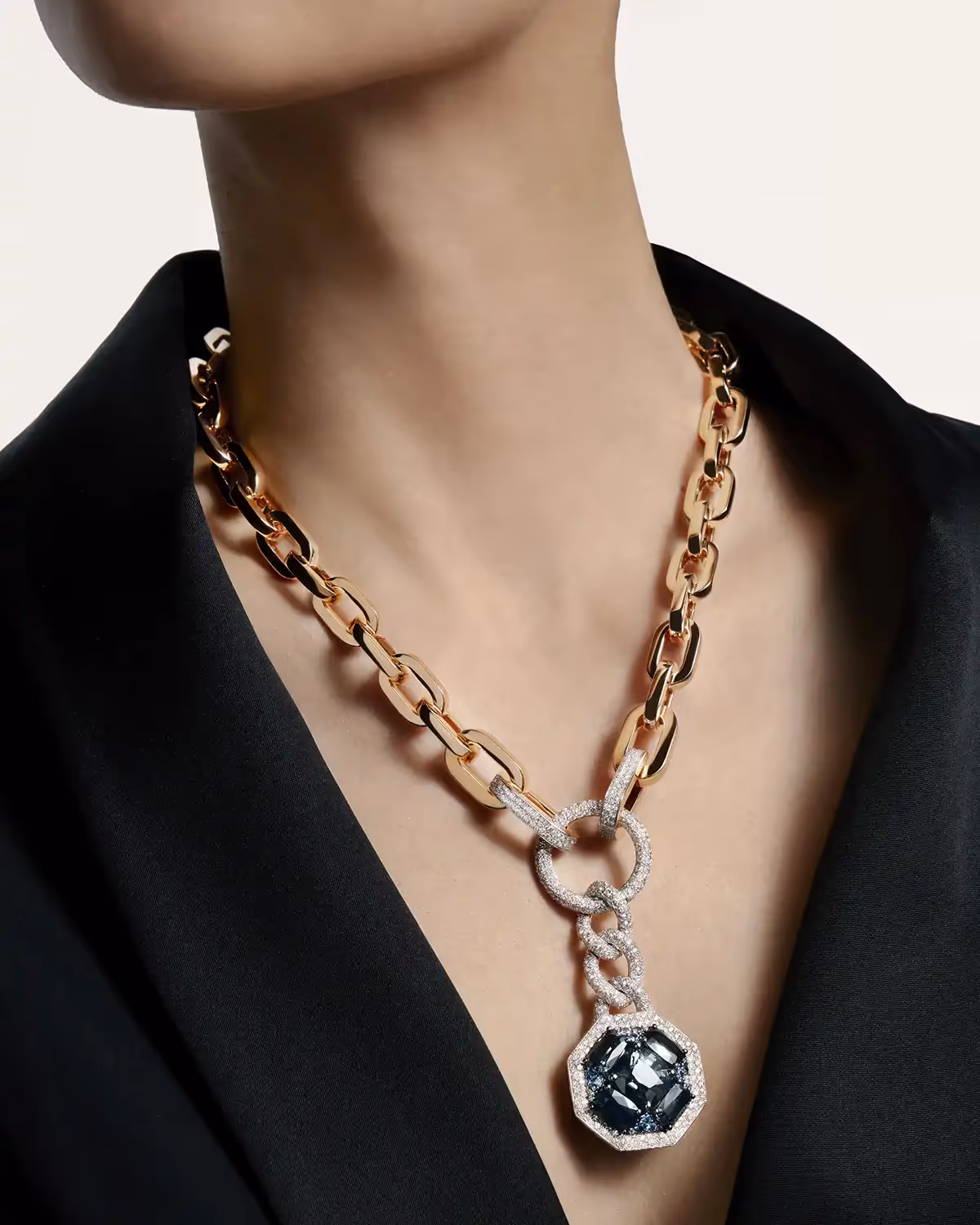 غرين تورمالين - في قلادة شوكر فاخرة واحدة، تجتمع ثلاثة أحجار من التورمالين الأخضر، يبلغ عيارها الإجمالي 52.46 قيراطاً. وغمرت العلامة حجر التورمالين بـ1768 حجر ألماس لترتقي بلونه الأخضر الملائكي إلى آفاق جديدة، فيتلاقى التورمالين بتقطيعه غير المنتظم مع السلاسل المرصّعة بالألماس ترصيعاً فائق الدقة ليخلق تبايناً يخطف الأنفاس. وتكملةً لهذه المجموعة، صمّمت العلامة خاتماً فاخراً من الذهب الوردي مرصّعاً بأحجار الألماس والتورمالين الأخضر عيار 10.77 قيراطاً. زِد على ذلك الأقراط المبتكرة على شكل سلاسل التي تتألّق بأحجار ألماس بيضاء وأربعة أحجار من التورمالين الأخضر العاكس للضوء.