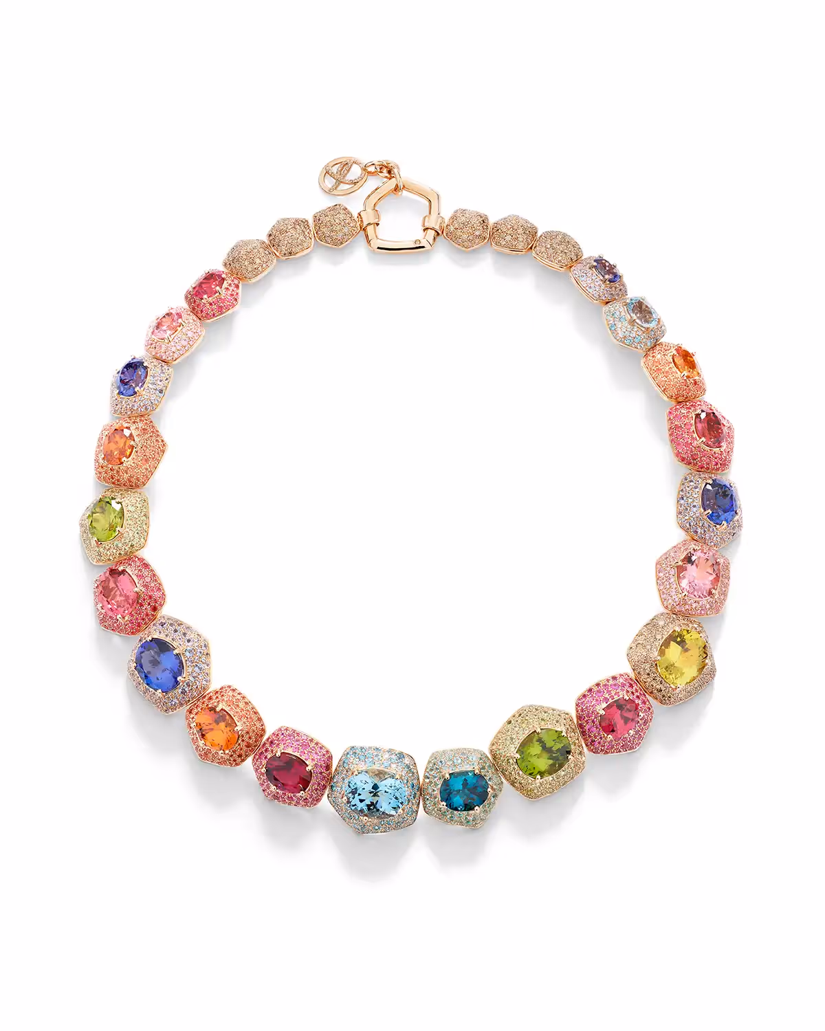 جيم سوبيرلاتيف - فسيفساء من الألوان تتراقص في هذه القلادة حيث يتكشّف إبداع صائغها وإتقانه. وتتباهى هذه القلادة بنمط "الحجر داخل الحجر"، فتصطفّ فيها لوحة نابضة بالحياة من الأحجار الكريمة البيضاوية في تركيبة فريدة من نوعها، منها التنزانيت، والعقيق البرتقالي، والزمرد الأزرق، والإسبنيل الأحمر والزهري، والزبرجد، والتورمالين الأصفر، والإنديكوليت، والروبليت والمورغانيت، ويتمركز كل منها داخل إطاره الخاص من الترصيع المتراصّ. كما تحيط أحجار الياقوت والصفير والعقيق والإسبنيل والتنزانيت والزركون والروبليت وتورمالين بارايبا بالأحجار المركزية، لترسم هالات متناغمة تزيد جمال كلّ جوهرة وتألّقها. وتكتمل لوحة الألوان هذه بقطعتين مرصعتين بالألماس، أولهما خاتم ثلاثي الرؤوس مرصّع بطبقة منقوشة من أحجار الألماس البنّية والبيضاء، فضلاً عن زوج من الأقراط المتناسقة معها.